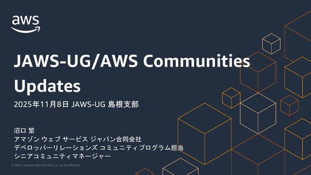 繁 アマゾン ウェブ サービス ジャパン合同会社 デベロッパーリレーションズ コミュニティプログラム担当 シニアコミュニティマネージャー JAWS-UG/AWS Communities Updates 2025年11月8日 JAWS-UG 島根支部