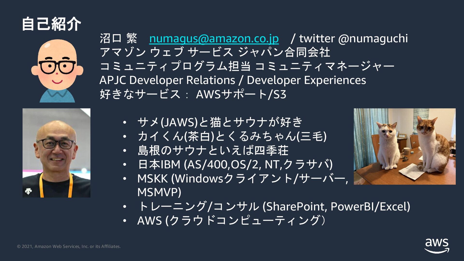 / twitter @numaguchi アマゾン ウェブ サービス ジャパン合同会社 コミュニティプログラム担当 コミュニティマネージャー APJC Developer Relations / Developer Experiences 好きなサービス: AWSサポート/S3 • サメ(JAWS)と猫とサウナが好き • カイくん(茶白)とくるみちゃん(三毛) • 島根のサウナといえば四季荘 • 日本IBM (AS/400,OS/2, NT,クラサバ) • MSKK (Windowsクライアント/サーバー, MSMVP) • トレーニング/コンサル (SharePoint, PowerBI/Excel) • AWS (クラウドコンピューティング)