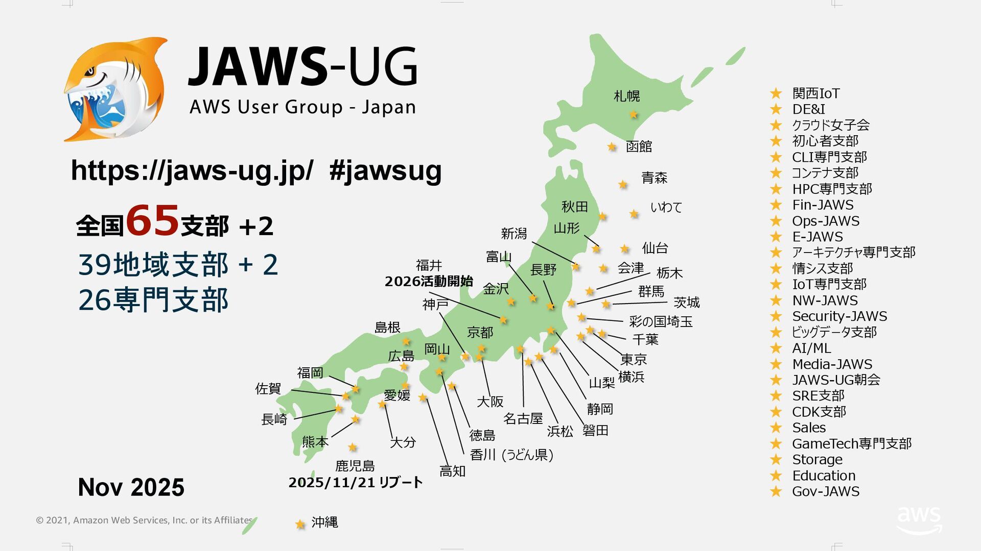 函館 青森 秋田 仙台 会津 群馬 栃木 千葉 東京 横浜 名古屋 大阪 徳島 香川 (うどん県) 高知 沖縄 熊本 長崎 佐賀 福岡 愛媛 大分 広島 島根 岡山 神戸 京都 金沢 富山 長野 新潟 山形 ★ ★ ★ ★ ★ ★ ★ ★ ★ ★ ★ ★ ★ ★ ★ ★ ★ ★ ★ ★ ★ ★ ★ ★ ★ ★ ★ ★ ★ ★ ★ ★ ★ ★ ★★ ★ いわて ★ https://jaws-ug.jp/ #jawsug 全国 65支部 +2 Nov 2025 ★ 関西IoT ★ DE&I ★ クラウド女子会 ★ 初心者支部 ★ CLI専門支部 ★ コンテナ支部 ★ HPC専門支部 ★ Fin-JAWS ★ Ops-JAWS ★ E-JAWS ★ アーキテクチャ専門支部 ★ 情シス支部 ★ IoT専門支部 ★ NW-JAWS ★ Security-JAWS ★ ビッグデータ支部 ★ AI/ML ★ Media-JAWS ★ JAWS-UG朝会 ★ SRE支部 ★ CDK支部 ★ Sales ★ GameTech専門支部 ★ Storage ★ Education ★ Gov-JAWS 磐田 浜松 静岡 茨城 ★ 山梨 39地域支部 + 2 26専門支部 ★ 彩の国埼玉 鹿児島 2025/11/21 リブート ★ ★ 福井 2026活動開始