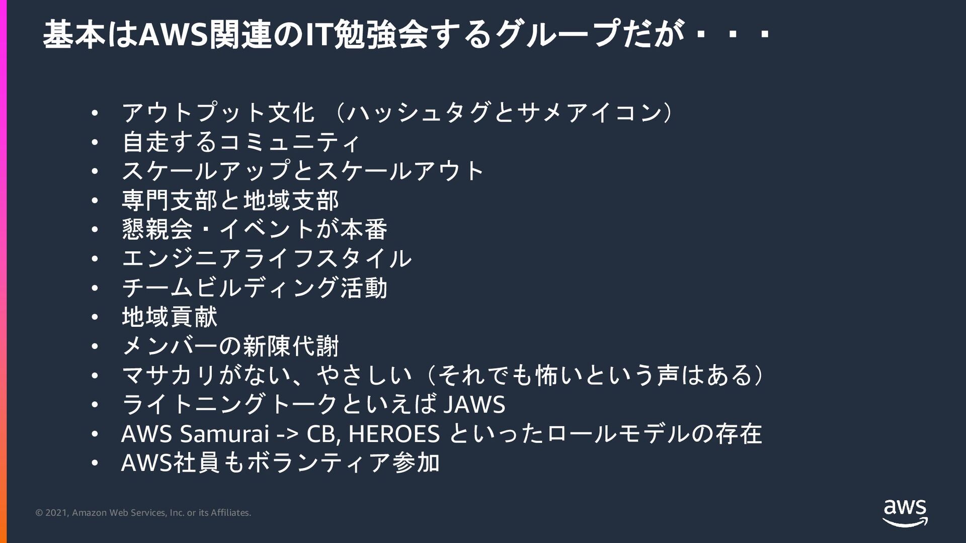 アウトプット文化 (ハッシュタグとサメアイコン) • 自走するコミュニティ • スケールアップとスケールアウト • 専門支部と地域支部 • 懇親会・イベントが本番 • エンジニアライフスタイル • チームビルディング活動 • 地域貢献 • メンバーの新陳代謝 • マサカリがない、やさしい(それでも怖いという声はある) • ライトニングトークといえば JAWS • AWS Samurai -> CB, HEROES といったロールモデルの存在 • AWS社員もボランティア参加 基本はAWS関連のIT勉強会するグループだが・・・