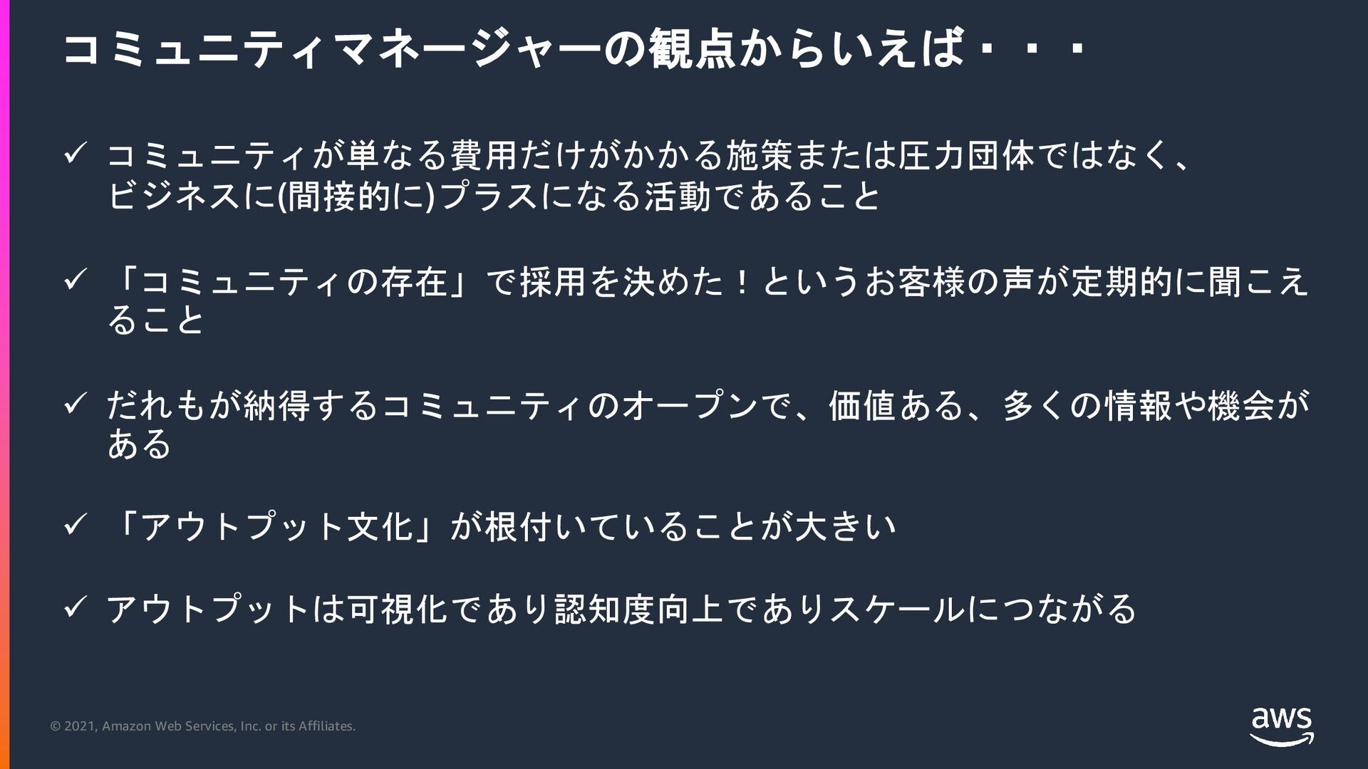 © 2021, Amazon Web Services, Inc. or its Affiliates. コミュニティマネージャーの観点からいえば・・・
