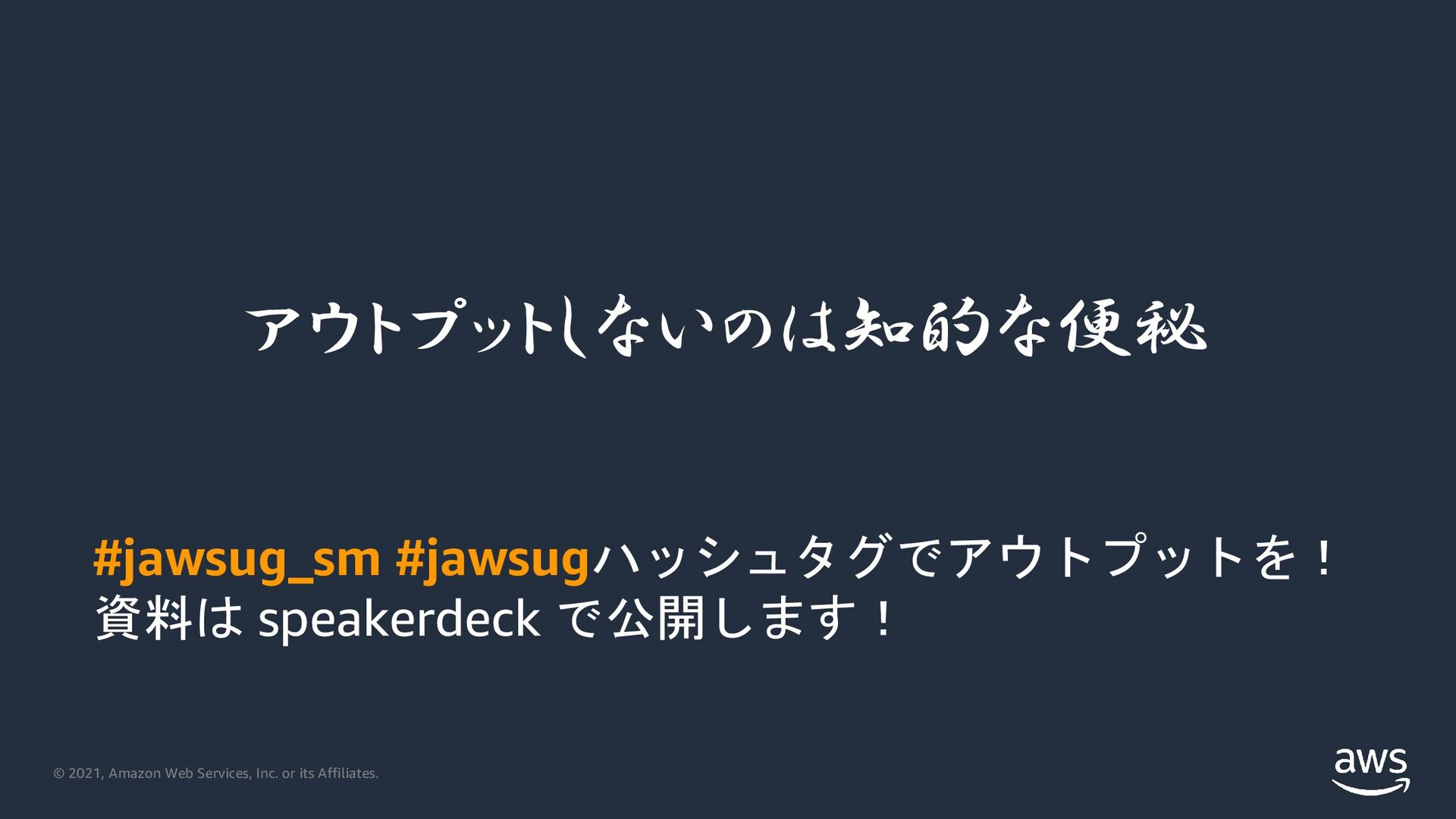 2021, Amazon Web Services, Inc. or its Affiliates. アウトプットしないのは知的な便秘 #jawsug_sm #jawsugハッシュタグでアウトプットを! 資料は speakerdeck で公開します!