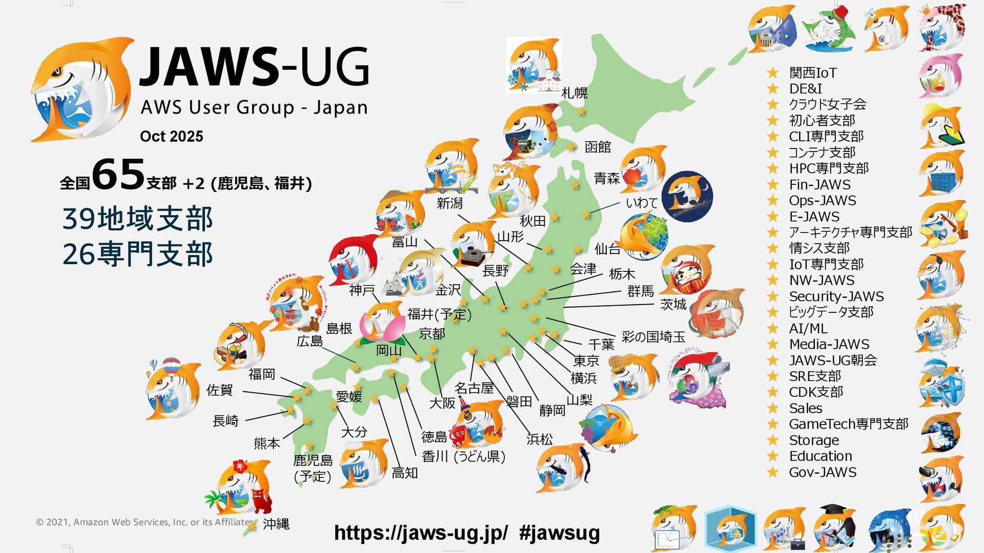 函館 青森 秋田 仙台 会津 群馬 栃木 千葉 東京 横浜 名古屋 大阪 徳島 香川 (うどん県) 高知 沖縄 熊本 長崎 佐賀 福岡 愛媛 大分 広島 島根 岡山 神戸 京都 金沢 富山 長野 新潟 山形 ★ ★ ★ ★ ★ ★ ★ ★ ★ ★ ★ ★ ★ ★ ★ ★ ★ ★ ★ ★ ★ ★ ★ ★ ★ ★ ★ ★ ★ ★ ★ ★ ★ ★ ★★ ★ いわて ★ https://jaws-ug.jp/ #jawsug 全国 65 支部 +2 (鹿児島、福井) Oct 2025 ★ 関西IoT ★ DE&I ★ クラウド女子会 ★ 初心者支部 ★ CLI専門支部 ★ コンテナ支部 ★ HPC専門支部 ★ Fin-JAWS ★ Ops-JAWS ★ E-JAWS ★ アーキテクチャ専門支部 ★ 情シス支部 ★ IoT専門支部 ★ NW-JAWS ★ Security-JAWS ★ ビッグデータ支部 ★ AI/ML ★ Media-JAWS ★ JAWS-UG朝会 ★ SRE支部 ★ CDK支部 ★ Sales ★ GameTech専門支部 ★ Storage ★ Education ★ Gov-JAWS 磐田 浜松 静岡 茨城 ★ 山梨 39地域支部 26専門支部 ★ 彩の国埼玉 ★ 鹿児島 (予定) ★ 福井(予定)