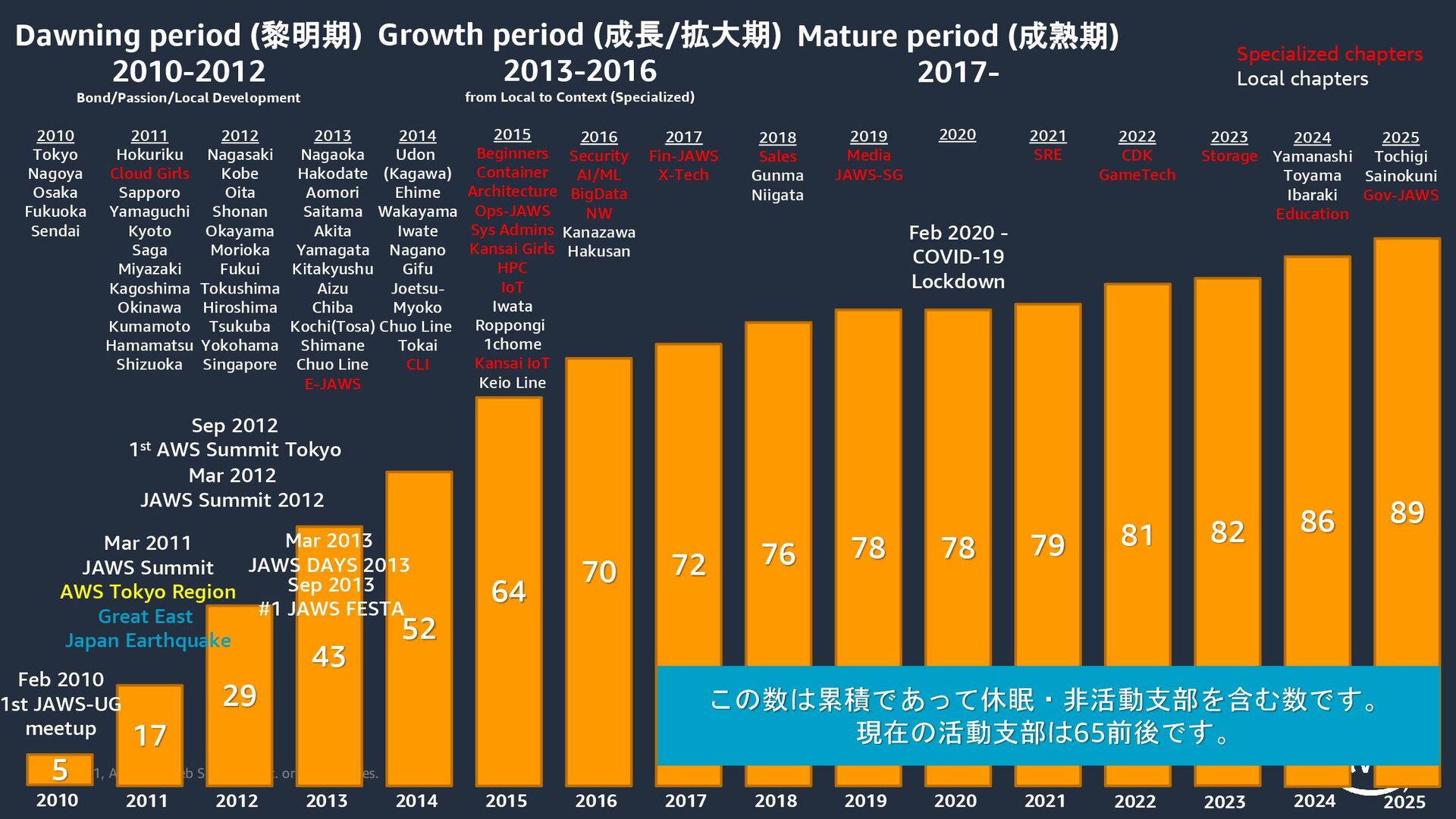 2021, Amazon Web Services, Inc. or its Affiliates. Dawning period (黎明期) 2010-2012 Bond/Passion/Local Development Growth period (成長/拡大期) 2013-2016 from Local to Context (Specialized) Mature period (成熟期) 2017- 5 17 29 43 52 64 70 72 76 2010 2011 2012 2013 2014 2015 2016 2017 2018 78 2019 Sep 2013 #1 JAWS FESTA 2015 Beginners Container Architecture Ops-JAWS Sys Admins Kansai Girls HPC IoT Iwata Roppongi 1chome Kansai IoT Keio Line 2016 Security AI/ML BigData NW Kanazawa Hakusan 2017 Fin-JAWS X-Tech 2019 Media JAWS-SG 2018 Sales Gunma Niigata 2010 Tokyo Nagoya Osaka Fukuoka Sendai 2011 Hokuriku Cloud Girls Sapporo Yamaguchi Kyoto Saga Miyazaki Kagoshima Okinawa Kumamoto Hamamatsu Shizuoka 2012 Nagasaki Kobe Oita Shonan Okayama Morioka Fukui Tokushima Hiroshima Tsukuba Yokohama Singapore 2013 Nagaoka Hakodate Aomori Saitama Akita Yamagata Kitakyushu Aizu Chiba Kochi(Tosa) Shimane Chuo Line E-JAWS 2014 Udon (Kagawa) Ehime Wakayama Iwate Nagano Gifu Joetsu- Myoko Chuo Line Tokai CLI Specialized chapters Local chapters 78 2020 Feb 2010 1st JAWS-UG meetup 2020 79 2021 2021 SRE Feb 2020 - COVID-19 Lockdown 2022 CDK GameTech 81 2022 82 2023 2023 Storage 86 2024 Yamanashi Toyama Ibaraki Education 2024 2025 89 2025 Tochigi Sainokuni Gov-JAWS Mar 2012 JAWS Summit 2012 Sep 2012 1st AWS Summit Tokyo この数は累積であって休眠・非活動支部を含む数です。 現在の活動支部は65前後です。 Mar 2011 JAWS Summit AWS Tokyo Region Great East Japan Earthquake Mar 2013 JAWS DAYS 2013