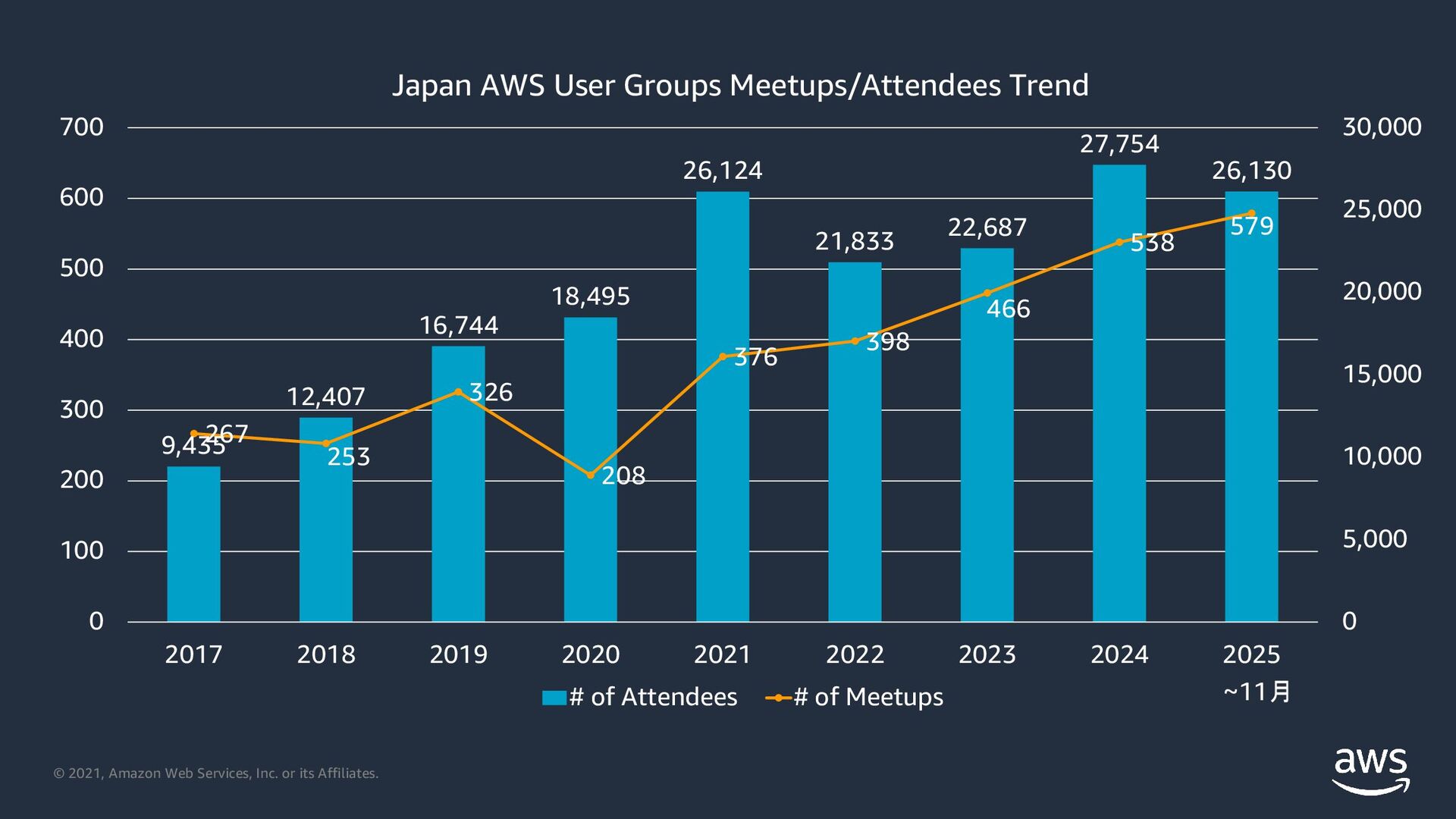 2021, Amazon Web Services, Inc. or its Affiliates. 9,435 12,407 16,744 18,495 26,124 21,833 22,687 27,754 26,130 267 253 326 208 376 398 466 538 579 0 5,000 10,000 15,000 20,000 25,000 30,000 0 100 200 300 400 500 600 700 2017 2018 2019 2020 2021 2022 2023 2024 2025 Japan AWS User Groups Meetups/Attendees Trend # of Attendees # of Meetups ~11月