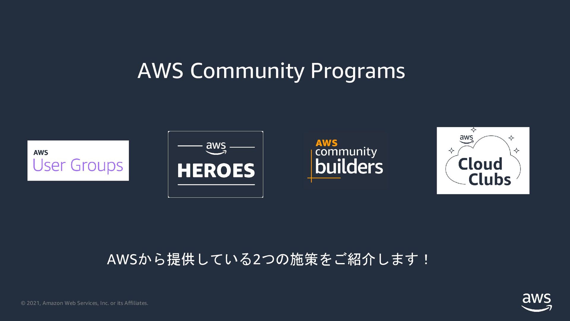 2021, Amazon Web Services, Inc. or its Affiliates. AWS Community Programs AWSから提供している2つの施策をご紹介します!