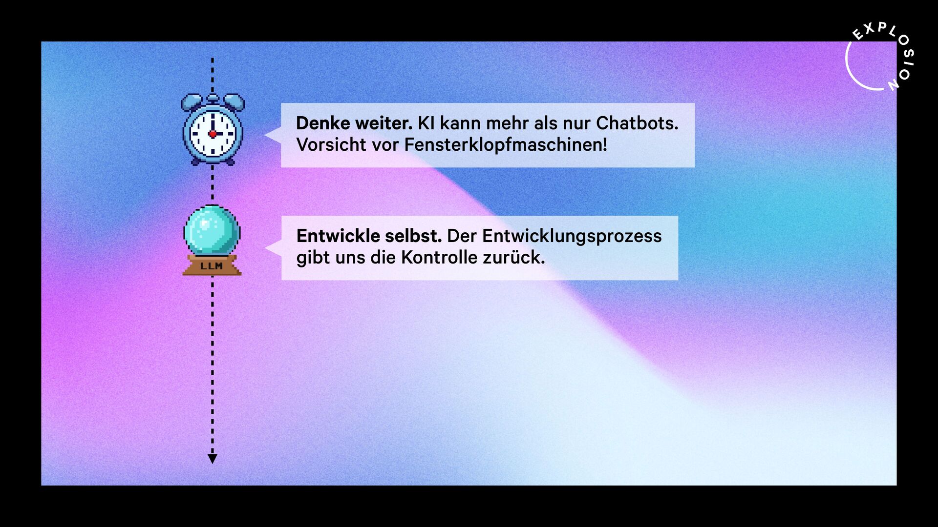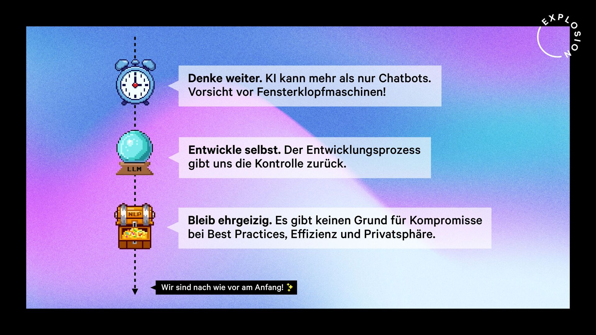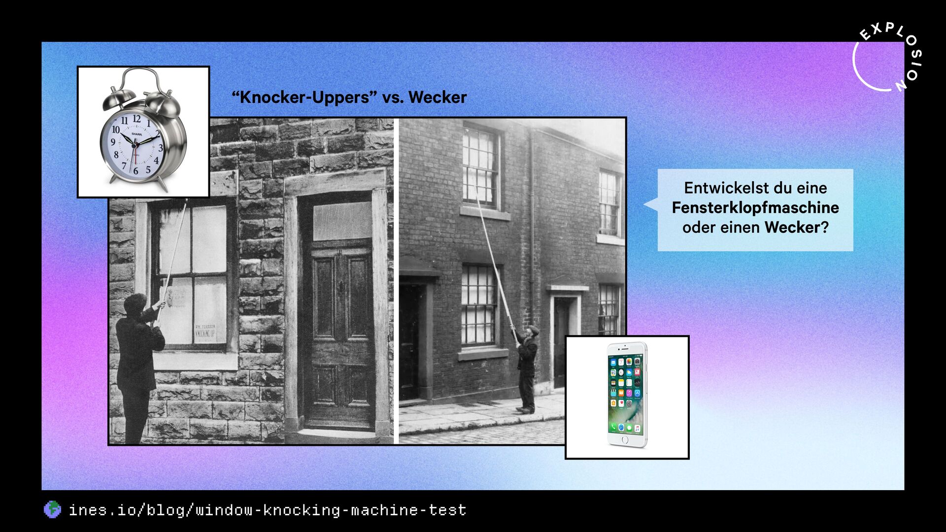 Wann immer wir also damit konfrontiert sind, eine menschliche Aufgabe mit Technologie zu lösen, sollten wir uns fragen: entwickele ich hier gerade eine Fensterklopfmaschine oder einen Wecker?