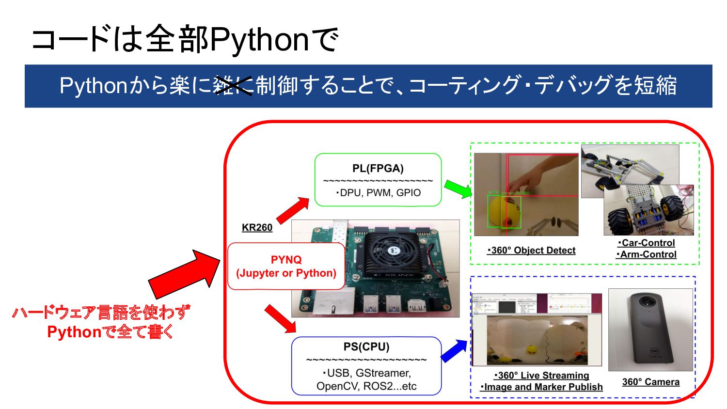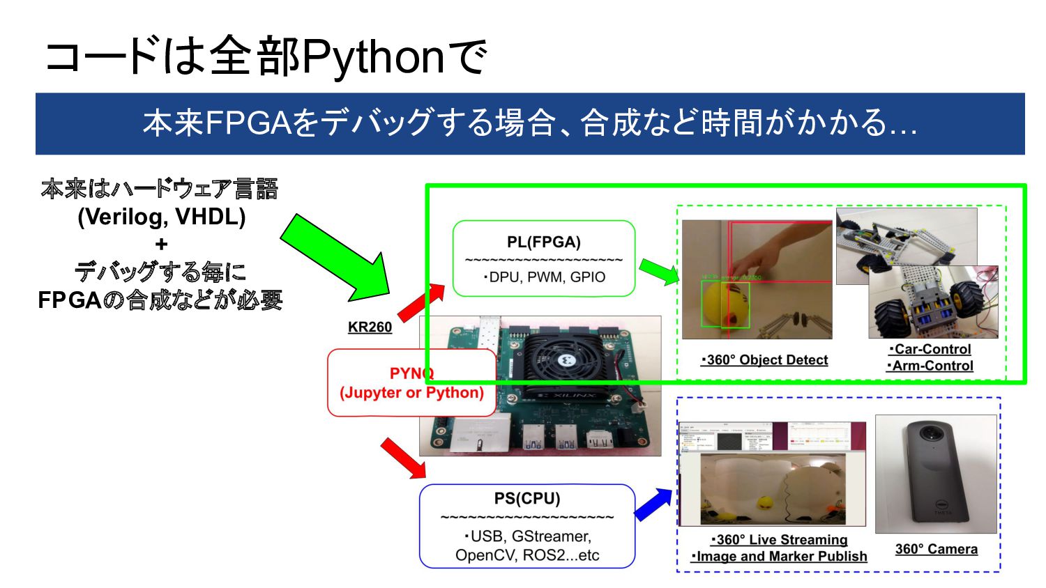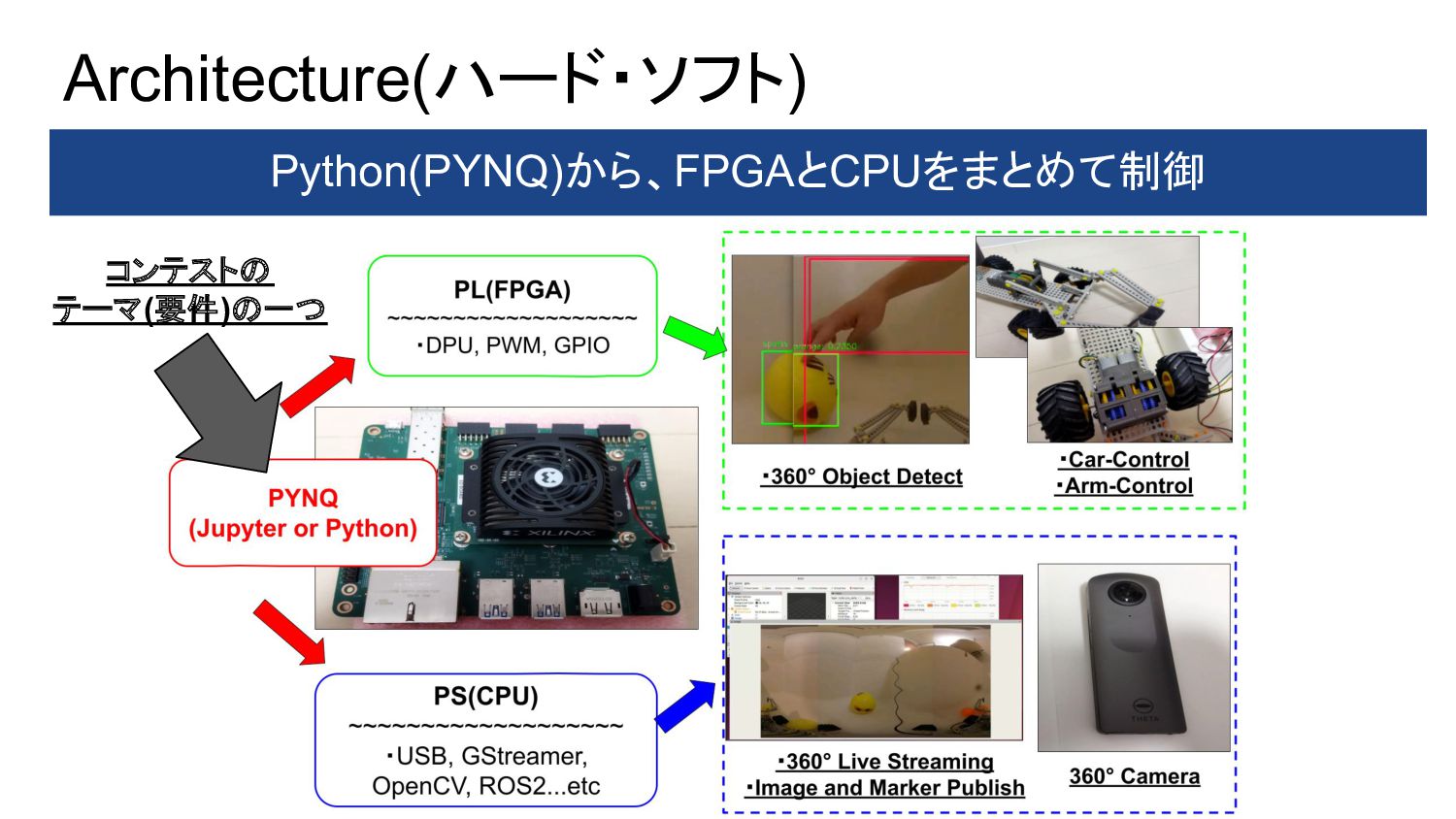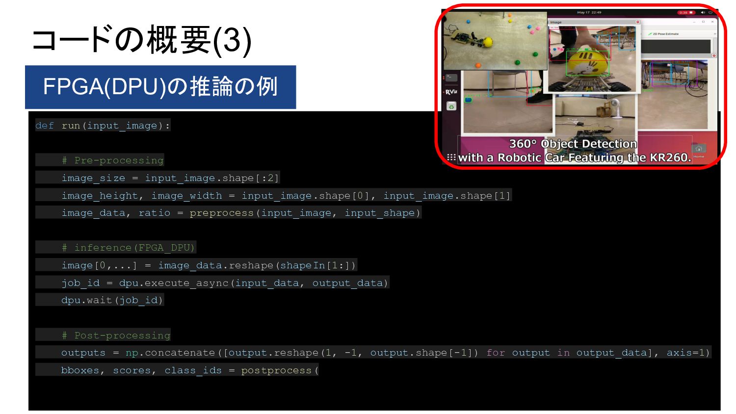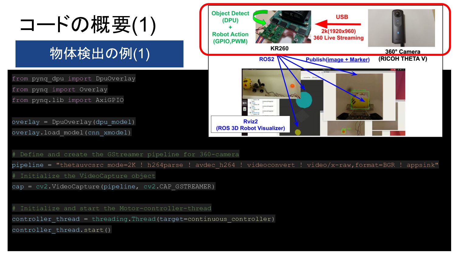 1. PYNQ + GPIO(LED Blinking) 2. PYNQ + PWM(DC-Motor Control) 3. Object Detection(Yolo) with DPU-PYNQ 4. Implementation DPU, GPIO, and PWM 5. Remote Control 360° Camera 6. GStreamer + OpenCV with 360°Camera 7. 360 Live Streaming + Object Detect(DPU) 8. ROS2 3D Marker from 360 Live Streaming 9. Control 360° Object Detection Robot Car 10. Improve Object Detection Speed with YOLOX 11. Benchmark Architectures of the DPU 12. Power Consumption of 360° Object Detection Robot Car 13. Application to Vitis AI ONNX Runtime Engine (VOE) 14. Appendix: Object Detection Using YOLOX with a Webcam 英語のドキュメント 日本語の下書き ⇒ ChatGPTで翻訳 ⇒ 修正 で対応しました