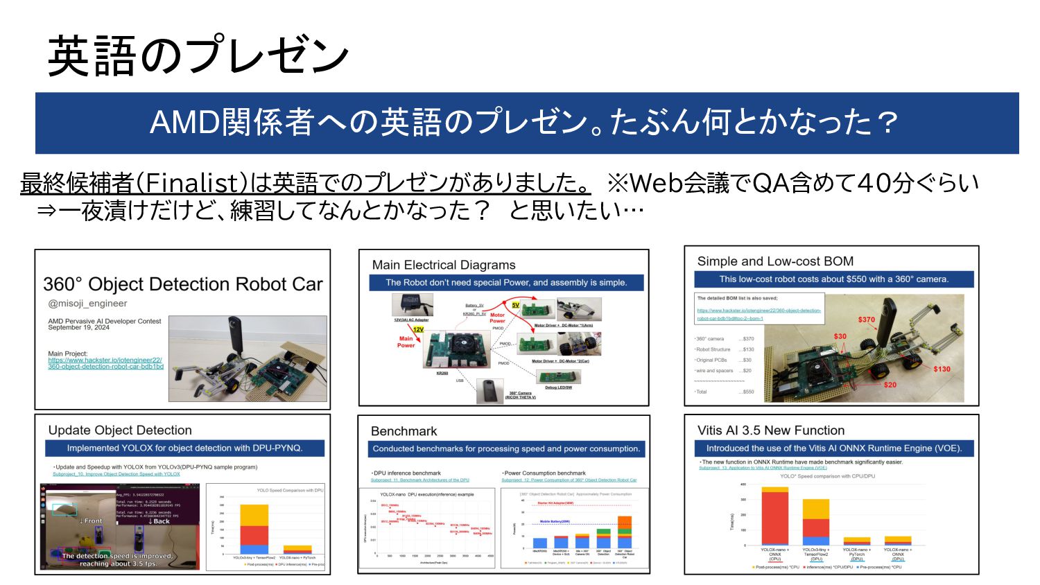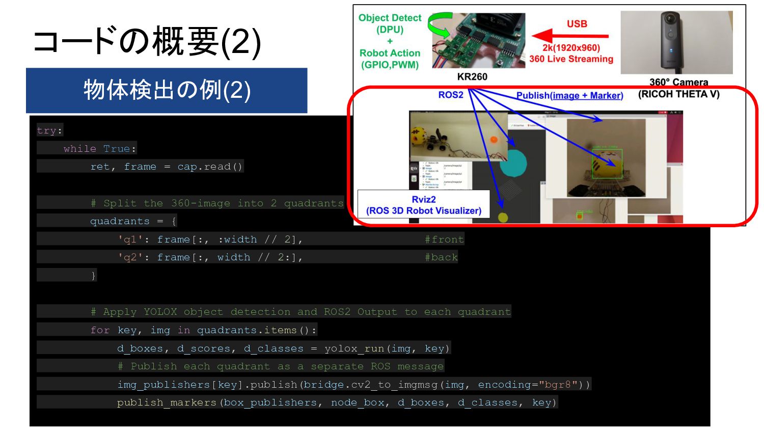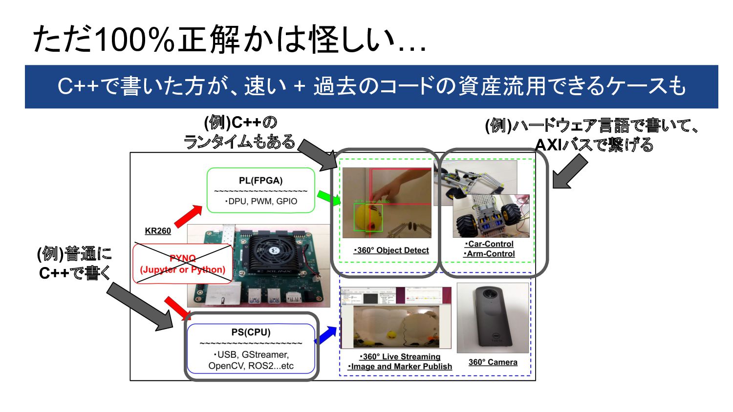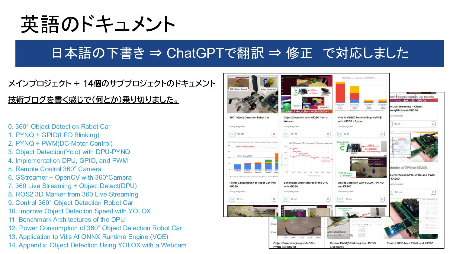 1. PYNQ + GPIO(LED Blinking) 2. PYNQ + PWM(DC-Motor Control) 3. Object Detection(Yolo) with DPU-PYNQ 4. Implementation DPU, GPIO, and PWM 5. Remote Control 360° Camera 6. GStreamer + OpenCV with 360°Camera 7. 360 Live Streaming + Object Detect(DPU) 8. ROS2 3D Marker from 360 Live Streaming 9. Control 360° Object Detection Robot Car 10. Improve Object Detection Speed with YOLOX 11. Benchmark Architectures of the DPU 12. Power Consumption of 360° Object Detection Robot Car 13. Application to Vitis AI ONNX Runtime Engine (VOE) 14. Appendix: Object Detection Using YOLOX with a Webcam 英語のドキュメント 日本語の下書き ⇒ ChatGPTで翻訳 ⇒ 修正 で対応しました