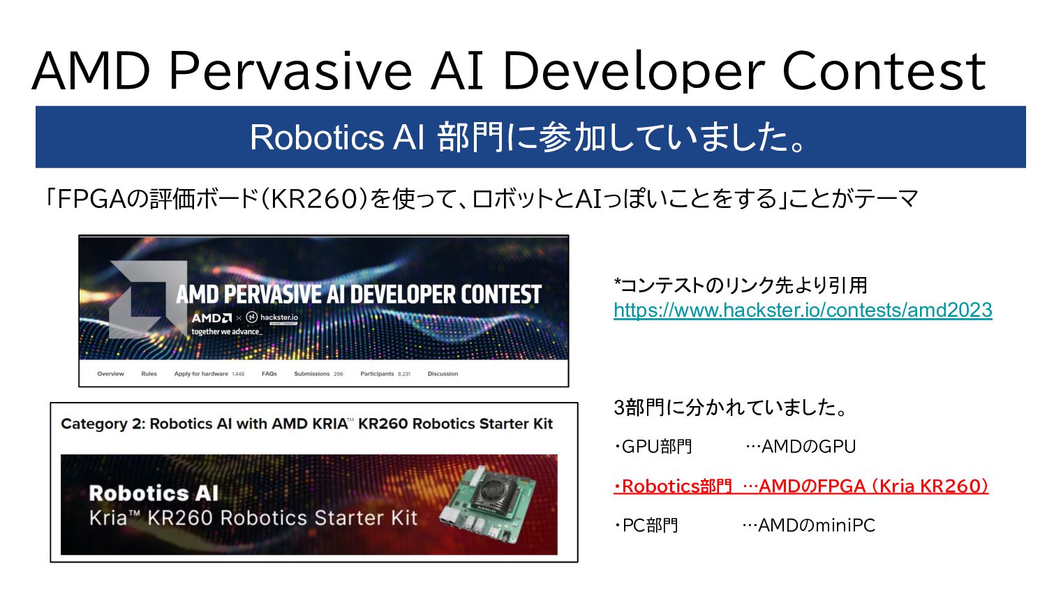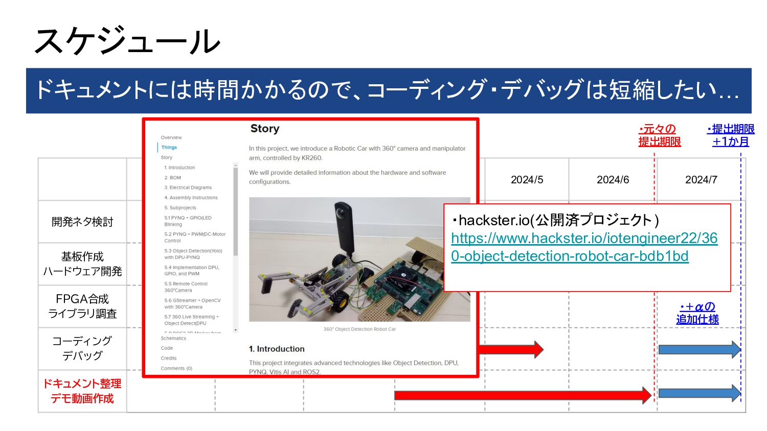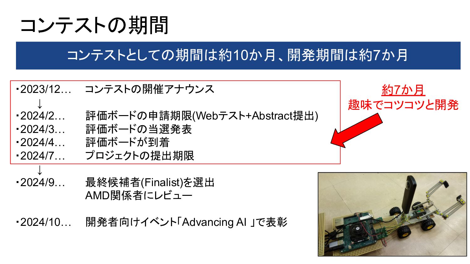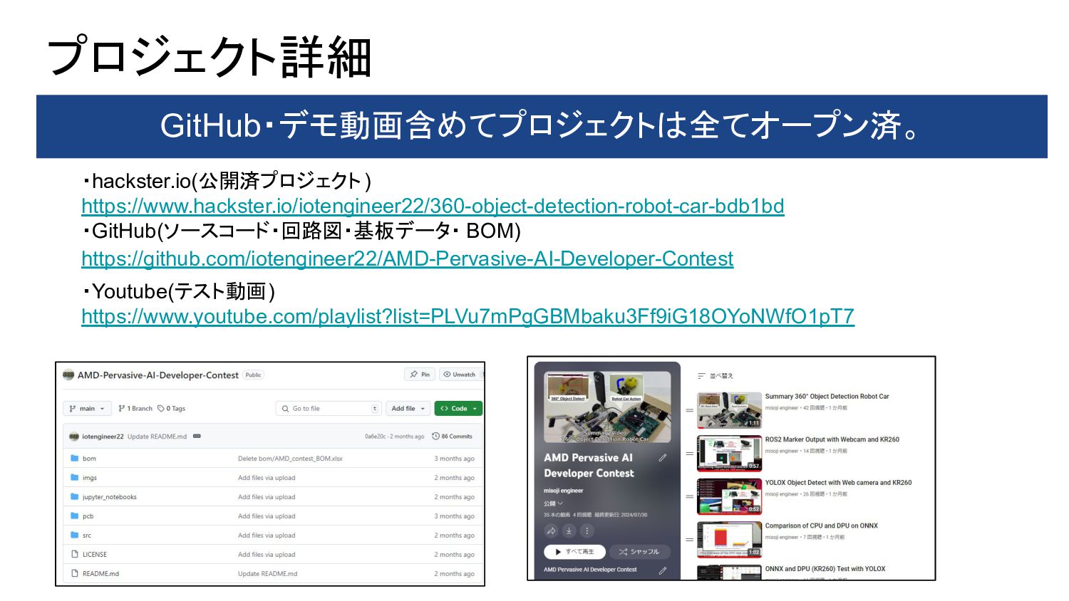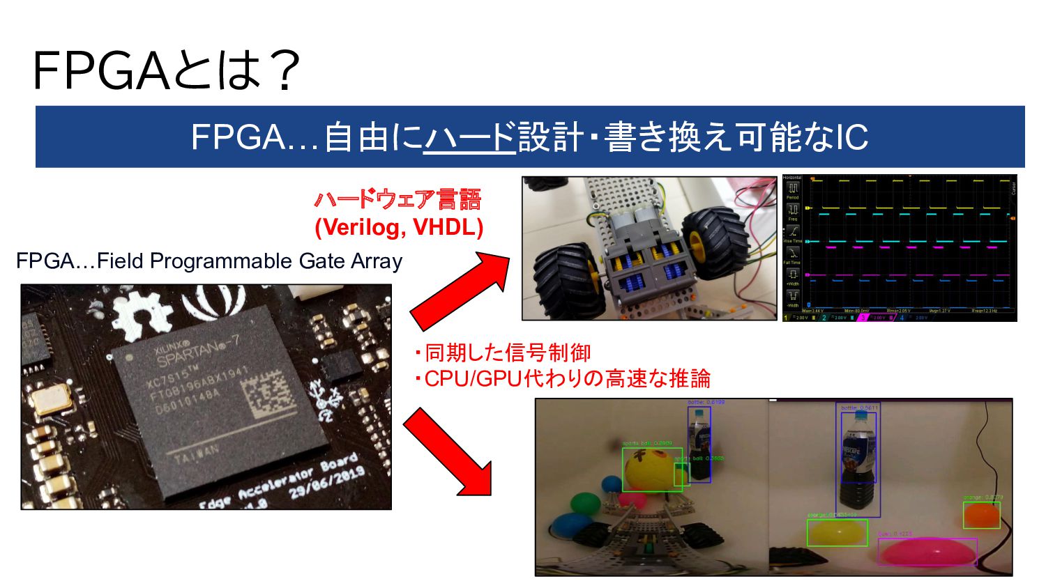 1. PYNQ + GPIO(LED Blinking) 2. PYNQ + PWM(DC-Motor Control) 3. Object Detection(Yolo) with DPU-PYNQ 4. Implementation DPU, GPIO, and PWM 5. Remote Control 360° Camera 6. GStreamer + OpenCV with 360°Camera 7. 360 Live Streaming + Object Detect(DPU) 8. ROS2 3D Marker from 360 Live Streaming 9. Control 360° Object Detection Robot Car 10. Improve Object Detection Speed with YOLOX 11. Benchmark Architectures of the DPU 12. Power Consumption of 360° Object Detection Robot Car 13. Application to Vitis AI ONNX Runtime Engine (VOE) 14. Appendix: Object Detection Using YOLOX with a Webcam 英語のドキュメント 日本語の下書き ⇒ ChatGPTで翻訳 ⇒ 修正 で対応しました