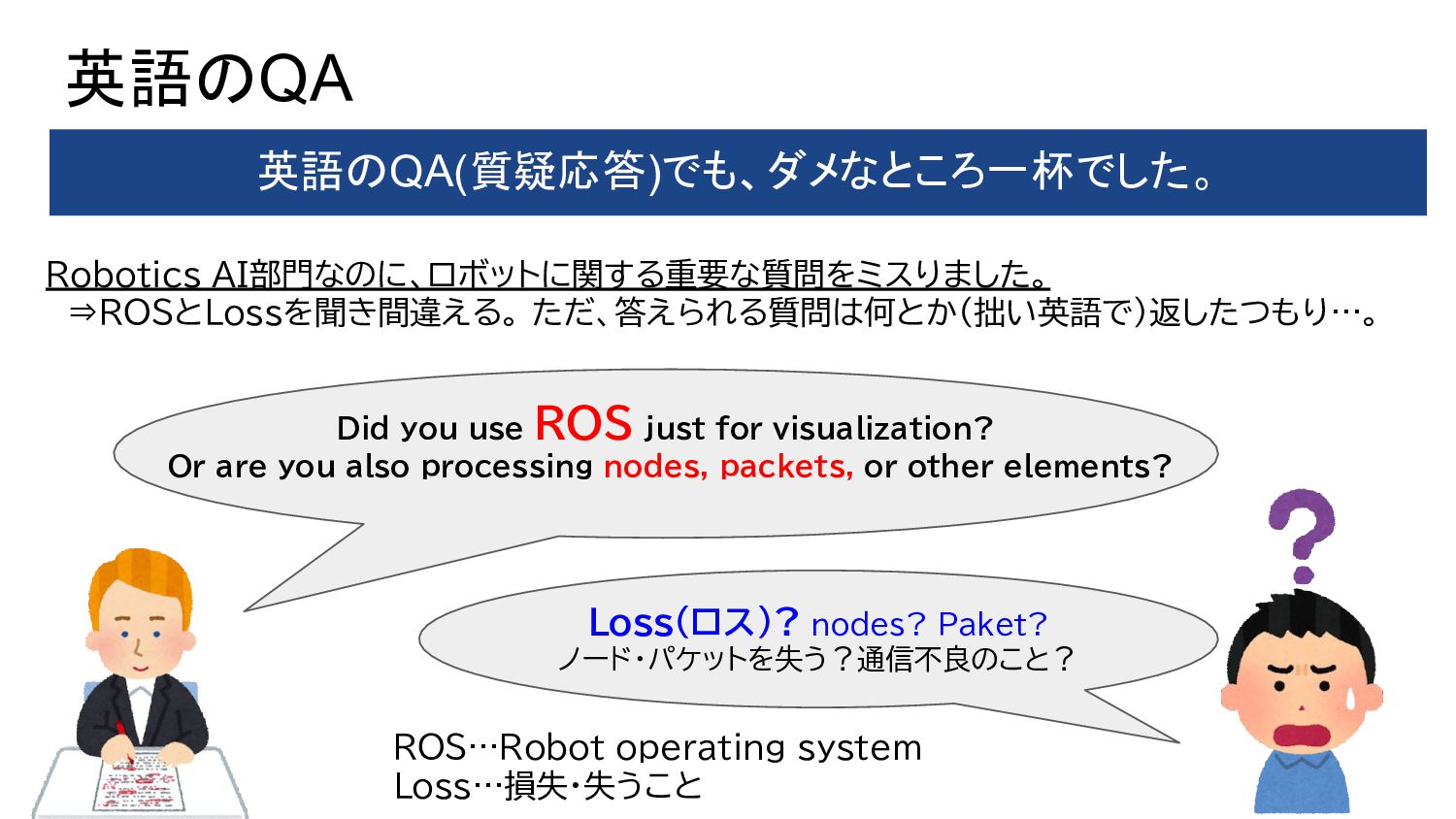 just for visualization? Or are you also processing nodes, packets, or other elements? Loss(ロス)? nodes? Paket? ノード・パケットを失う?通信不良のこと? ROS…Robot operating system Loss…損失・失うこと