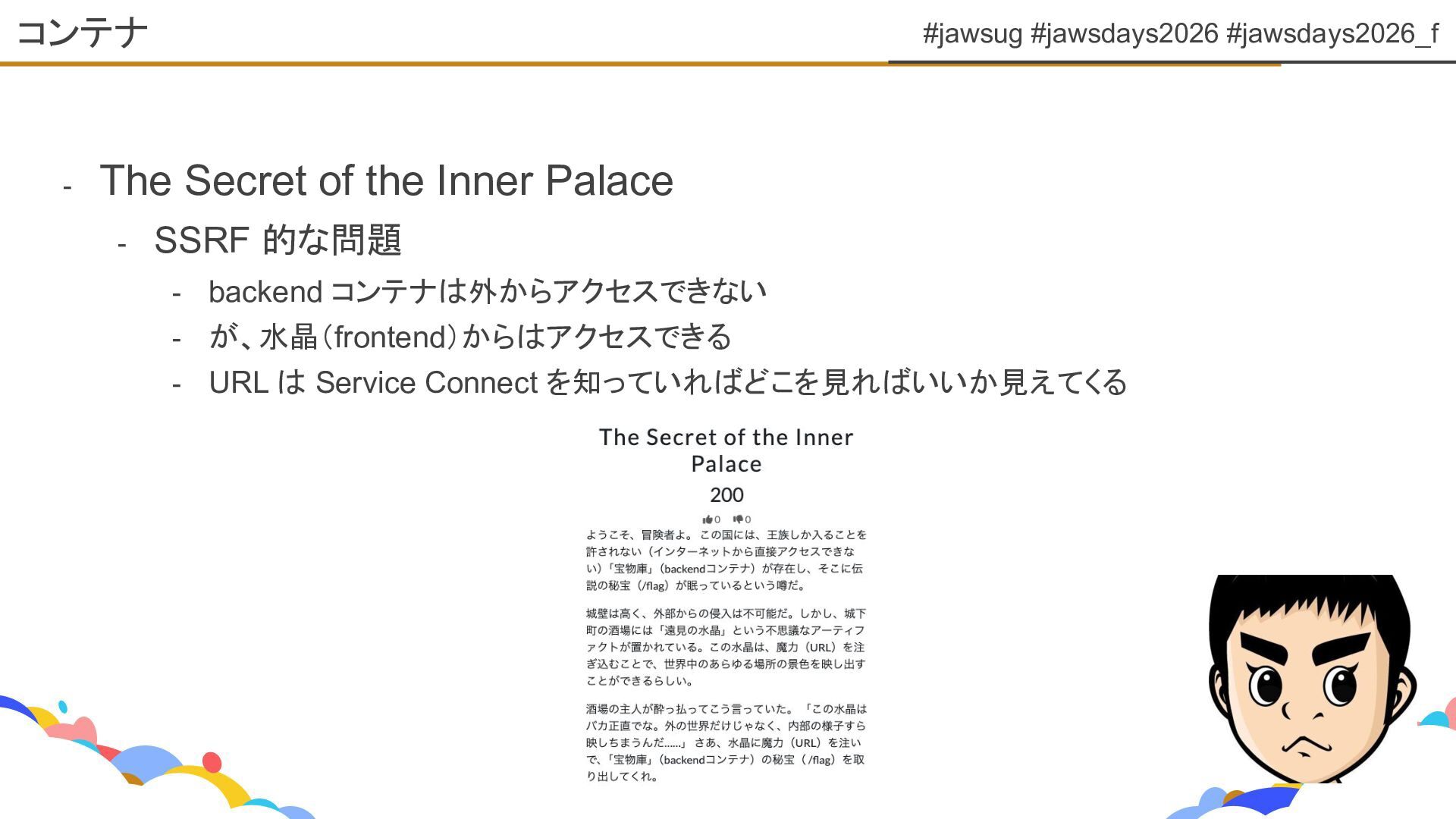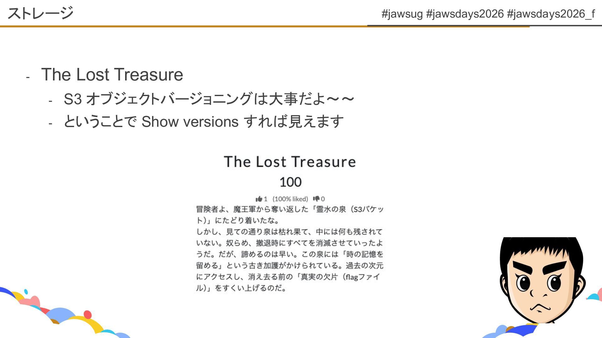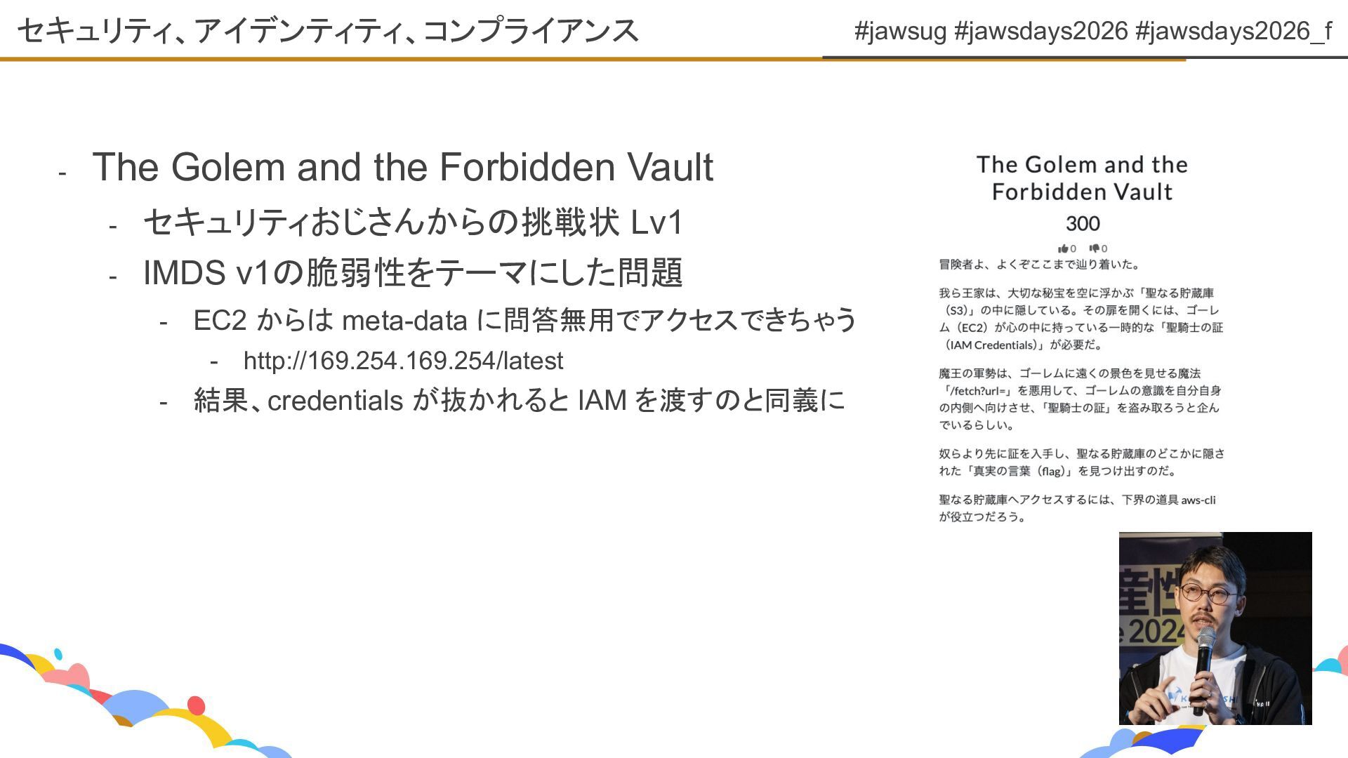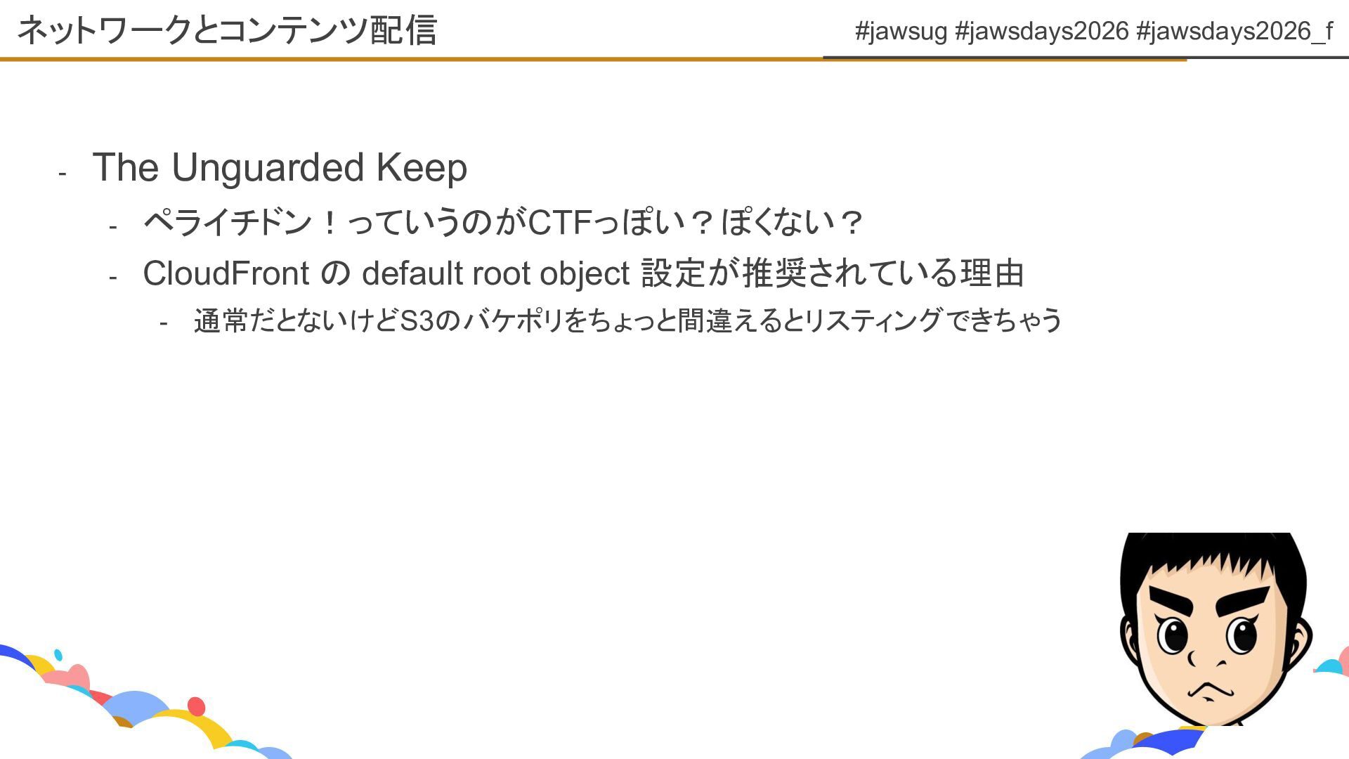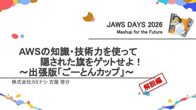 JAWS DAYS 2026 AWS知識・技術力を使って隠された旗をゲットせよ!〜出張版「ごーとんカップ」〜 解説編 https://fortee.jp/jawsdays-2026/proposal/1d8df953-5b5b-4d55-92e8-dc5a55ebaaa2