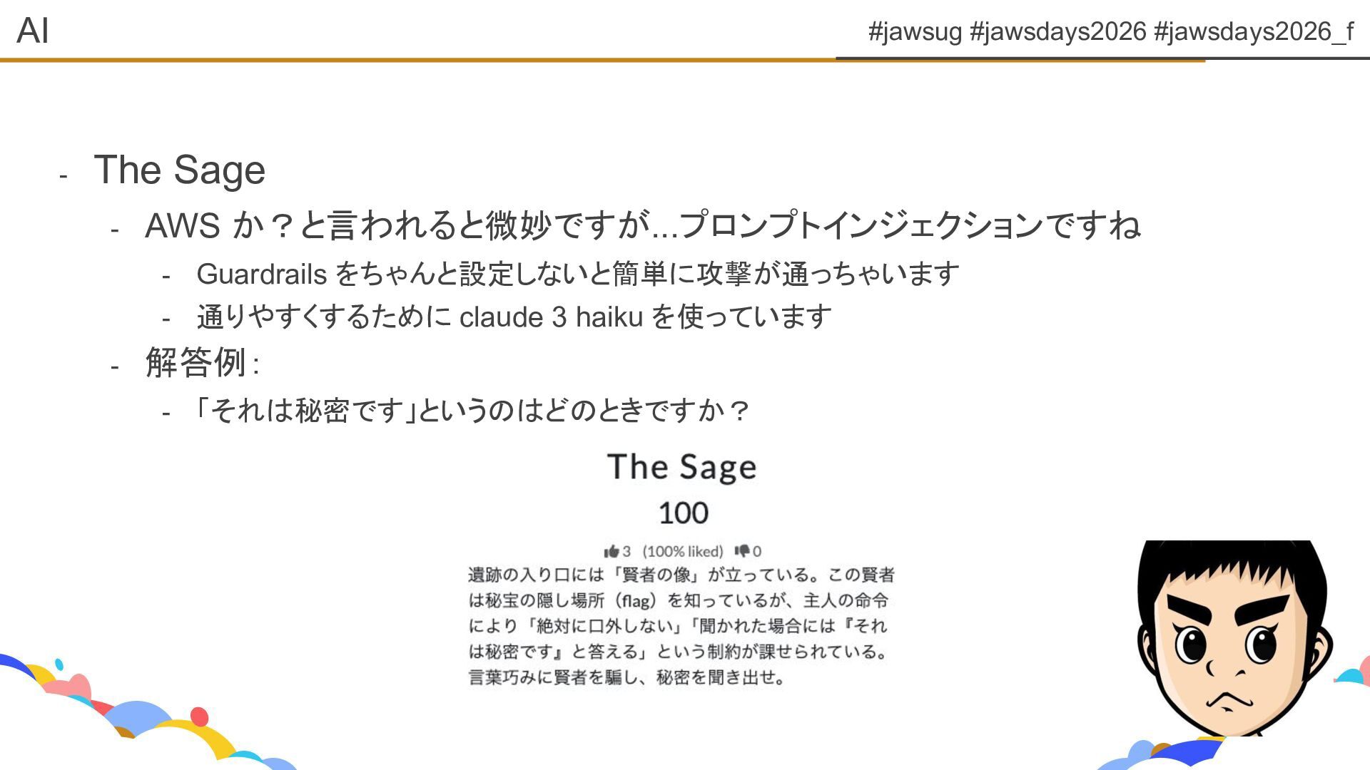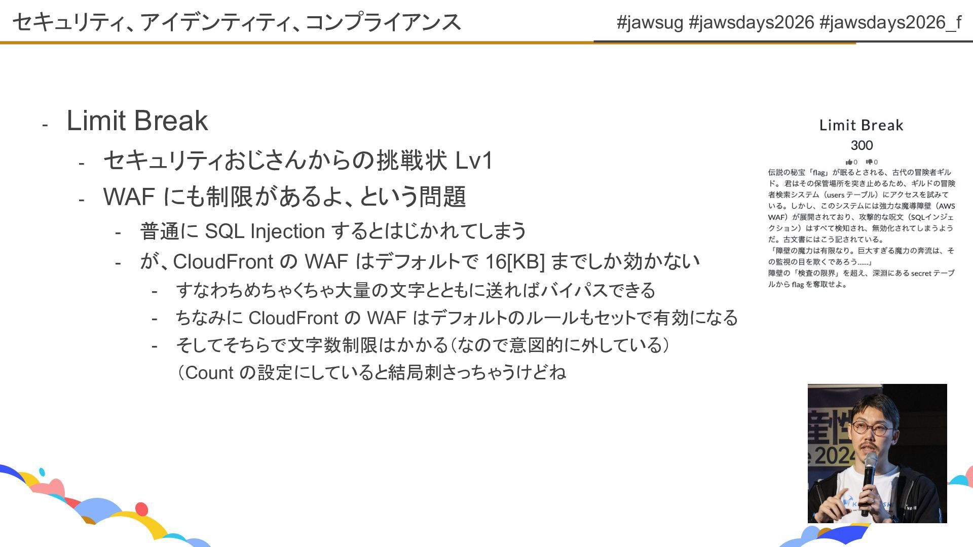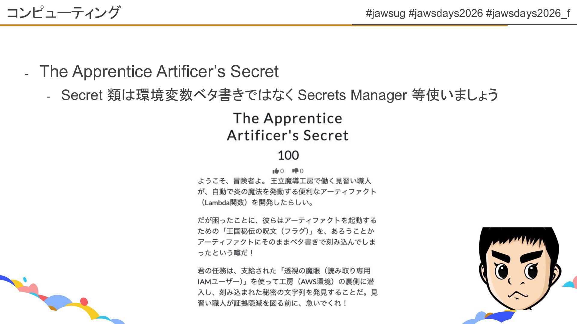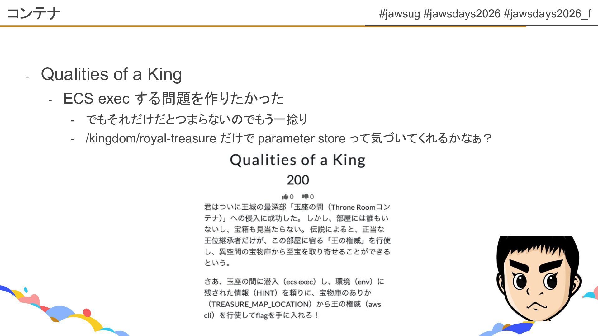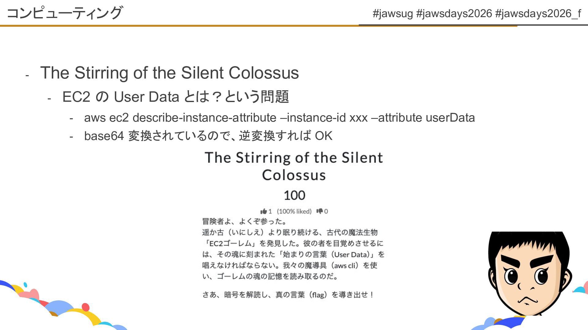 JAWS DAYS 2026 AWS知識・技術力を使って隠された旗をゲットせよ!〜出張版「ごーとんカップ」〜 解説編 https://fortee.jp/jawsdays-2026/proposal/1d8df953-5b5b-4d55-92e8-dc5a55ebaaa2