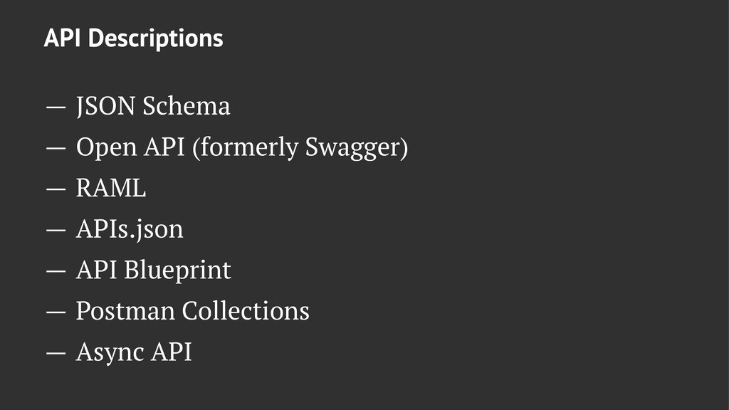 — RAML — APIs.json — API Blueprint — Postman Collections — Async API