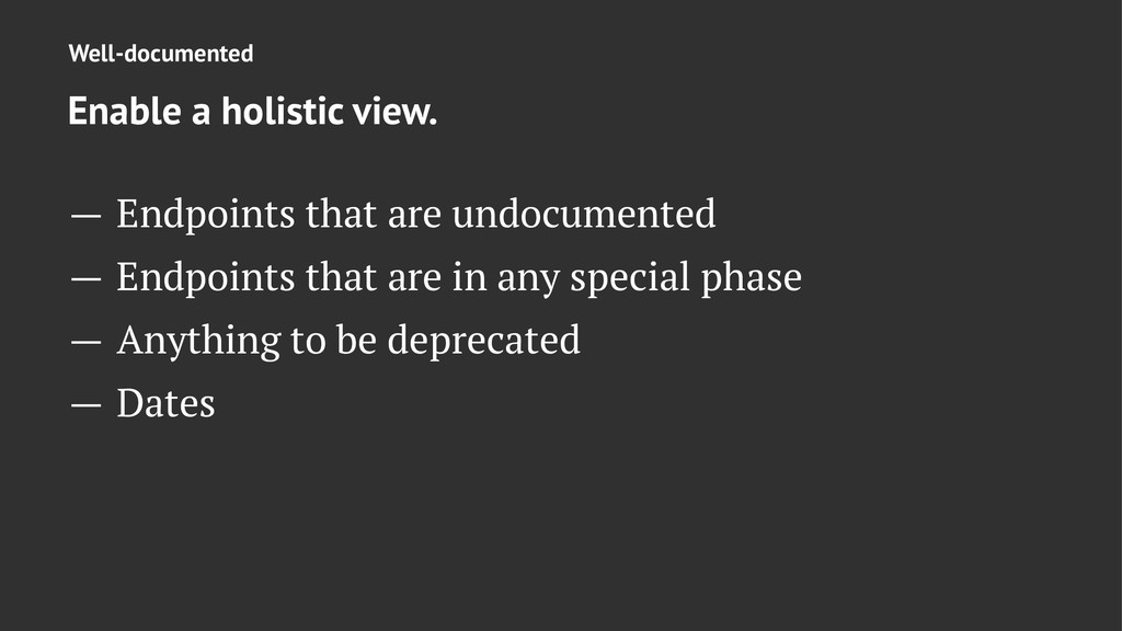 Well-documented Enable a holistic view. — Endpoints that are undocumented