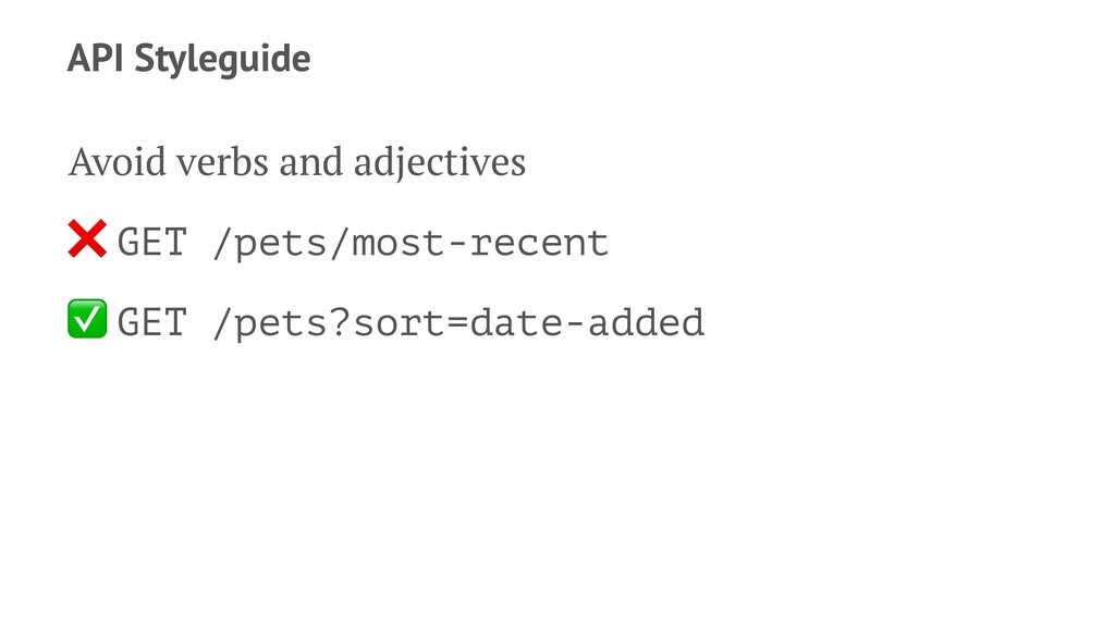 API Styleguide Avoid verbs and adjectives ❌ GET /pets/most-recent ✅