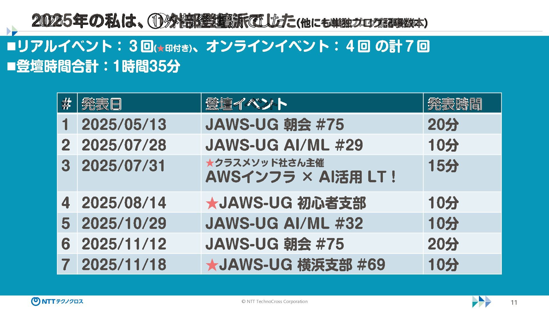 (★印付き ) 、オンラインイベント:4回 の計7回 ◼登壇時間合計: 1時間35 分 # 発表日 登壇イベント 発表時間 1 2025/05/13 JAWS -UG 朝会 #75 20 分 2 2025/07/28 JAWS -UG AI/ML #29 10 分 3 2025/07/31 ★クラスメソッド社さん主催 AWS インフラ × AI 活用 LT ! 15 分 4 2025/08/14 ★JAWS -UG 初心者支部 10 分 5 2025/10/29 JAWS -UG AI/ML #32 10 分 6 2025/11/12 JAWS -UG 朝会 #75 20 分 7 2025/11/18 ★JAWS -UG 横浜支部 #69 10 分