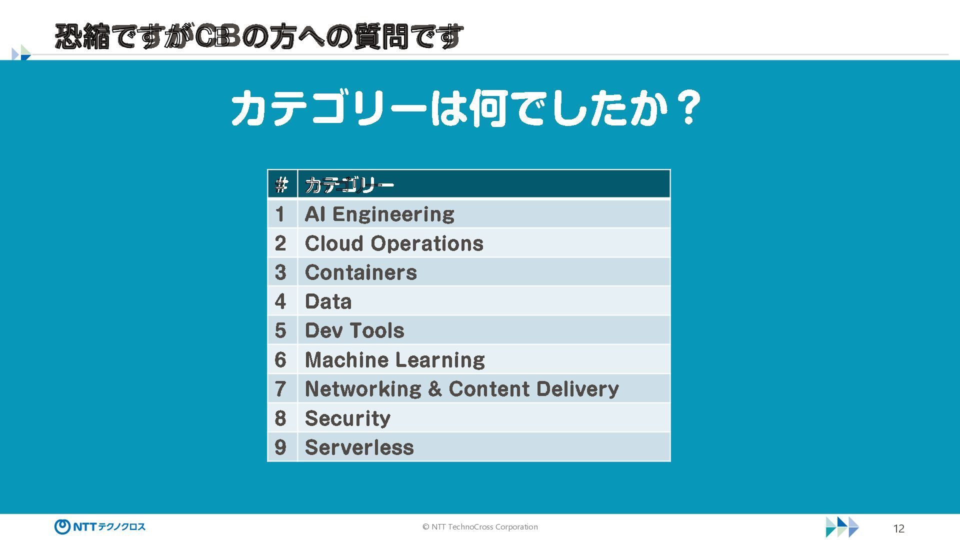 Engineering 2 Cloud Operations 3 Containers 4 Data 5 Dev Tools 6 Machine Learning 7 Networking & Content Delivery 8 Security 9 Serverless 恐縮ですがCB の方への質問です