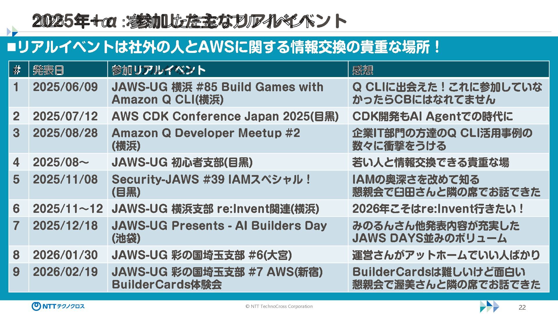 に関する情報交換の貴重な場所! # 発表日 参加リアルイベント 感想 1 2025/06/09 JAWS -UG 横浜 #85 Build Games with Amazon Q CLI( 横浜) Q CLI に出会えた!これに参加していな かったら CB にはなれてません 2 2025/07/12 AWS CDK Conference Japan 2025( 目黒) CDK 開発も AI Agent での時代に 3 2025/08/28 Amazon Q Developer Meetup #2 (横浜) 企業IT 部門の方達のQ CLI 活用事例の 数々に衝撃をうける 4 2025/08 ~ JAWS -UG 初心者支部(目黒) 若い人と情報交換できる貴重な場 5 2025/11/08 Security -JAWS #39 IAM スペシャル! (目黒) IAM の奥深さを改めて知る 懇親会で臼田さんと隣の席でお話できた 6 2025/11 ~12 JAWS -UG 横浜支部 re:Invent 関連(横浜) 2026 年こそは re:Invent 行きたい! 7 2025/12/18 JAWS -UG Presents - AI Builders Day (池袋) みのるんさん他発表内容が充実した JAWS DAYS 並みのボリューム 8 2026/01/30 JAWS -UG 彩の国埼玉支部 #6( 大宮) 運営さんがアットホームでいい人ばかり 9 2026/02/19 JAWS -UG 彩の国埼玉支部 #7 AWS( 新宿) BuilderCards 体験会 BuilderCards は難しいけど面白い 懇親会で渥美さんと隣の席でお話できた