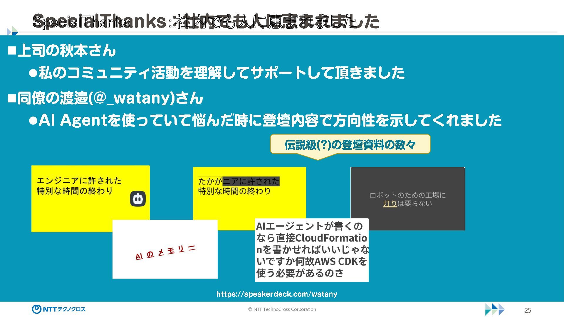 ) 2024 年活動実績 ー外部登壇: 1回(20 分) ーBlog 記事: 3本(4740+4771+4223View) ー社内勉強会: AWS ネタ 2回登壇(40 分+40 分) 今思うとあまりにも無謀でした。。。。 ◼2025 年1月15 日弊社AWS 絶対王watany さんから下々におふれが出ました ・ JAWS -UG 東京支部運営 ・ Community Builder ・ Japan AWS Ambassador ・ 社外でAgentic Coding 講師もしています ・ 技術本筆者(※5/2発番予定に延期)皆さん買いましょう w