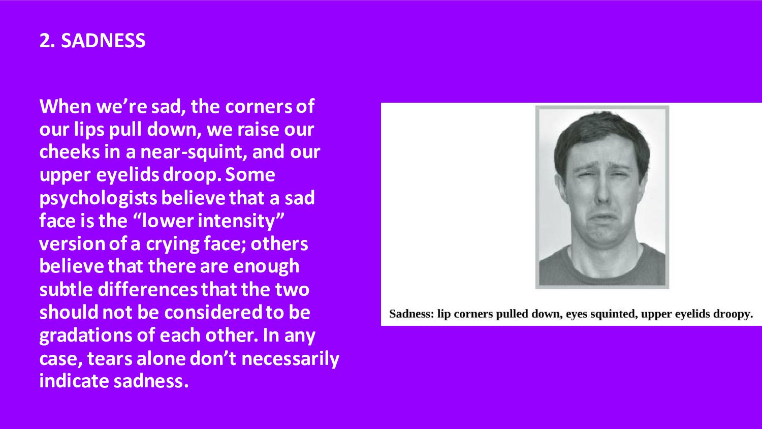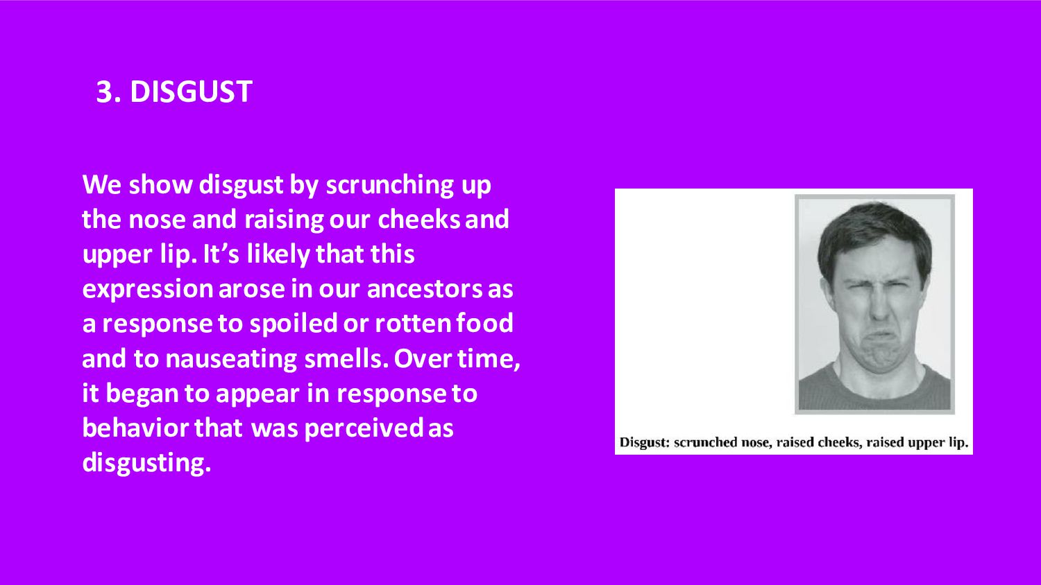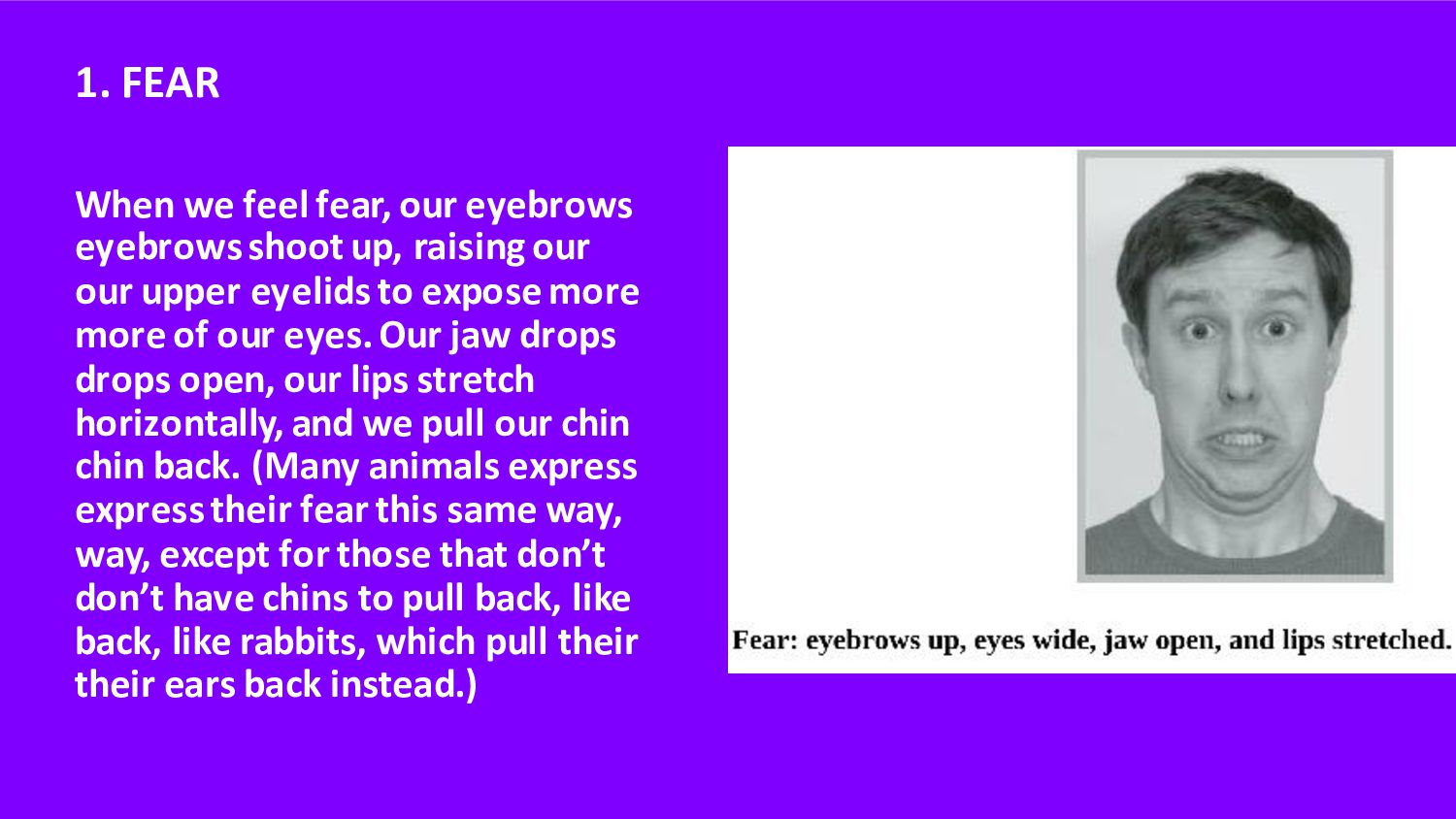 up, raising our our upper eyelids to expose more more of our eyes. Our jaw drops drops open, our lips stretch horizontally, and we pull our chin chin back. (Many animals express express their fear this same way, way, except for those that don’t don’t have chins to pull back, like back, like rabbits, which pull their their ears back instead.)