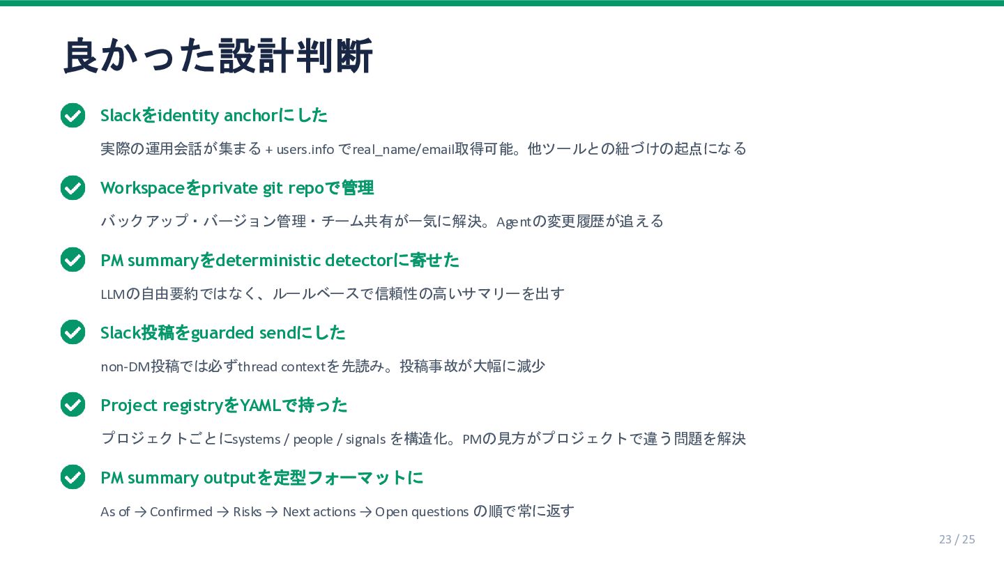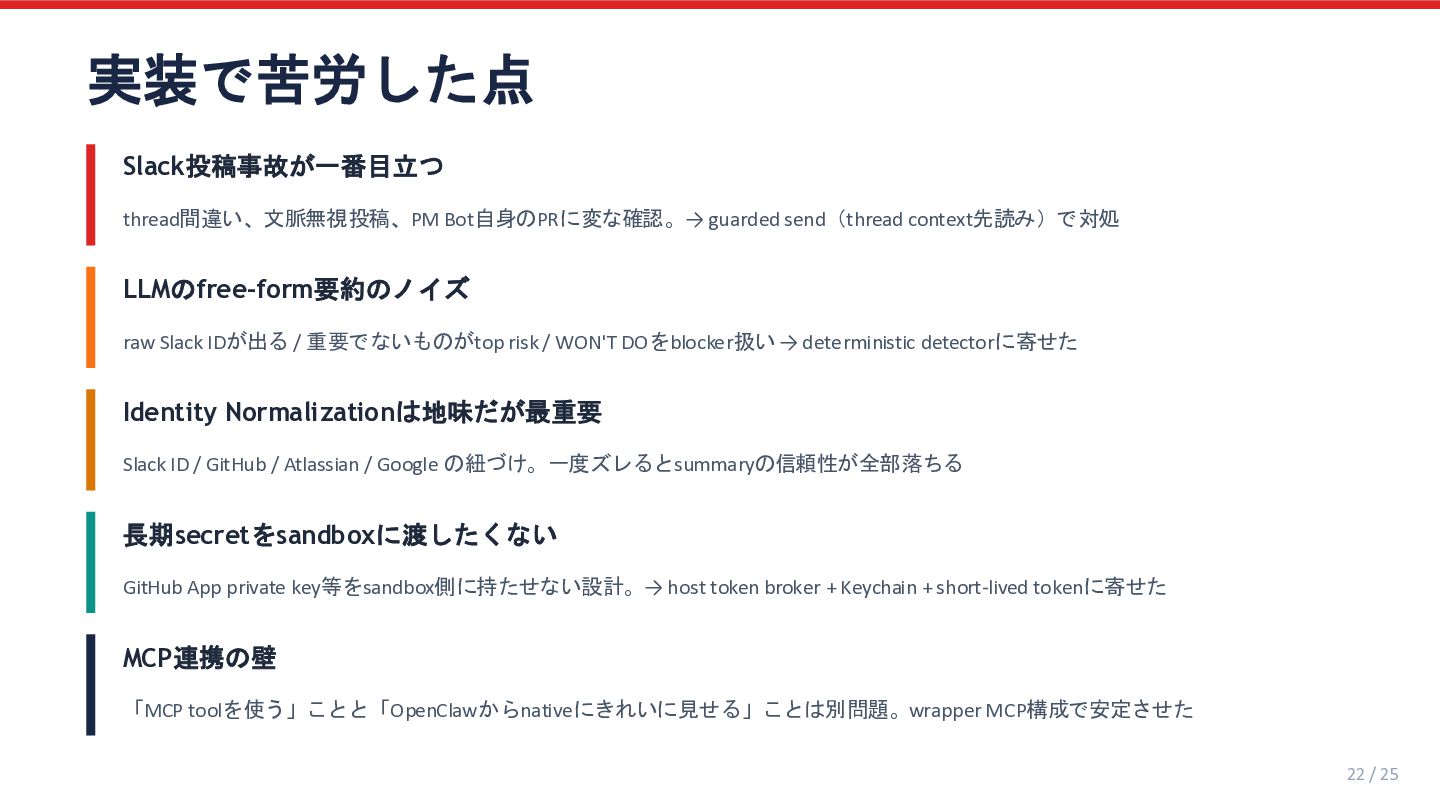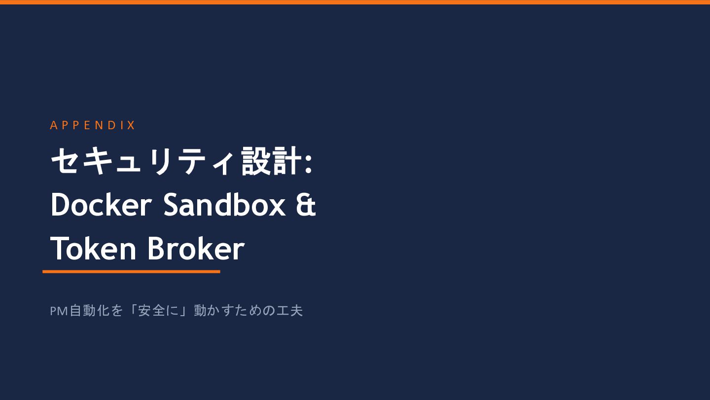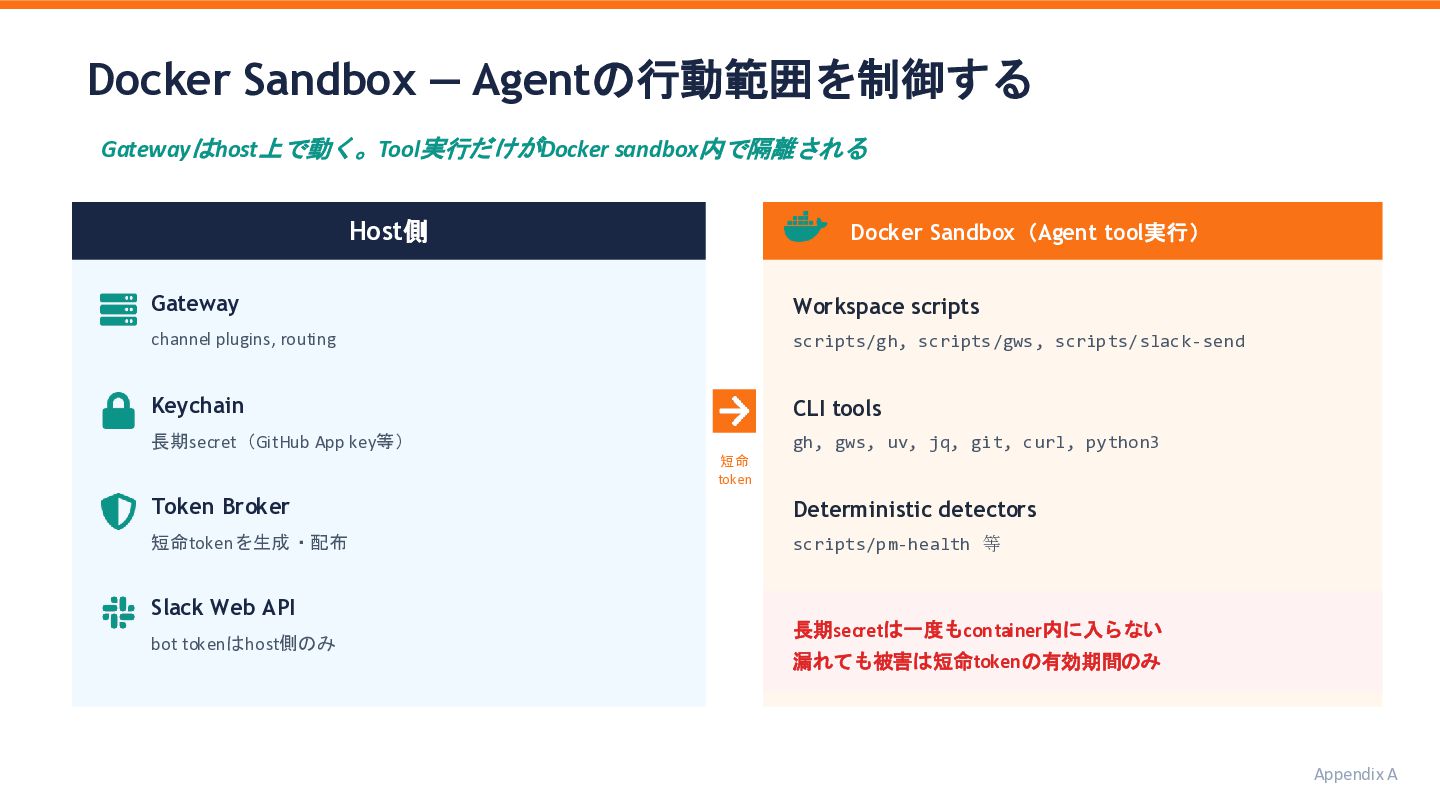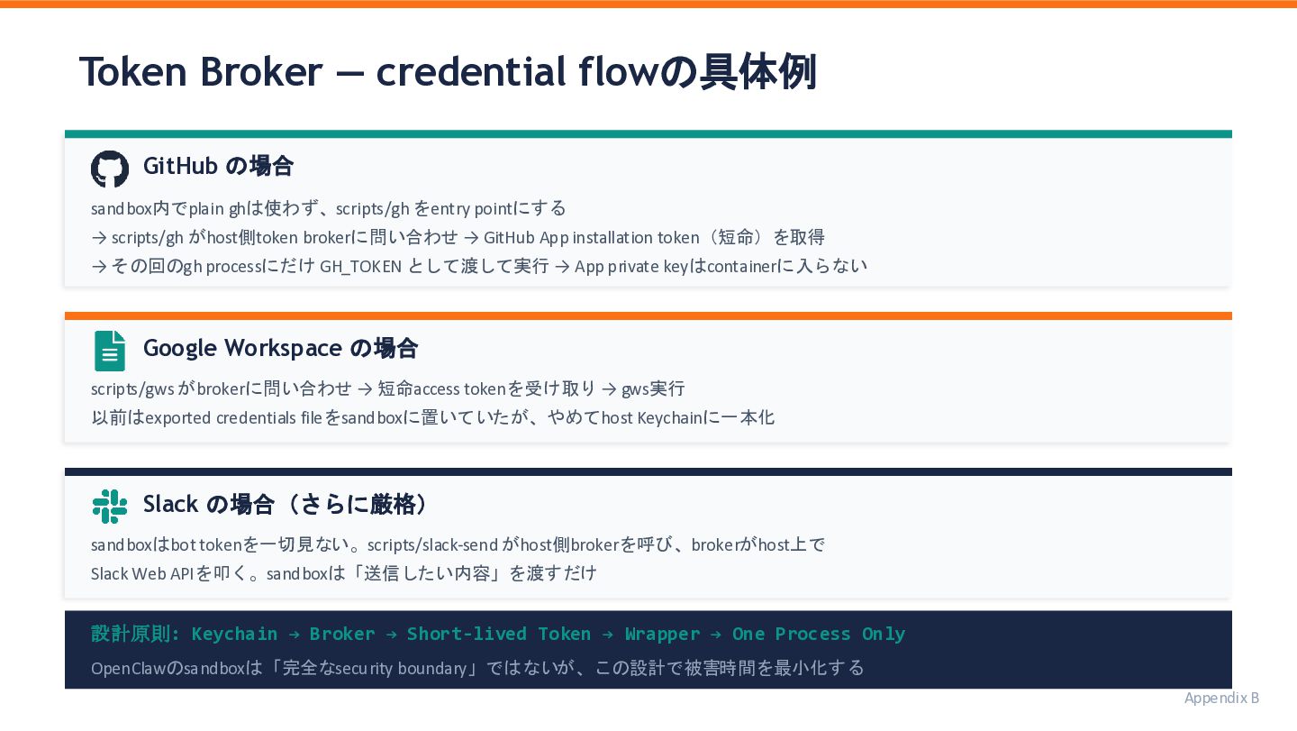 routing Keychain 長期secret(GitHub App key等) Token Broker 短命tokenを生成・配布 Slack Web API bot tokenはhost側のみ 短命 token Docker Sandbox(Agent tool実行) Workspace scripts scripts/gh, scripts/gws, scripts/slack-send CLI tools gh, gws, uv, jq, git, curl, python3 Deterministic detectors scripts/pm-health 等 Registry / Runbook project YAML, identity map 長期secretは一度もcontainer内に入らない 漏れても被害は短命tokenの有効期間のみ Appendix A