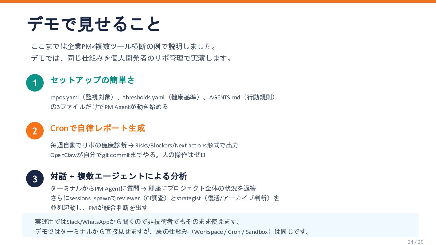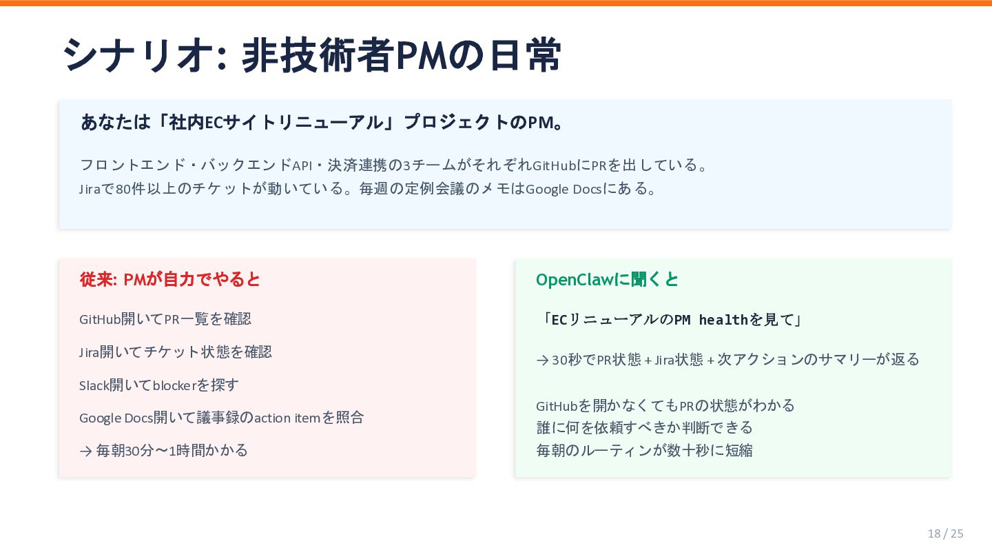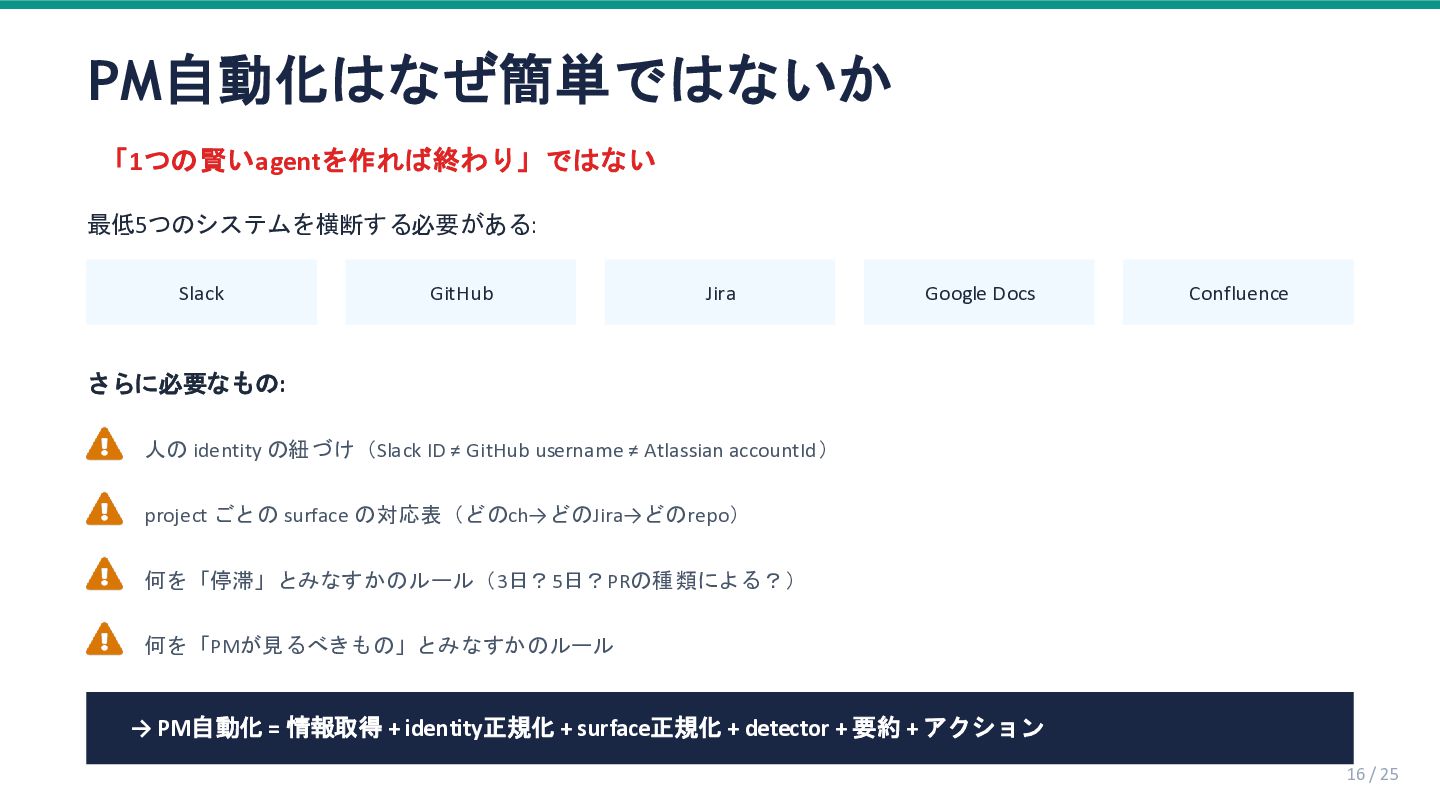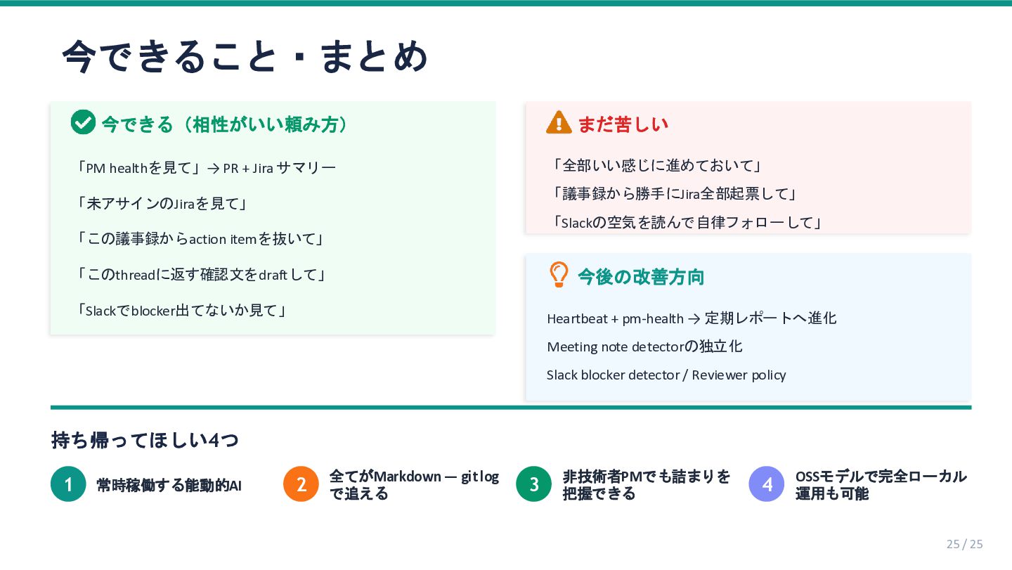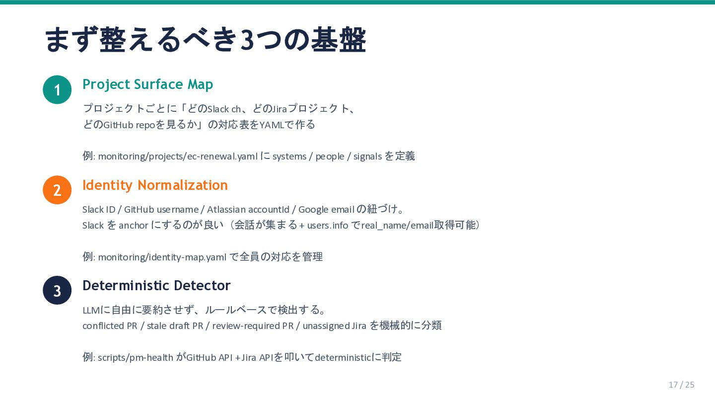 routing Keychain 長期secret(GitHub App key等) Token Broker 短命tokenを生成・配布 Slack Web API bot tokenはhost側のみ 短命 token Docker Sandbox(Agent tool実行) Workspace scripts scripts/gh, scripts/gws, scripts/slack-send CLI tools gh, gws, uv, jq, git, curl, python3 Deterministic detectors scripts/pm-health 等 Registry / Runbook project YAML, identity map 長期secretは一度もcontainer内に入らない 漏れても被害は短命tokenの有効期間のみ Appendix A