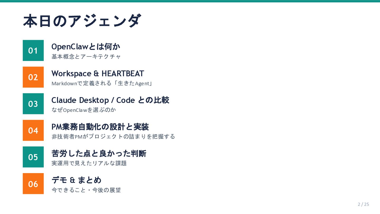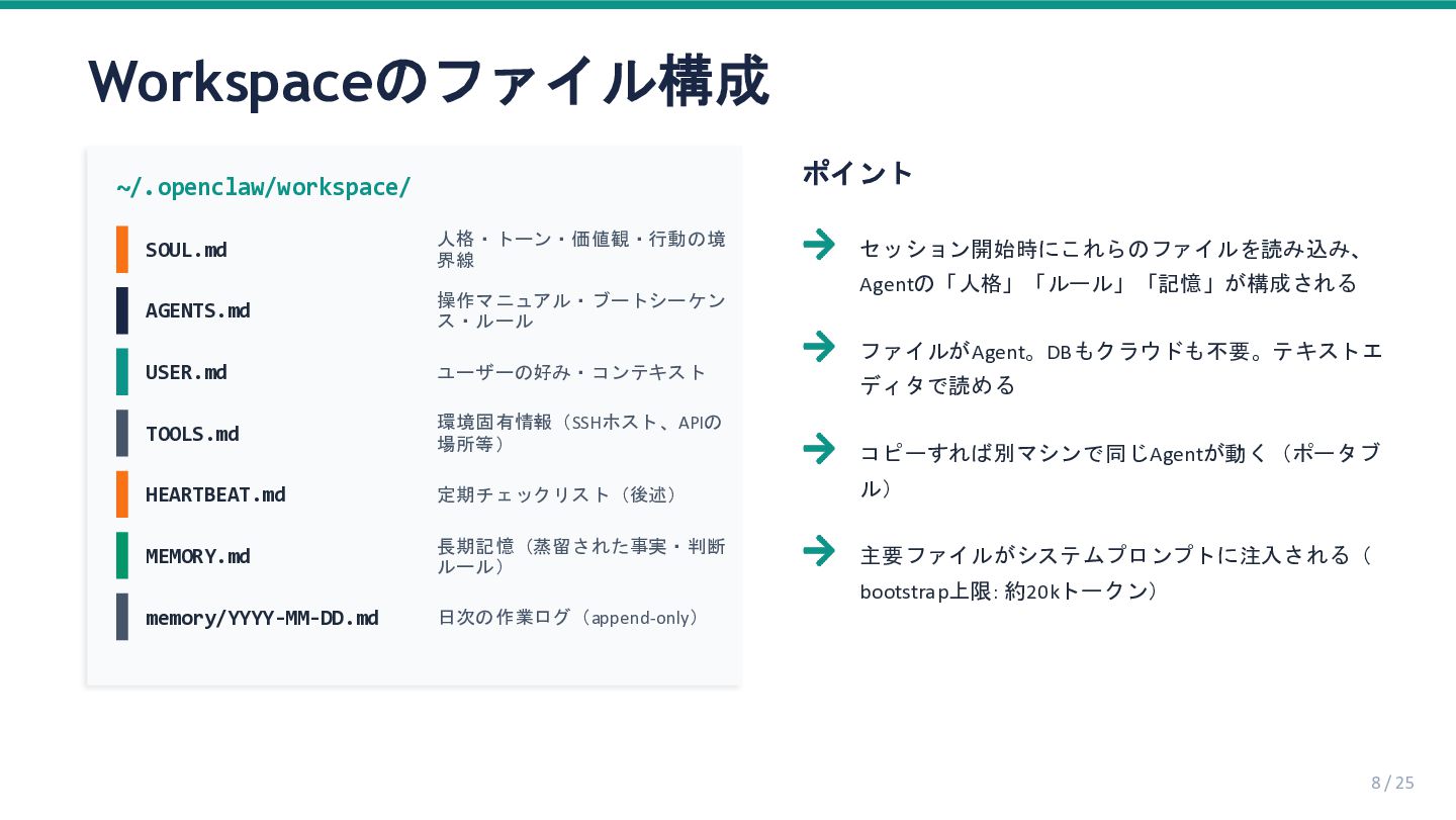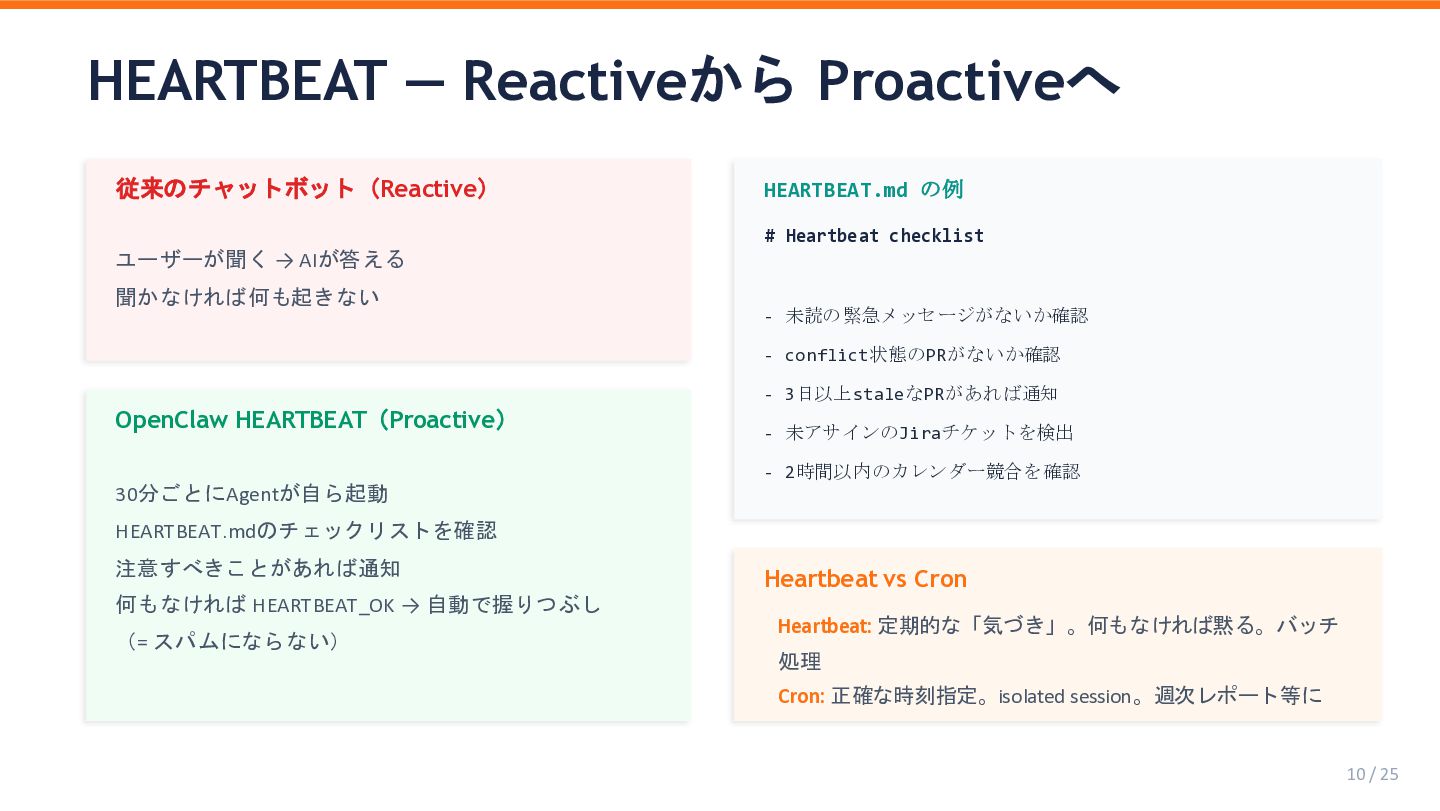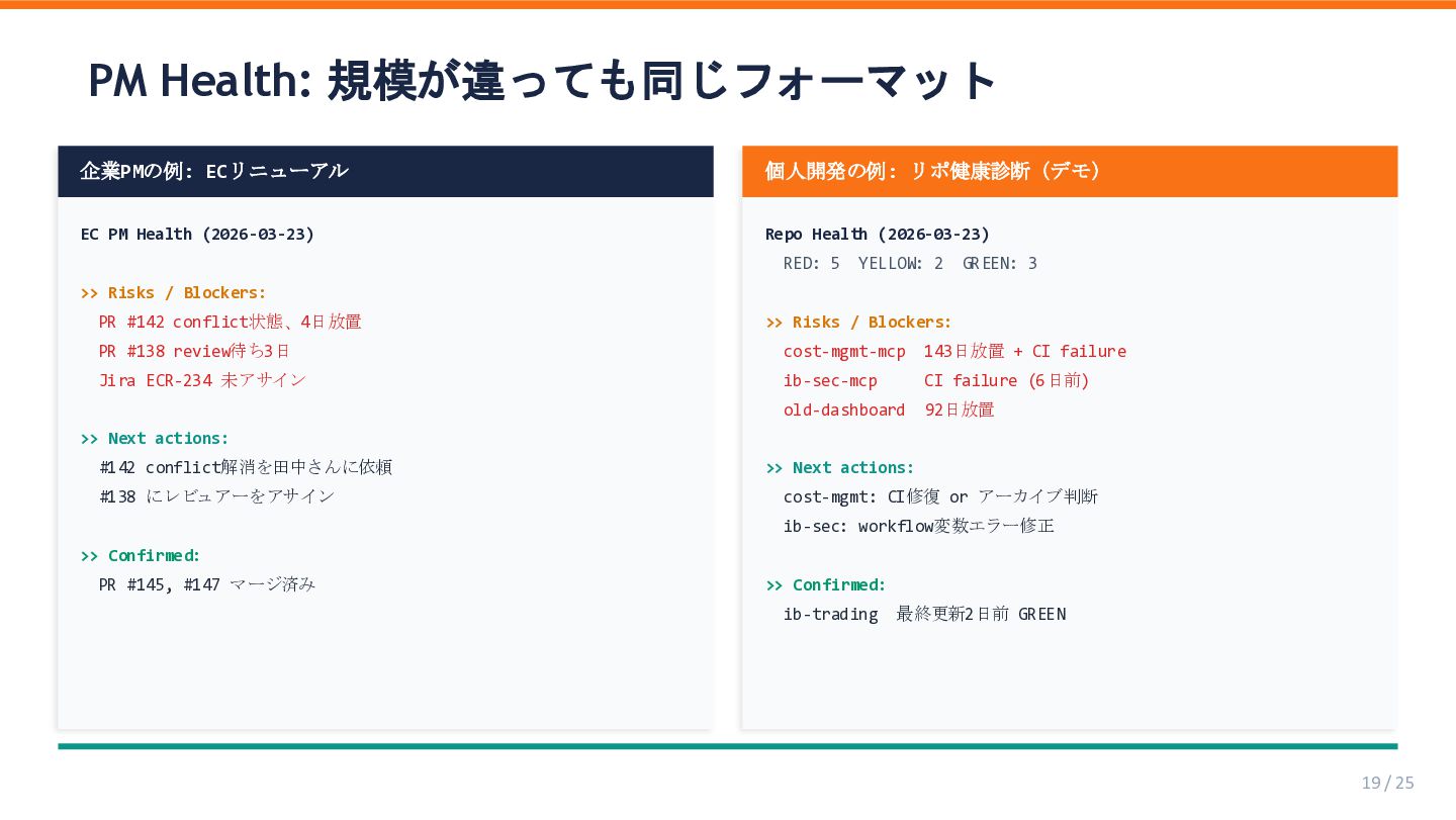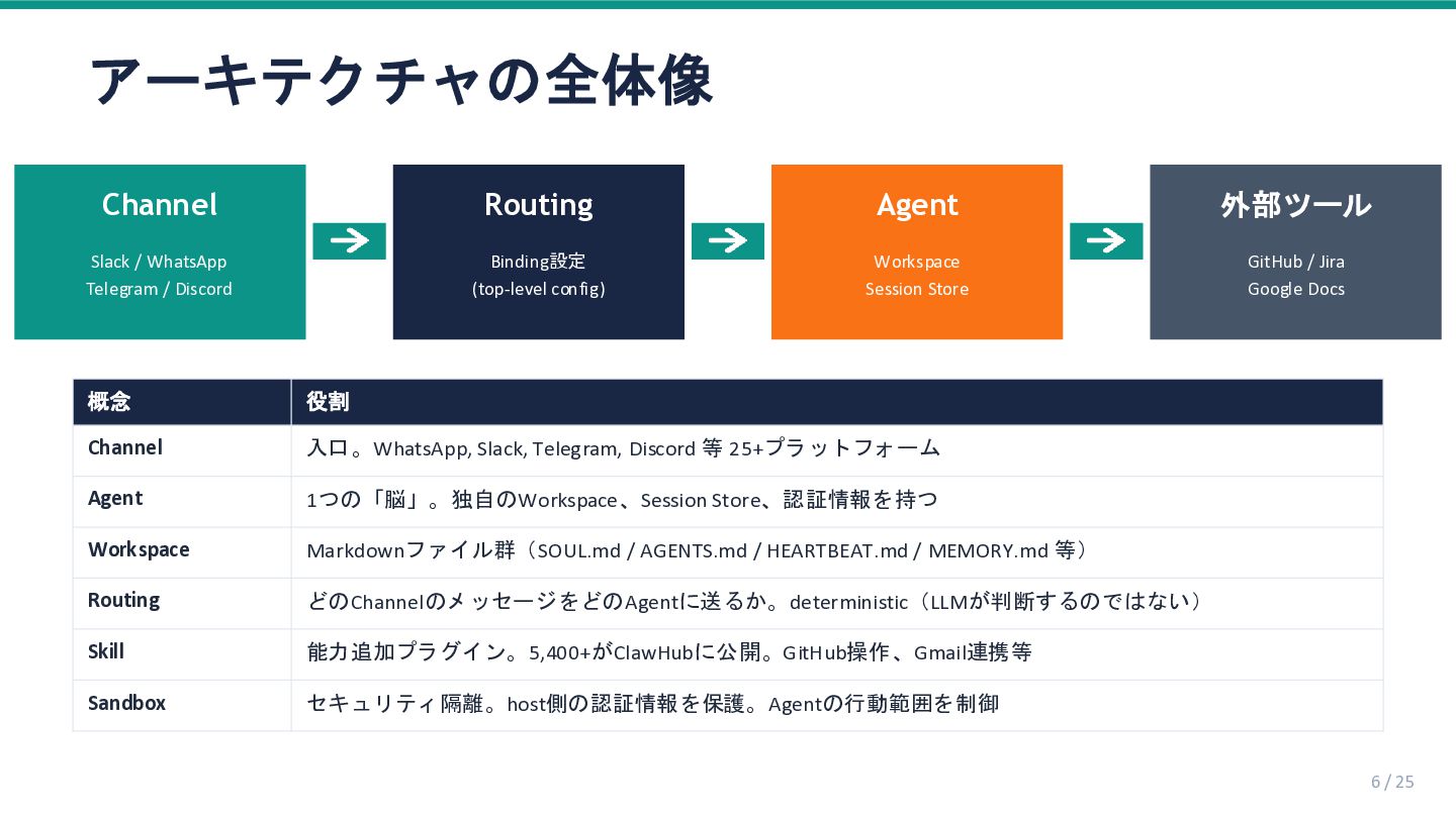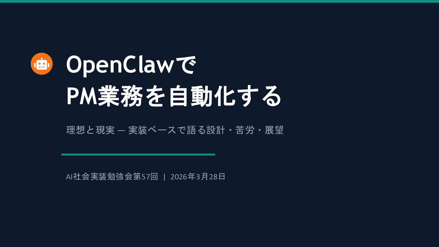 routing Keychain 長期secret(GitHub App key等) Token Broker 短命tokenを生成・配布 Slack Web API bot tokenはhost側のみ 短命 token Docker Sandbox(Agent tool実行) Workspace scripts scripts/gh, scripts/gws, scripts/slack-send CLI tools gh, gws, uv, jq, git, curl, python3 Deterministic detectors scripts/pm-health 等 Registry / Runbook project YAML, identity map 長期secretは一度もcontainer内に入らない 漏れても被害は短命tokenの有効期間のみ Appendix A