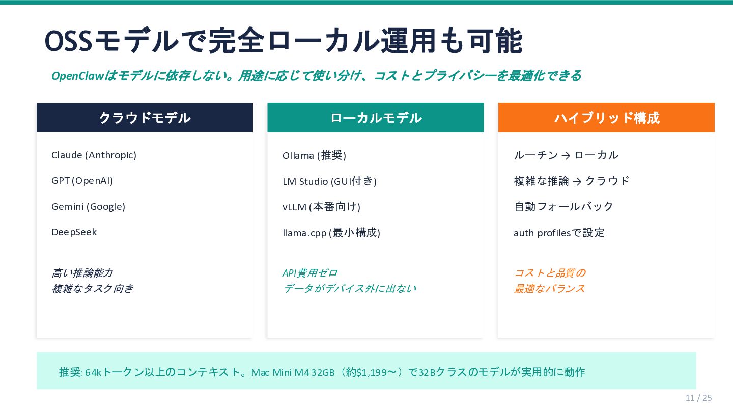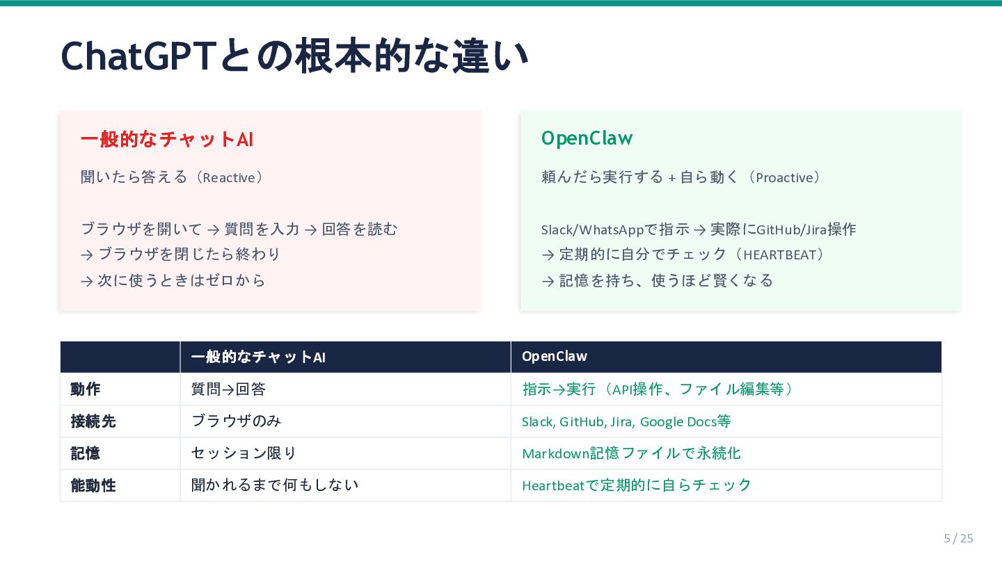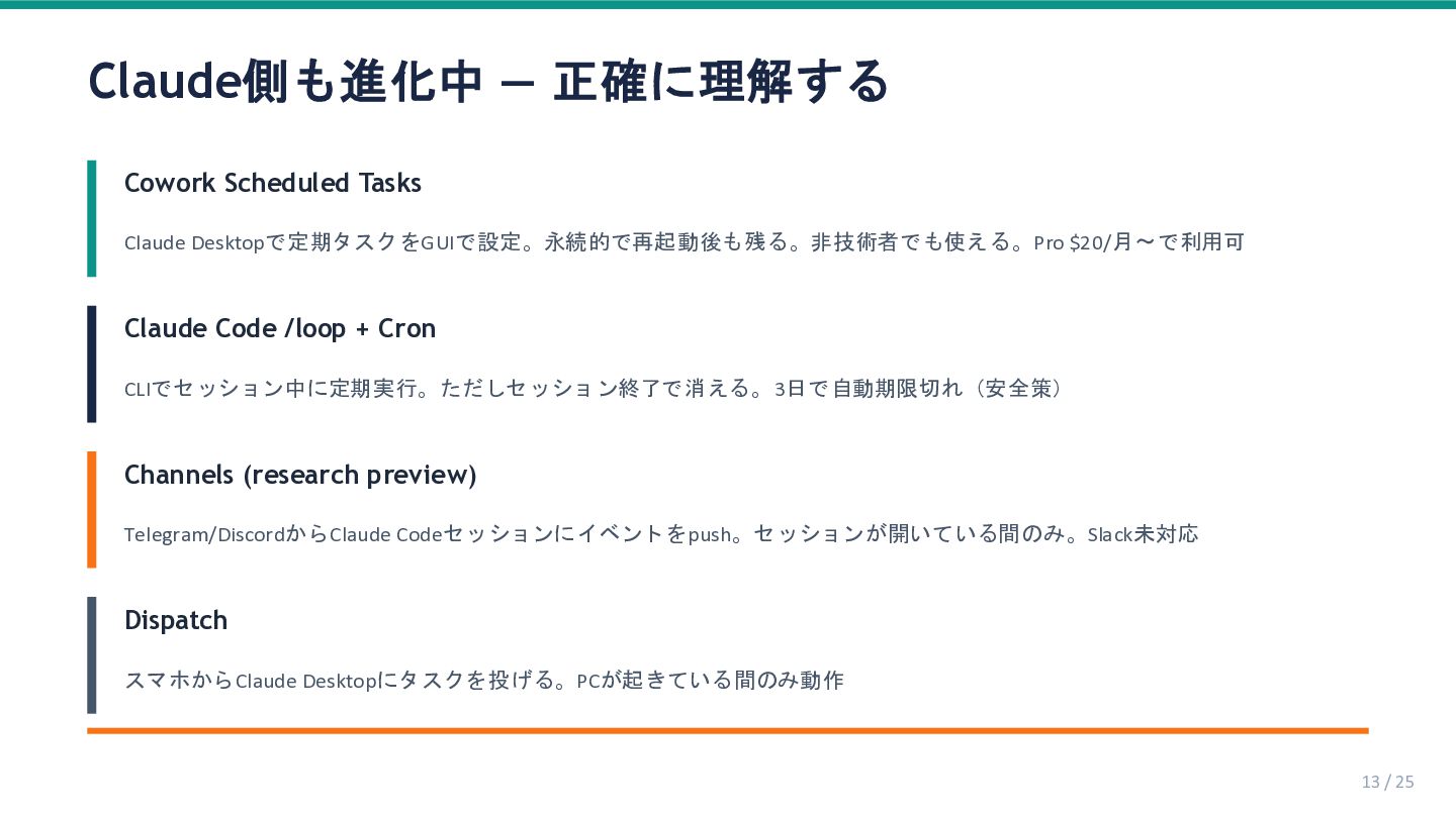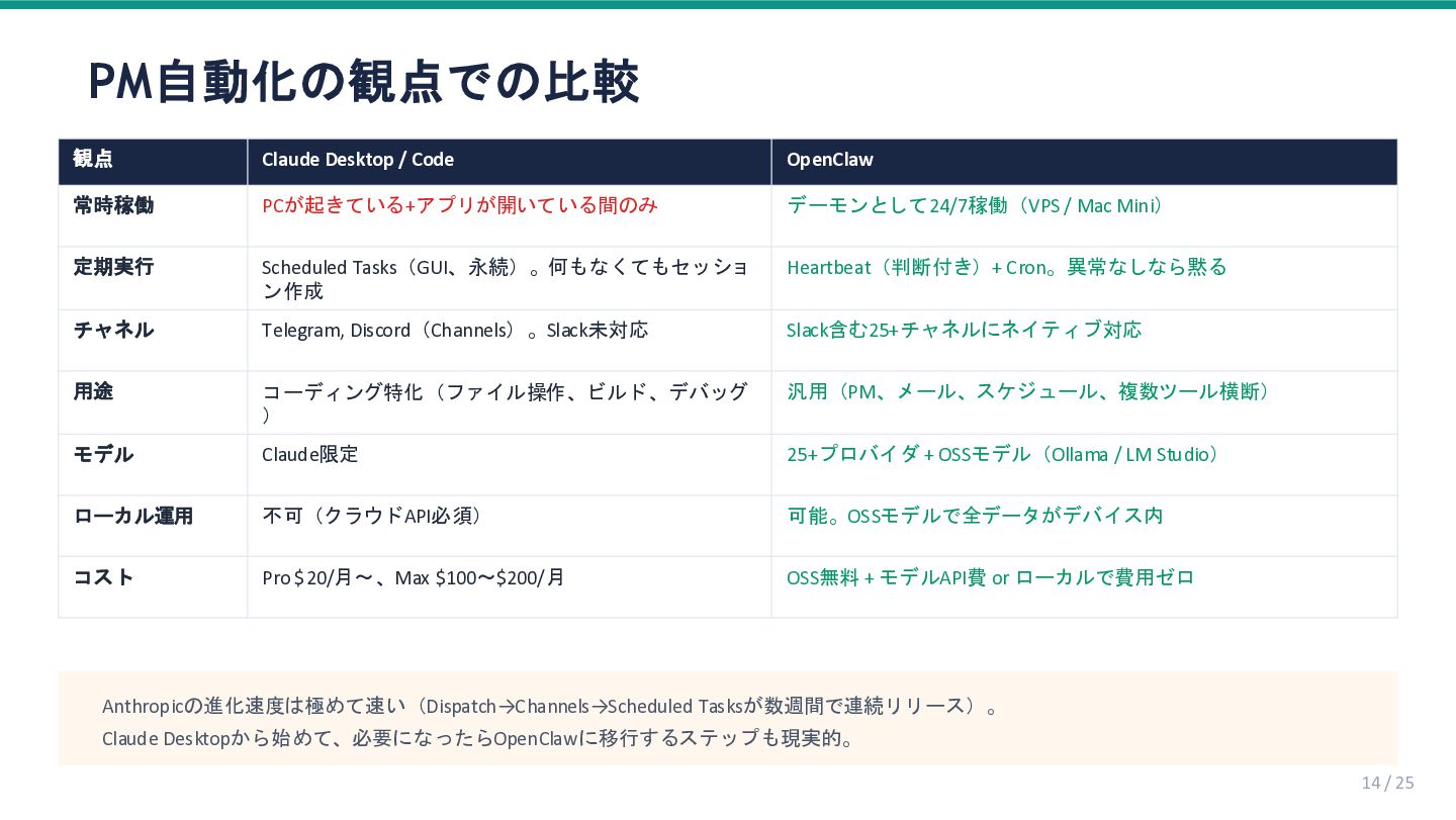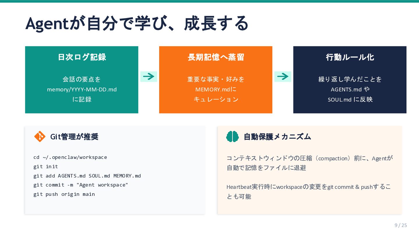 routing Keychain 長期secret(GitHub App key等) Token Broker 短命tokenを生成・配布 Slack Web API bot tokenはhost側のみ 短命 token Docker Sandbox(Agent tool実行) Workspace scripts scripts/gh, scripts/gws, scripts/slack-send CLI tools gh, gws, uv, jq, git, curl, python3 Deterministic detectors scripts/pm-health 等 Registry / Runbook project YAML, identity map 長期secretは一度もcontainer内に入らない 漏れても被害は短命tokenの有効期間のみ Appendix A