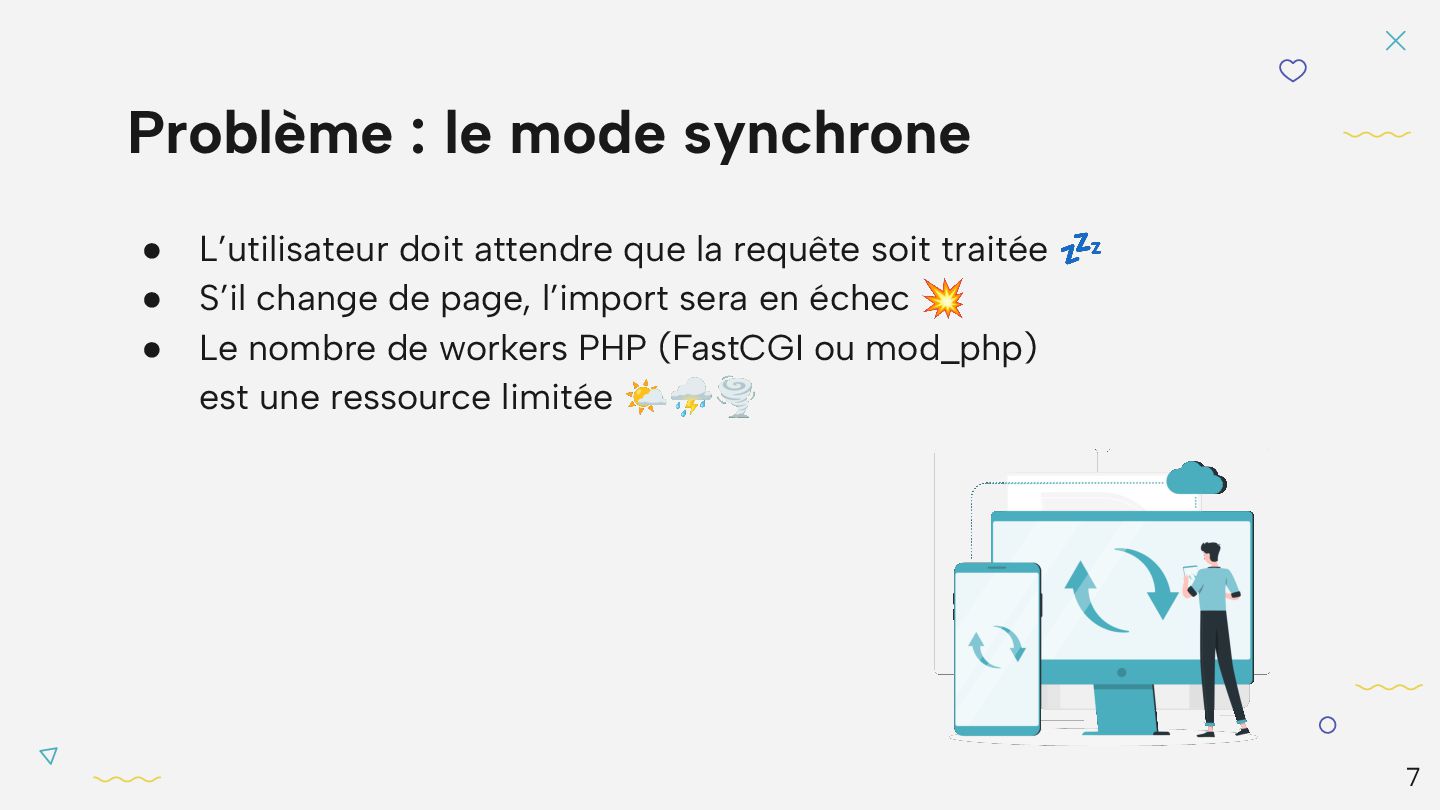 Générer des PDF, des CSV, ou faire des traitements lourd lors du traitement d'une requête HTTP impacte lourdement les performances de l'application.