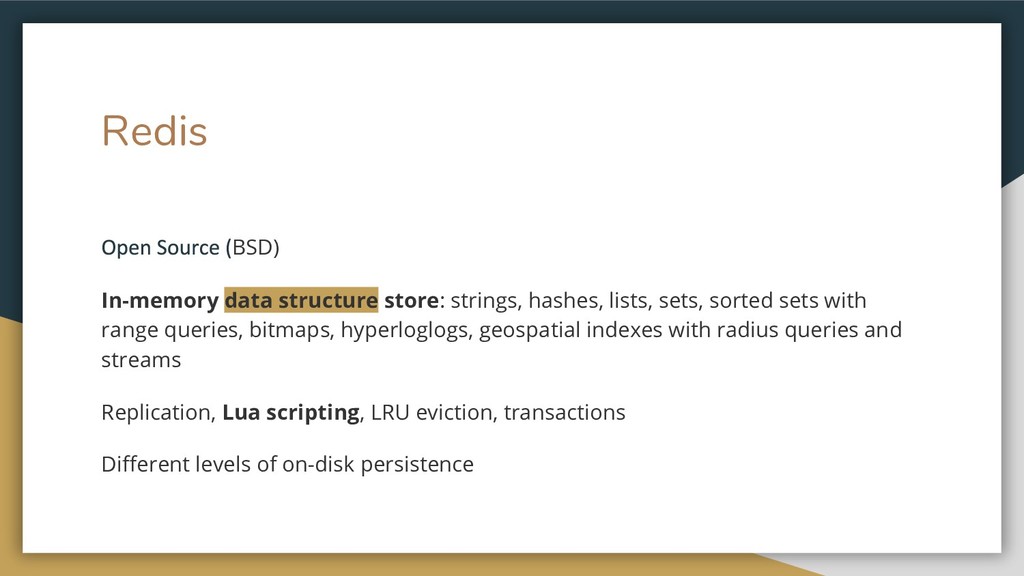 Redis BSD) In-memory data structure store: strings, hashes, lists, sets,