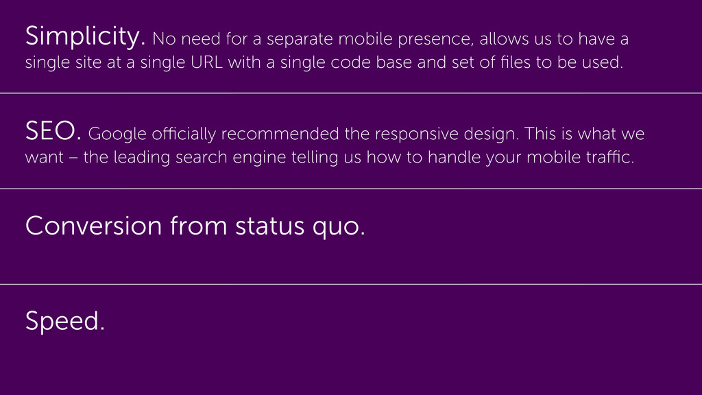 to have a single site at a single URL with a single code base and set of files to be used. SEO. Google officially recommended the responsive design. This is what we want – the leading search engine telling us how to handle your mobile traffic. Conversion from status quo. Speed.