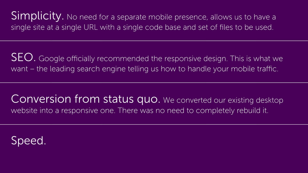 to have a single site at a single URL with a single code base and set of files to be used. SEO. Google officially recommended the responsive design. This is what we want – the leading search engine telling us how to handle your mobile traffic. Conversion from status quo. We converted our existing desktop website into a responsive one. There was no need to completely rebuild it. Speed.