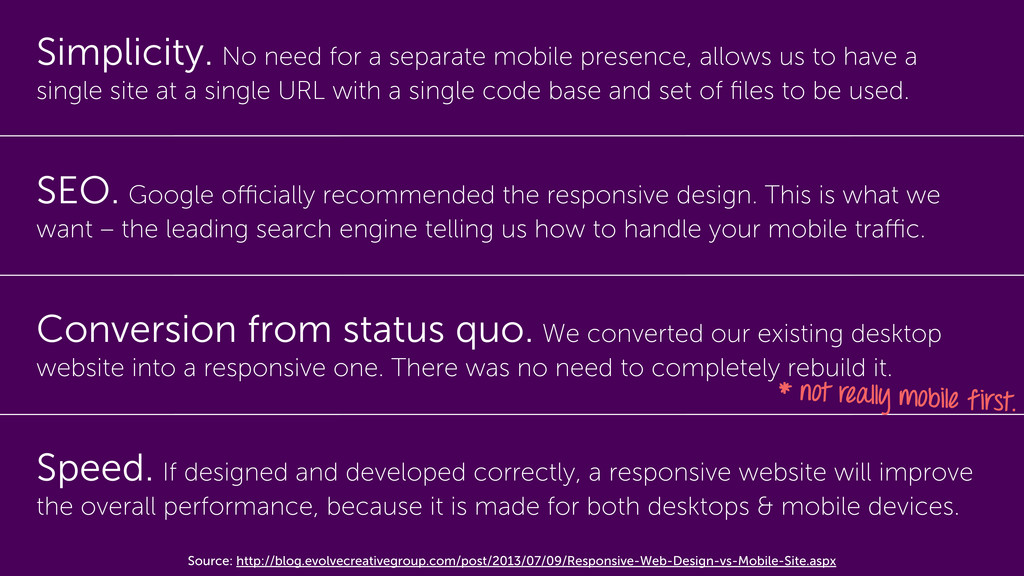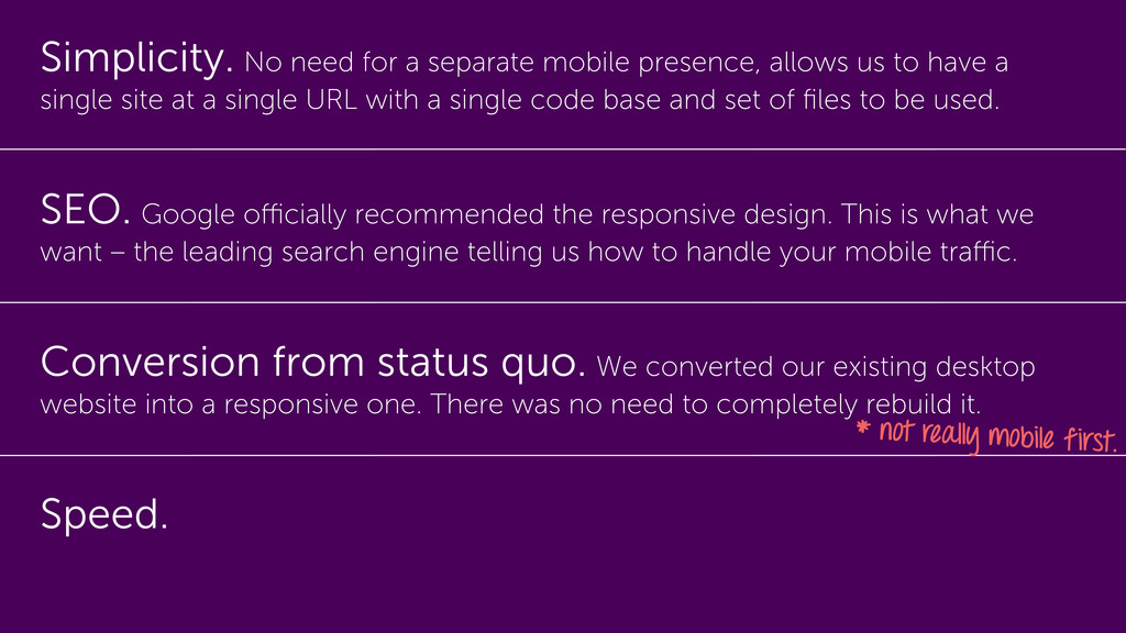 to have a single site at a single URL with a single code base and set of files to be used. SEO. Google officially recommended the responsive design. This is what we want – the leading search engine telling us how to handle your mobile traffic. Conversion from status quo. We converted our existing desktop website into a responsive one. There was no need to completely rebuild it. Speed. * not really mobile first.