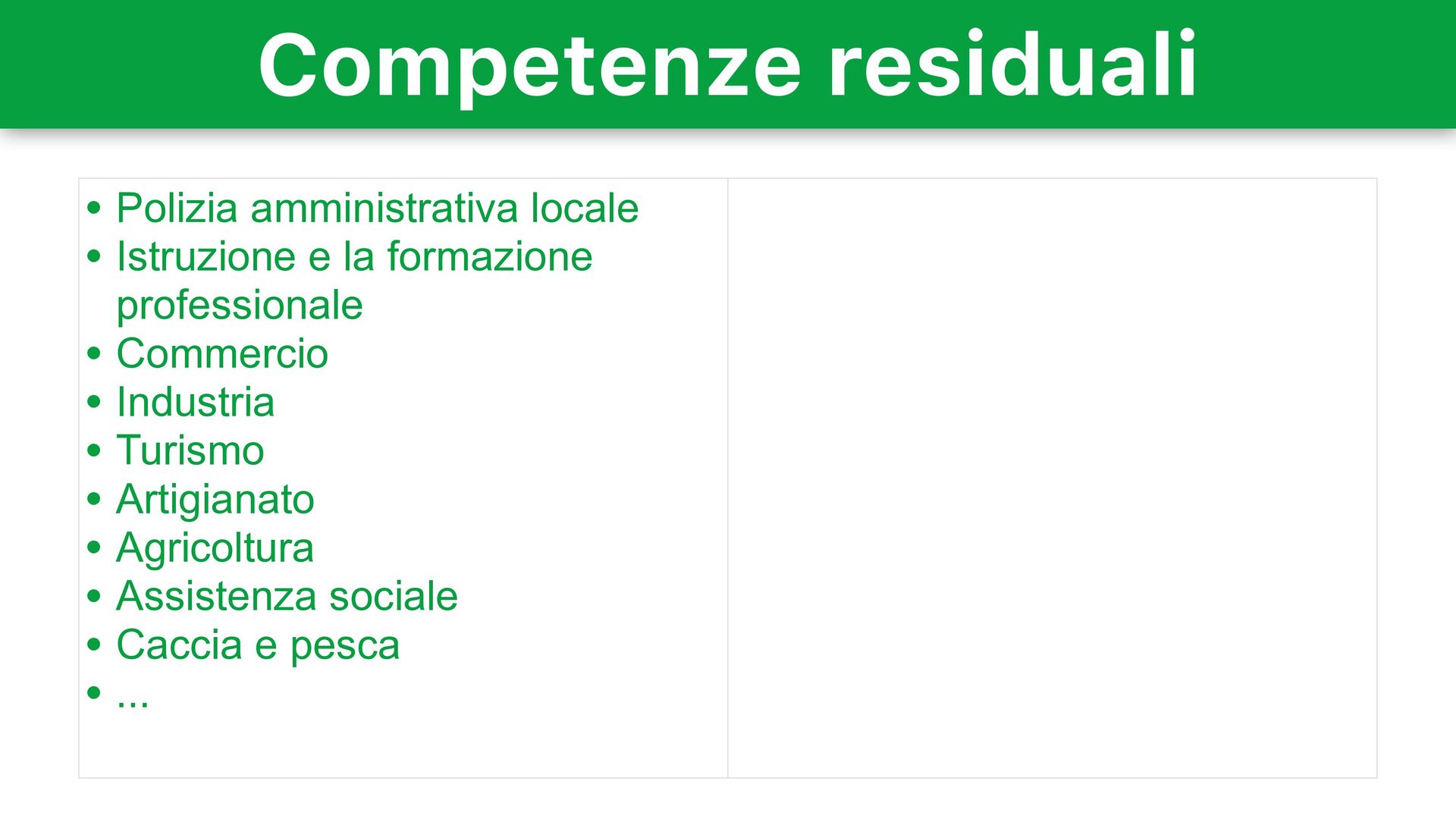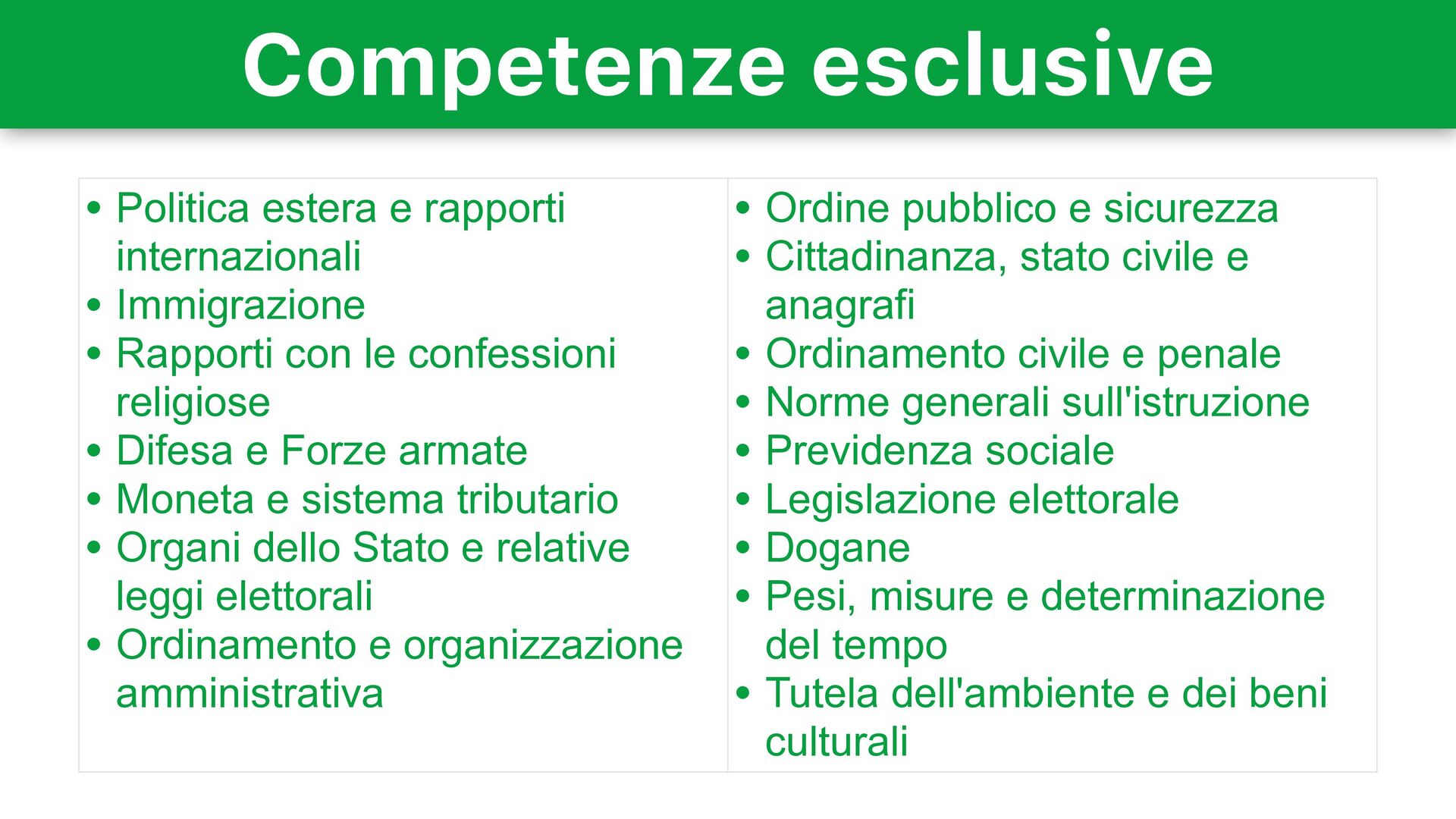• Rapporti con le confessioni religiose • Difesa e Forze armate • Moneta e sistema tributario • Organi dello Stato e relative leggi elettorali • Ordinamento e organizzazione amministrativa • Ordine pubblico e sicurezza • Cittadinanza, stato civile e anagrafi • Ordinamento civile e penale • Norme generali sull'istruzione • Previdenza sociale • Legislazione elettorale • Dogane • Pesi, misure e determinazione del tempo • Tutela dell'ambiente e dei beni culturali