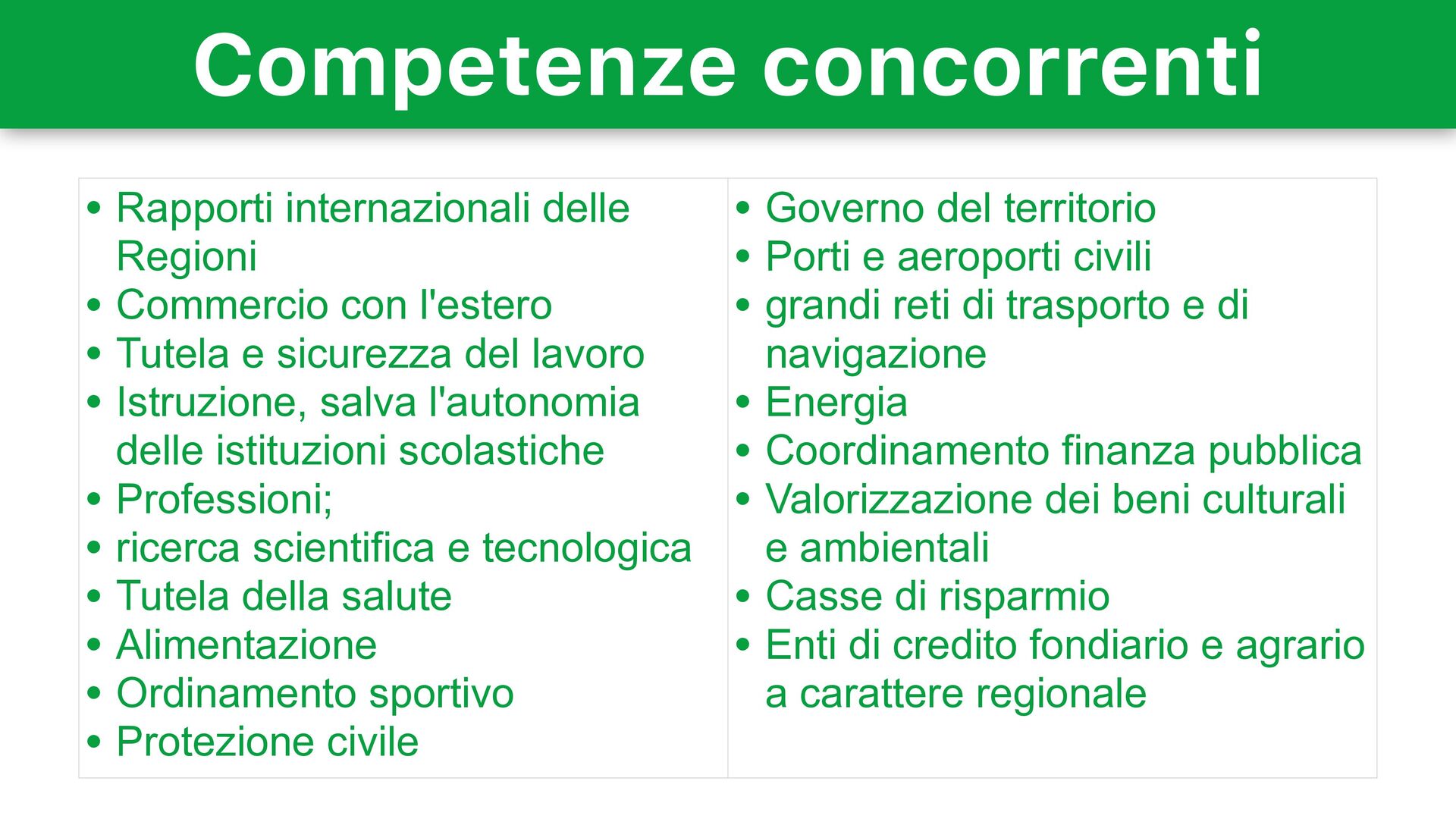 l'estero • Tutela e sicurezza del lavoro • Istruzione, salva l'autonomia delle istituzioni scolastiche • Professioni; • ricerca scientifica e tecnologica • Tutela della salute • Alimentazione • Ordinamento sportivo • Protezione civile • Governo del territorio • Porti e aeroporti civili • grandi reti di trasporto e di navigazione • Energia • Coordinamento finanza pubblica • Valorizzazione dei beni culturali e ambientali • Casse di risparmio • Enti di credito fondiario e agrario a carattere regionale