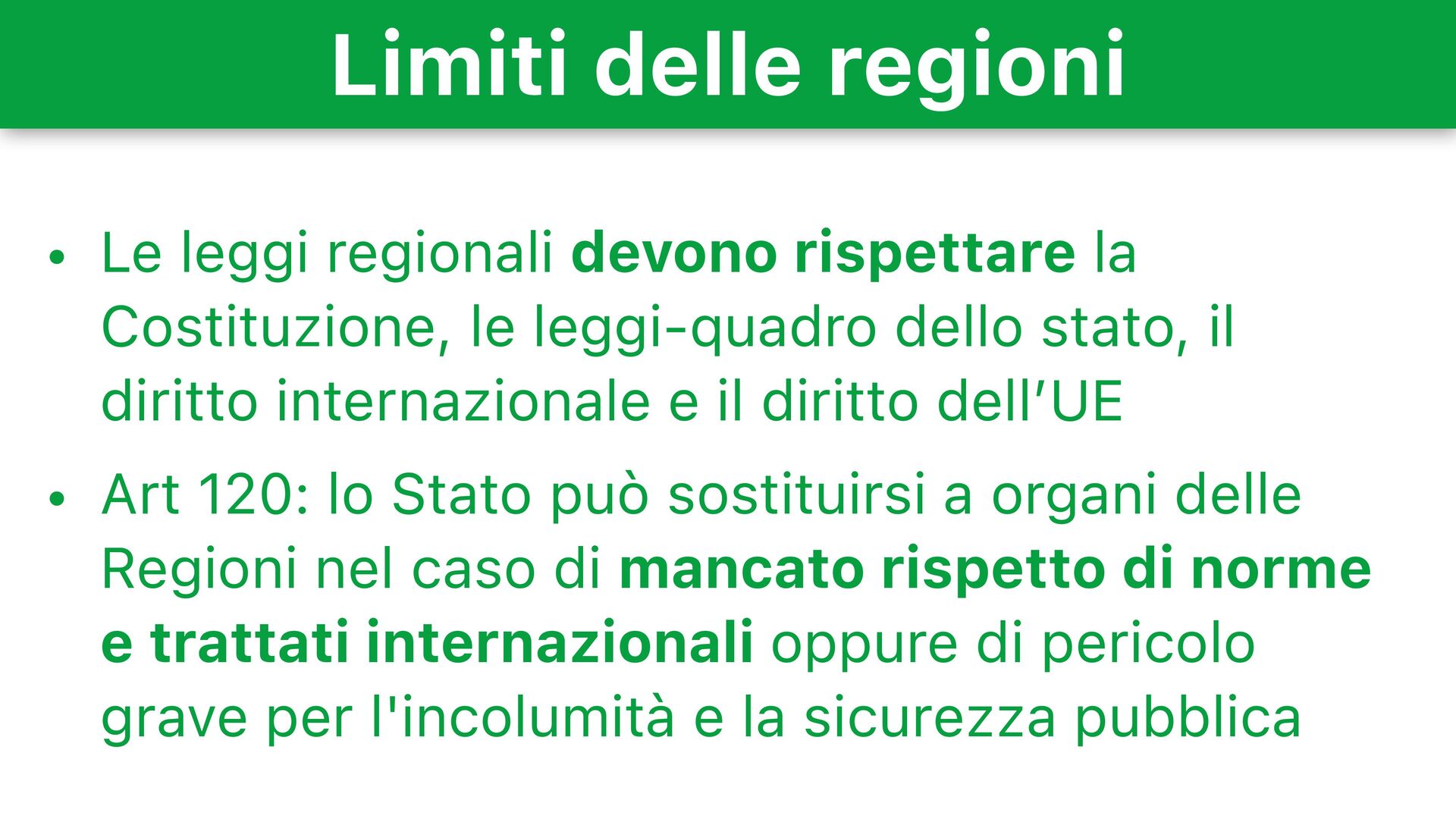 Costituzione, le leggi-quadro dello stato, il diritto internazionale e il diritto dell’UE • Art 120: lo Stato può sostituirsi a organi delle Regioni nel caso di mancato rispetto di norme e trattati internazionali oppure di pericolo grave per l'incolumità e la sicurezza pubblica