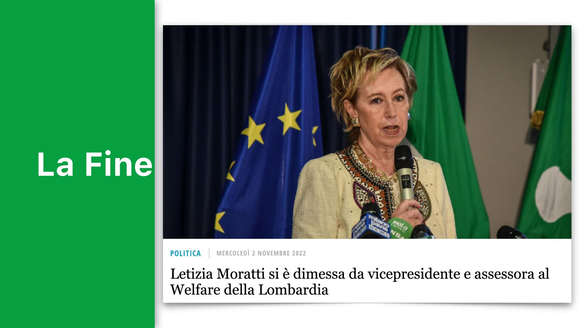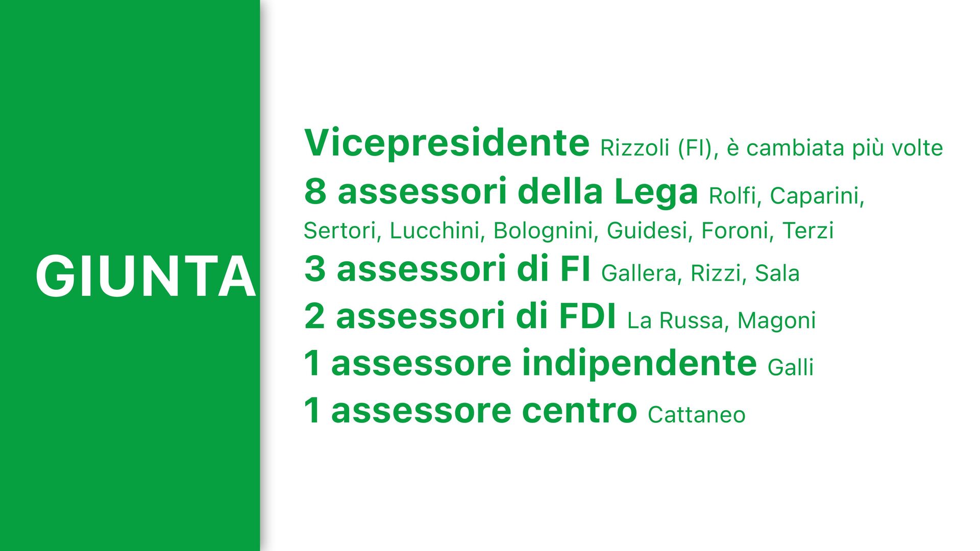 della Lega Rolfi, Caparini, Sertori, Lucchini, Bolognini, Guidesi, Foroni, Terzi 3 assessori di FI Gallera, Rizzi, Sala 2 assessori di FDI La Russa, Magoni 1 assessore indipendente Galli 1 assessore centro Cattaneo