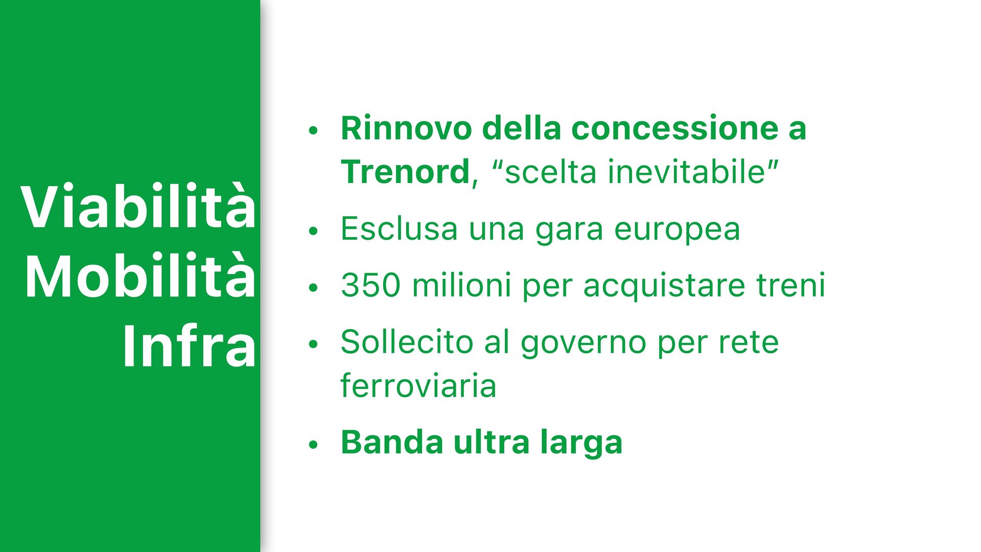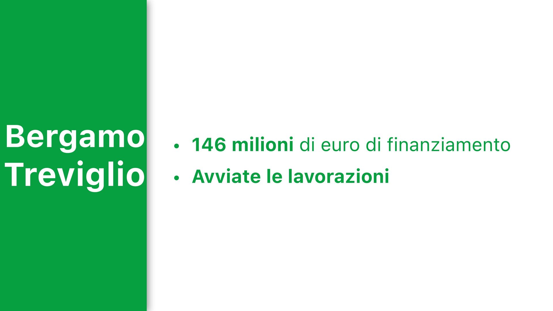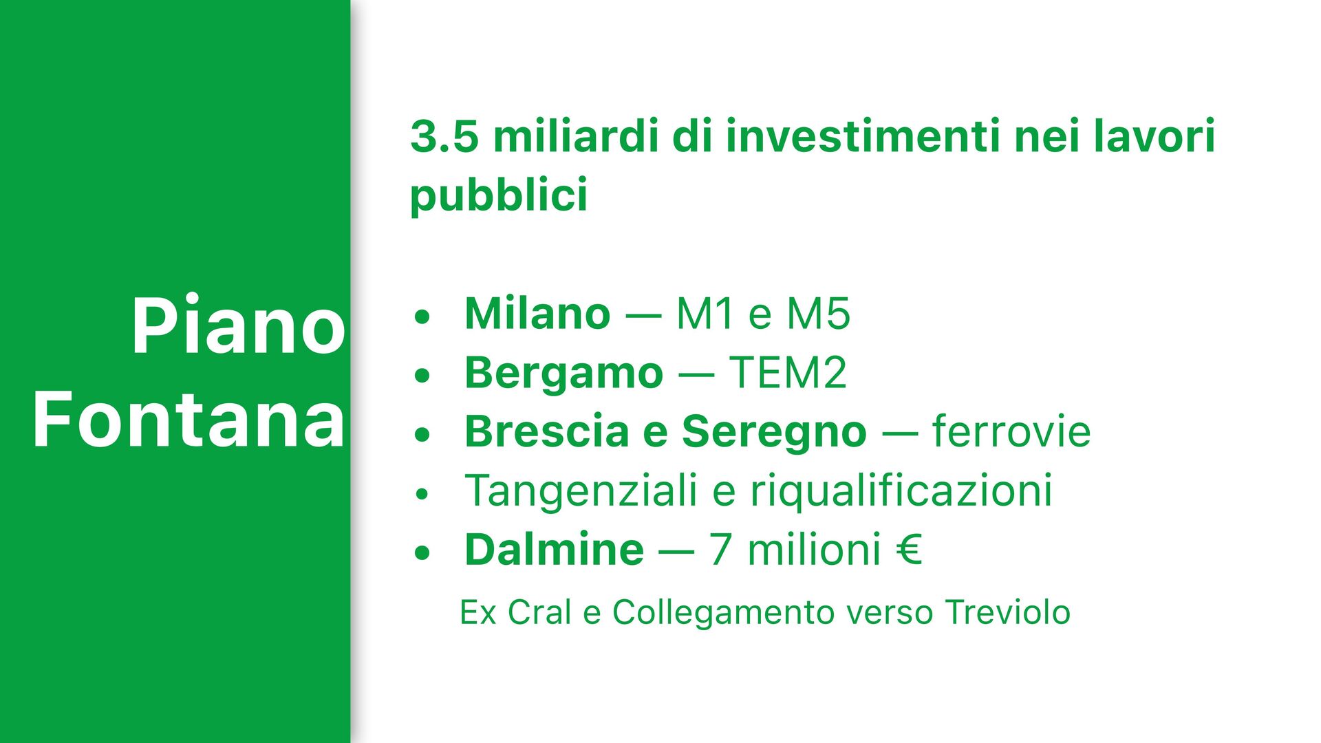 Milano — M1 e M5 • Bergamo — TEM2 • Brescia e Seregno — ferrovie • Tangenziali e riqualificazioni • Dalmine — 7 milioni Ex Cral e Collegamento verso Treviolo