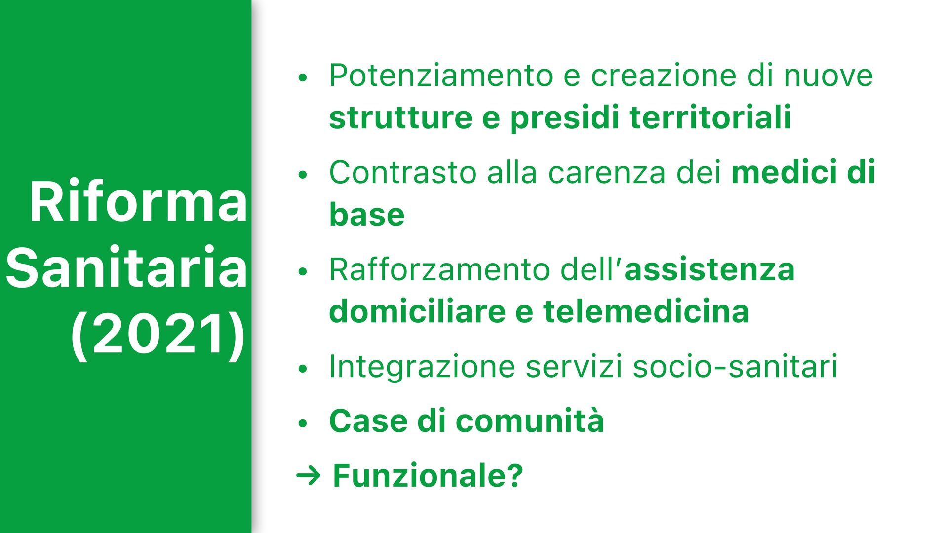 e presidi territoriali • Contrasto alla carenza dei medici di base • Rafforzamento dell’assistenza domiciliare e telemedicina • Integrazione servizi socio-sanitari • Case di comunità Funzionale