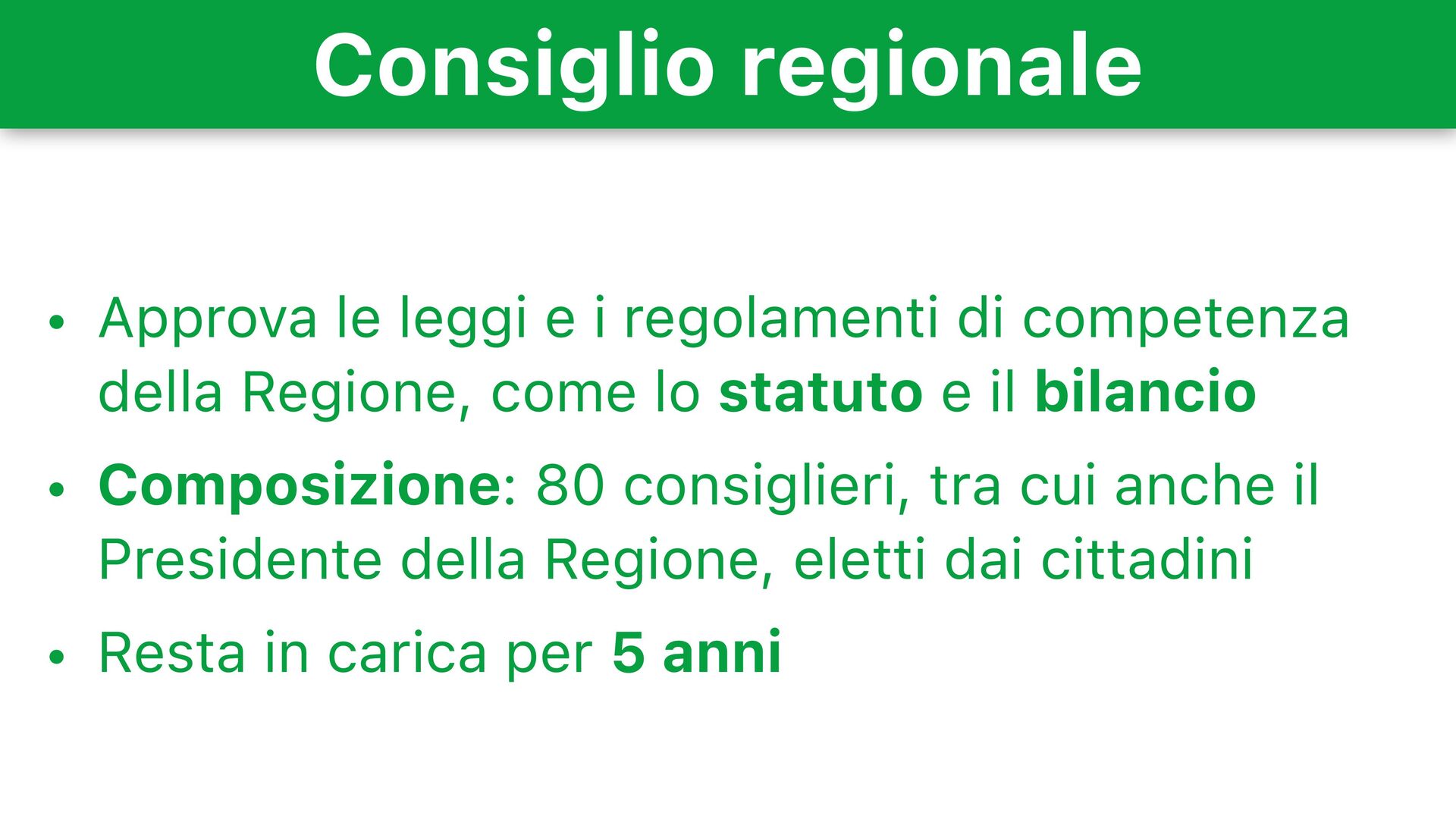 competenza della Regione, come lo statuto e il bilancio • Composizione: 80 consiglieri, tra cui anche il Presidente della Regione, eletti dai cittadini • Resta in carica per 5 anni