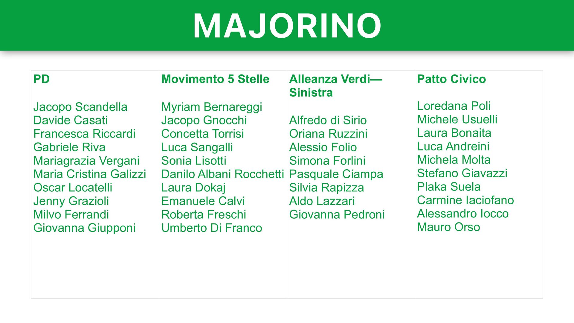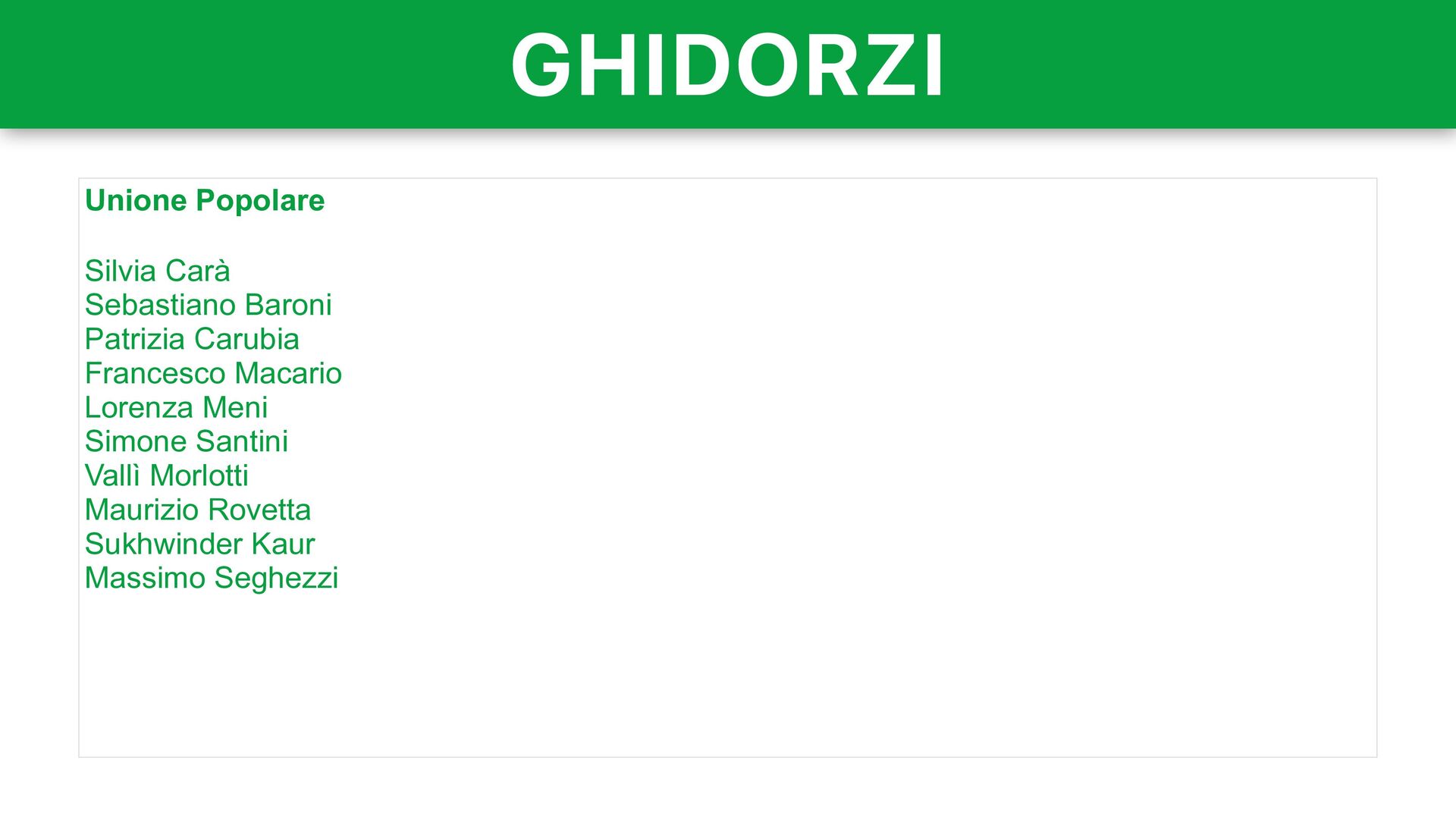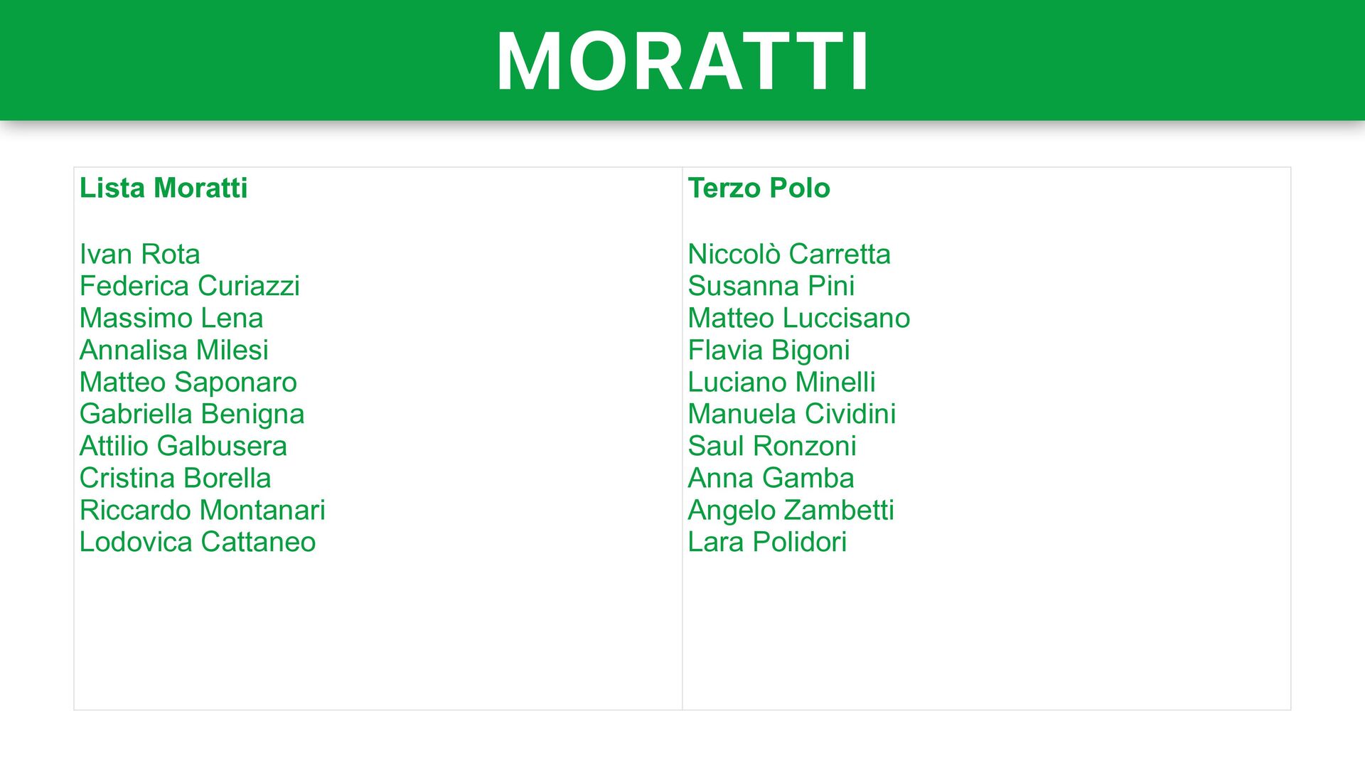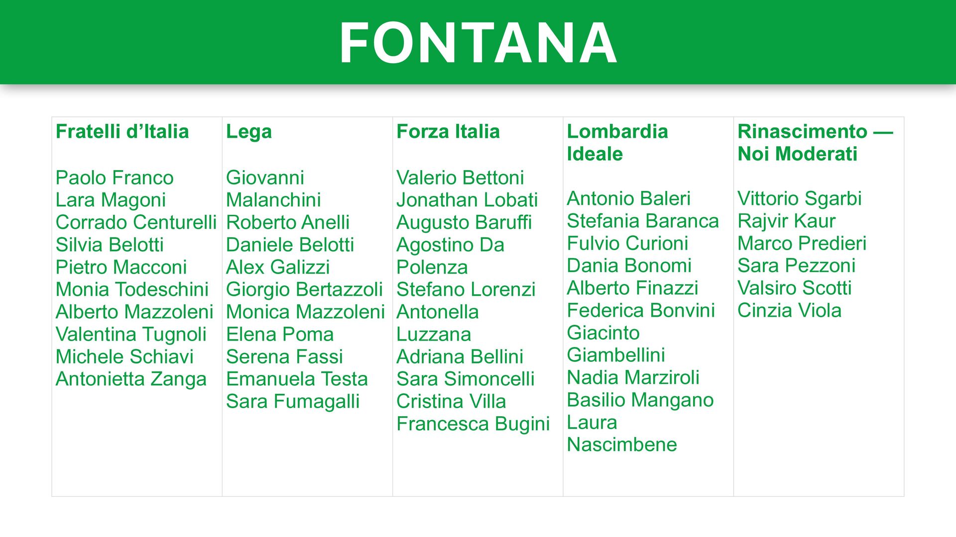 Belotti Pietro Macconi Monia Todeschini Alberto Mazzoleni Valentina Tugnoli Michele Schiavi Antonietta Zanga Lega Giovanni Malanchini Roberto Anelli Daniele Belotti Alex Galizzi Giorgio Bertazzoli Monica Mazzoleni Elena Poma Serena Fassi Emanuela Testa Sara Fumagalli Forza Italia Valerio Bettoni Jonathan Lobati Augusto Baruffi Agostino Da Polenza Stefano Lorenzi Antonella Luzzana Adriana Bellini Sara Simoncelli Cristina Villa Francesca Bugini Lombardia Ideale Antonio Baleri Stefania Baranca Fulvio Curioni Dania Bonomi Alberto Finazzi Federica Bonvini Giacinto Giambellini Nadia Marziroli Basilio Mangano Laura Nascimbene Rinascimento — Noi Moderati Vittorio Sgarbi Rajvir Kaur Marco Predieri Sara Pezzoni Valsiro Scotti Cinzia Viola