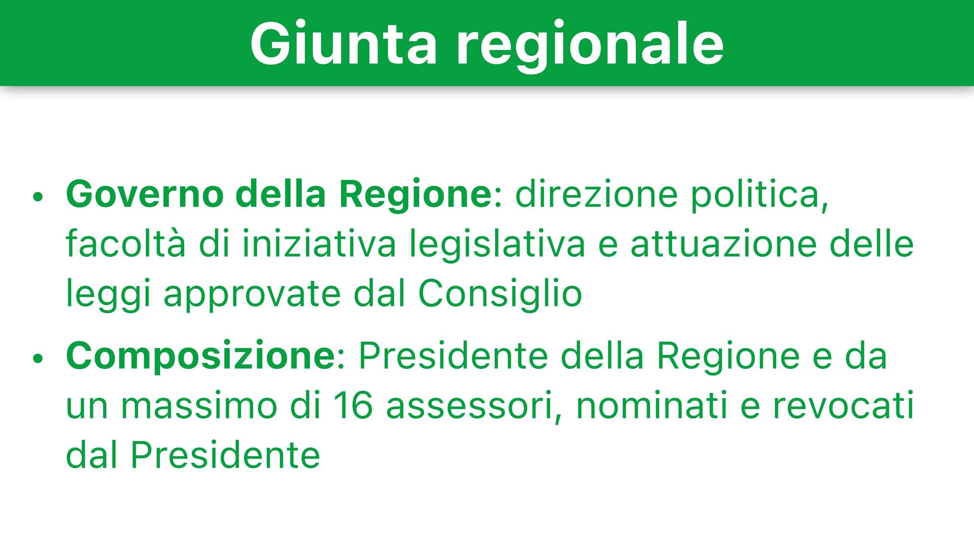 iniziativa legislativa e attuazione delle leggi approvate dal Consiglio • Composizione: Presidente della Regione e da un massimo di 16 assessori, nominati e revocati dal Presidente