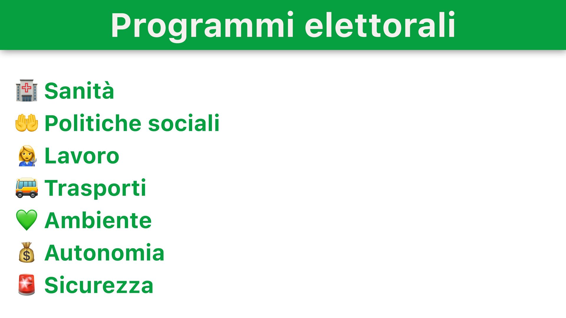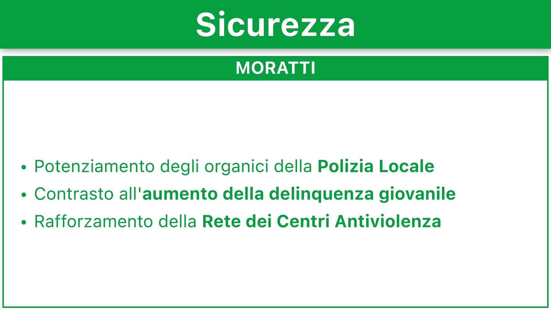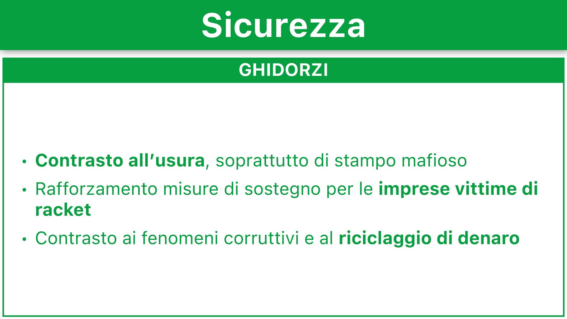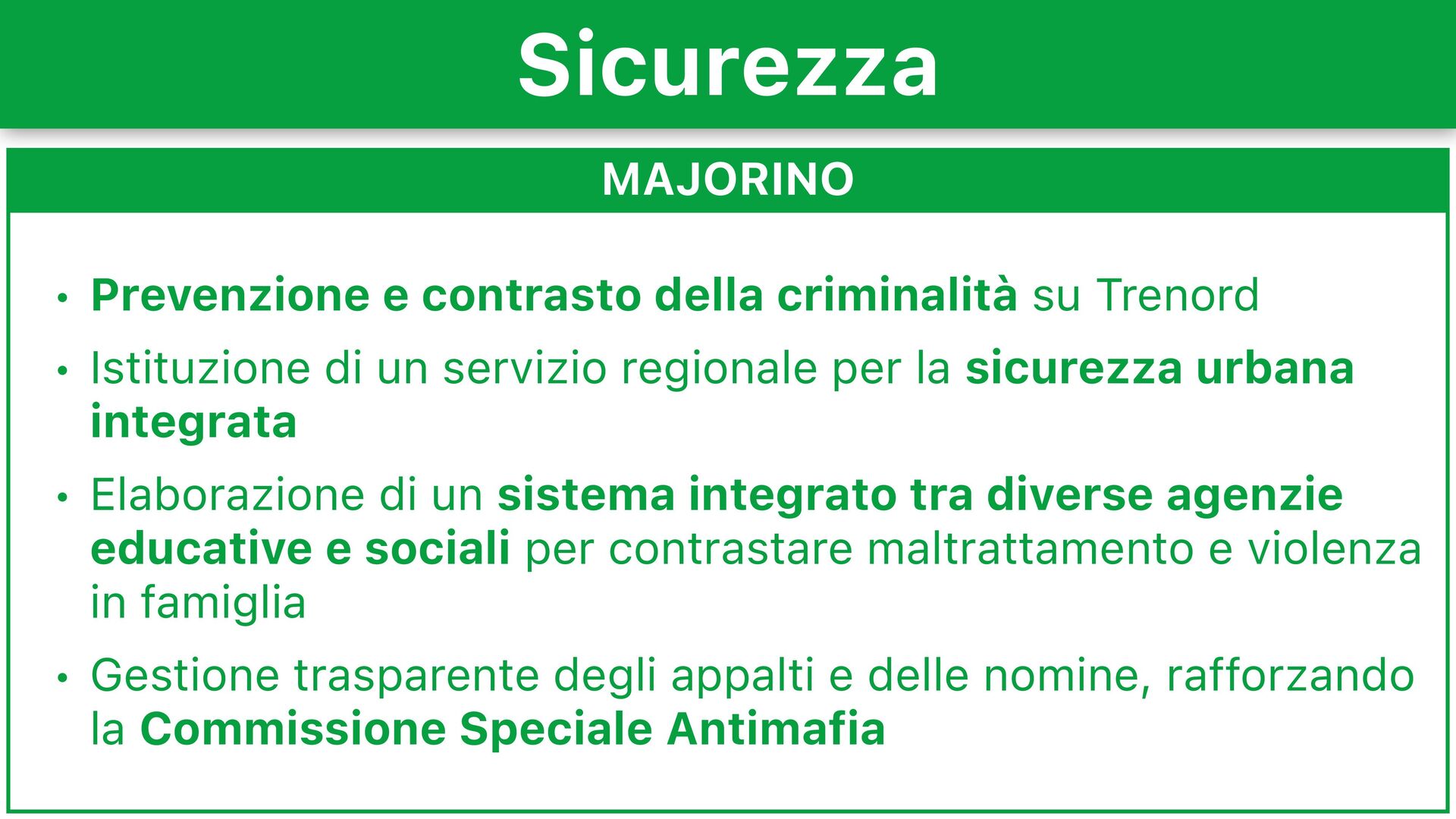 Istituzione di un servizio regionale per la sicurezza urbana integrata • Elaborazione di un sistema integrato tra diverse agenzie educative e sociali per contrastare maltrattamento e violenza in famiglia • Gestione trasparente degli appalti e delle nomine, rafforzando la Commissione Speciale Antimafia Sicurezza