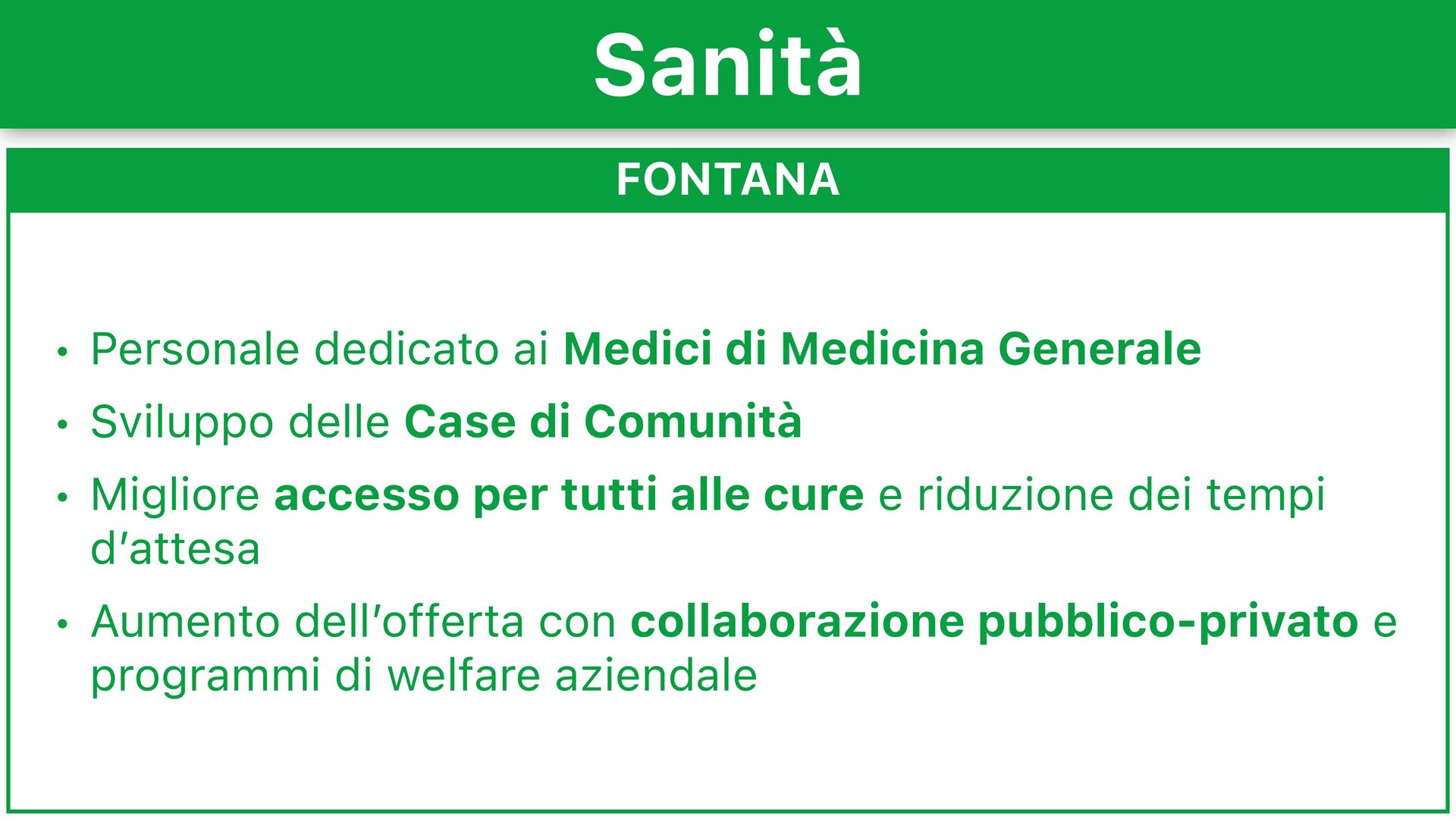 Sviluppo delle Case di Comunità • Migliore accesso per tutti alle cure e riduzione dei tempi d’attesa • Aumento dell’offerta con collaborazione pubblico-privato e programmi di welfare aziendale Sanità