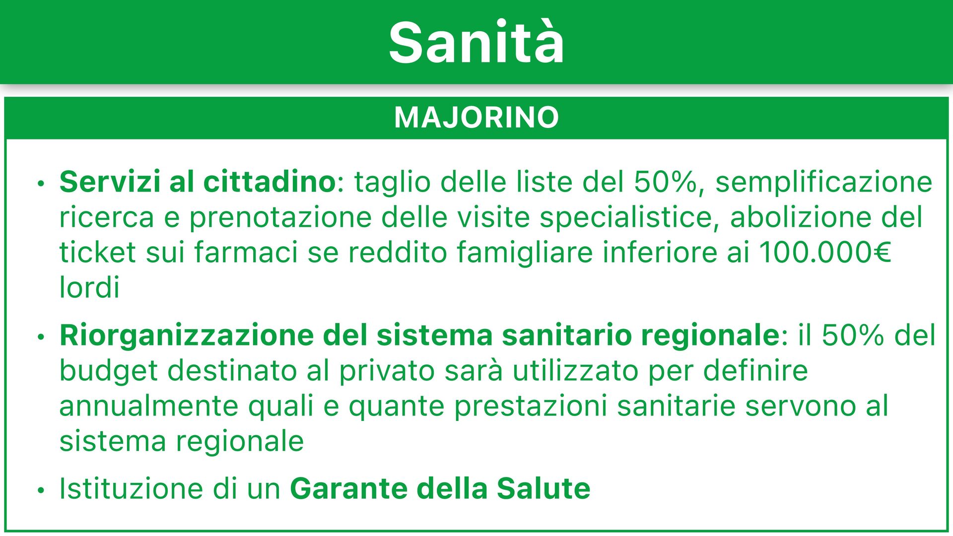 semplificazione ricerca e prenotazione delle visite specialistice, abolizione del ticket sui farmaci se reddito famigliare inferiore ai 100.000 lordi • Riorganizzazione del sistema sanitario regionale: il 50% del budget destinato al privato sarà utilizzato per definire annualmente quali e quante prestazioni sanitarie servono al sistema regionale • Istituzione di un Garante della Salute Sanità