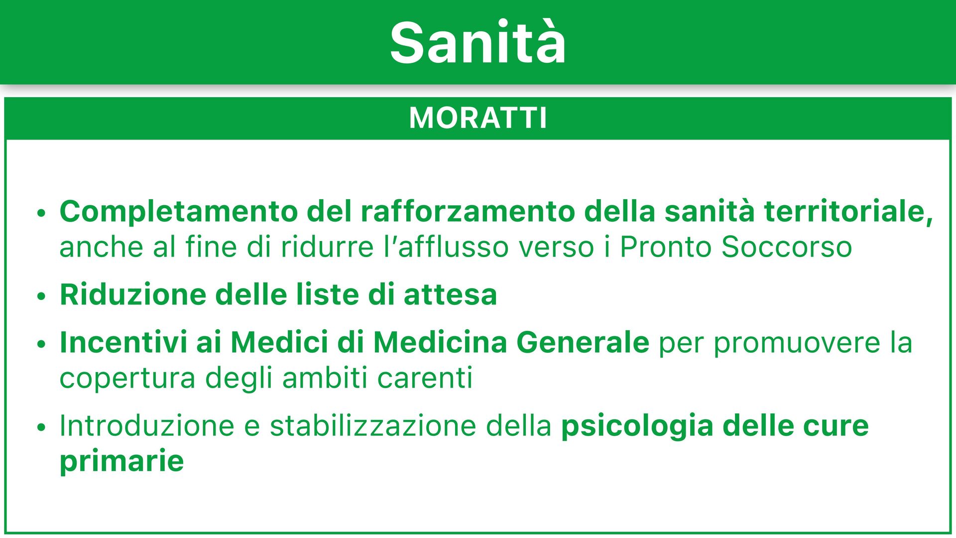 fine di ridurre l’afflusso verso i Pronto Soccorso • Riduzione delle liste di attesa • Incentivi ai Medici di Medicina Generale per promuovere la copertura degli ambiti carenti • Introduzione e stabilizzazione della psicologia delle cure primarie Sanità