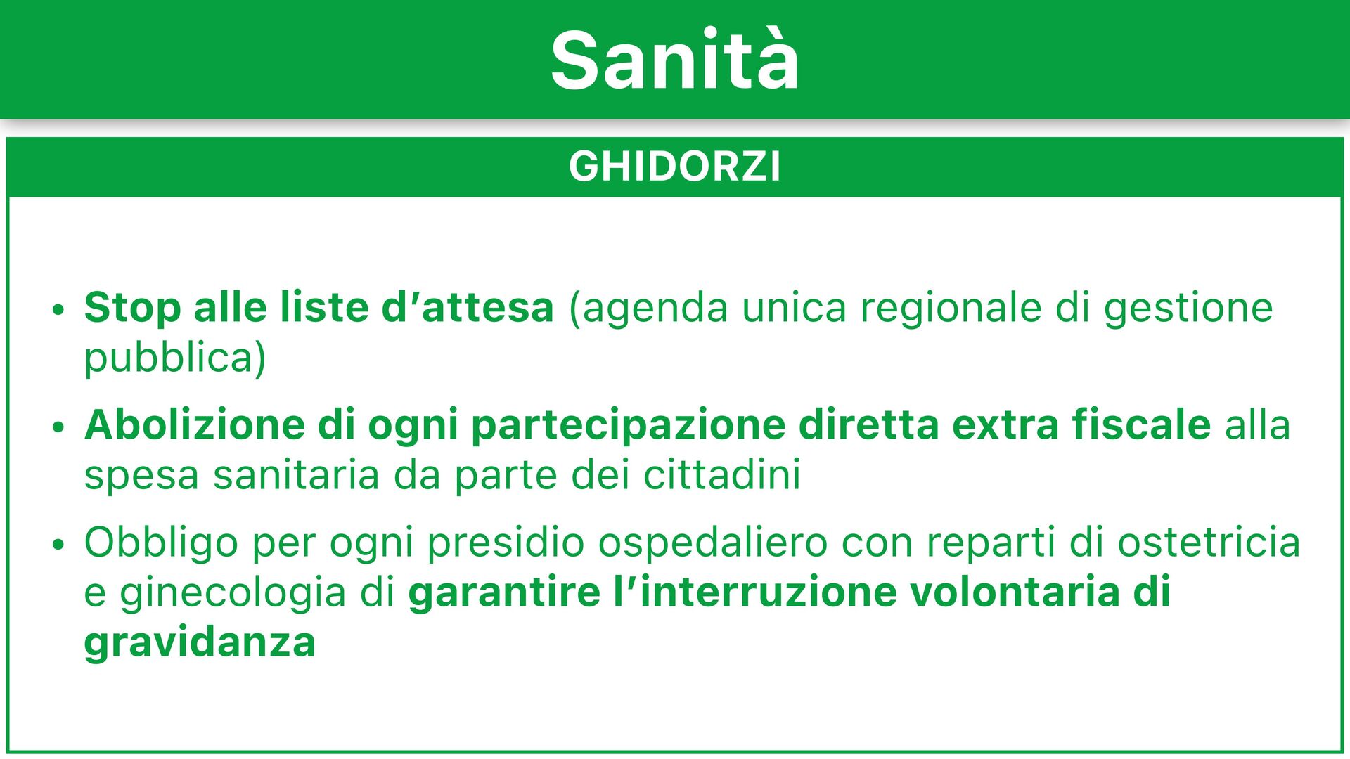 gestione pubblica) • Abolizione di ogni partecipazione diretta extra fiscale alla spesa sanitaria da parte dei cittadini • Obbligo per ogni presidio ospedaliero con reparti di ostetricia e ginecologia di garantire l’interruzione volontaria di gravidanza Sanità