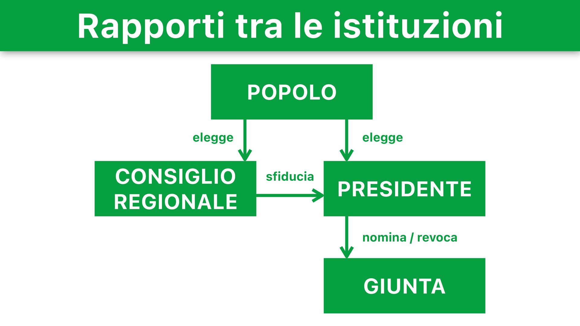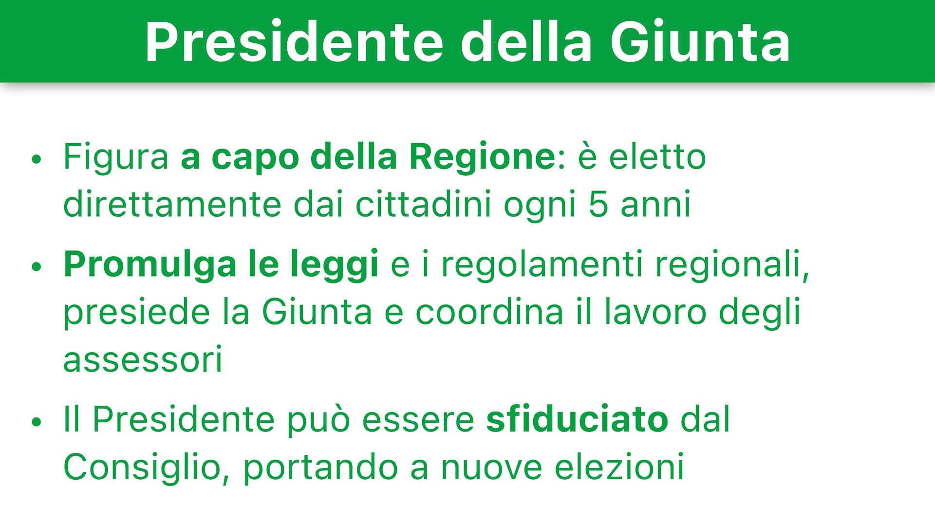 eletto direttamente dai cittadini ogni 5 anni • Promulga le leggi e i regolamenti regionali, presiede la Giunta e coordina il lavoro degli assessori • Il Presidente può essere sfiduciato dal Consiglio, portando a nuove elezioni