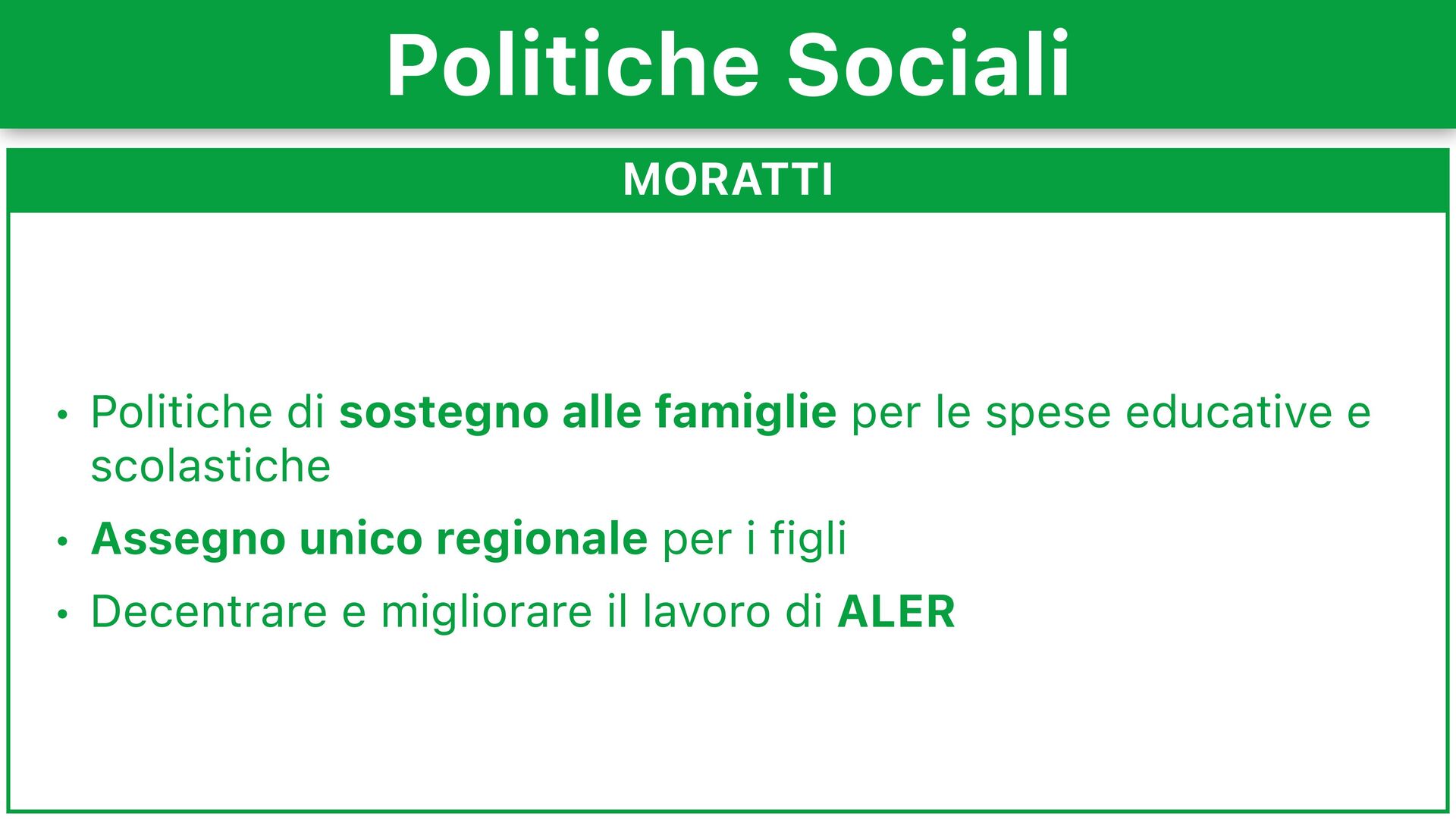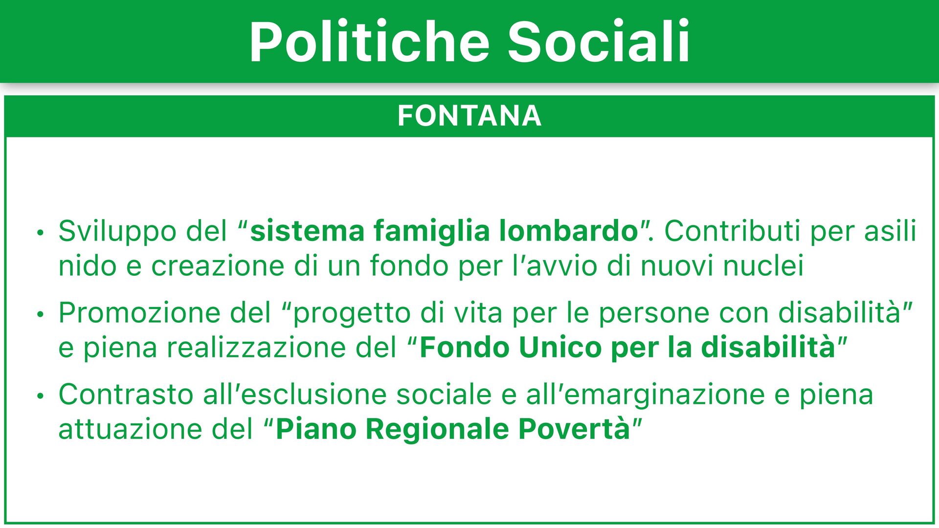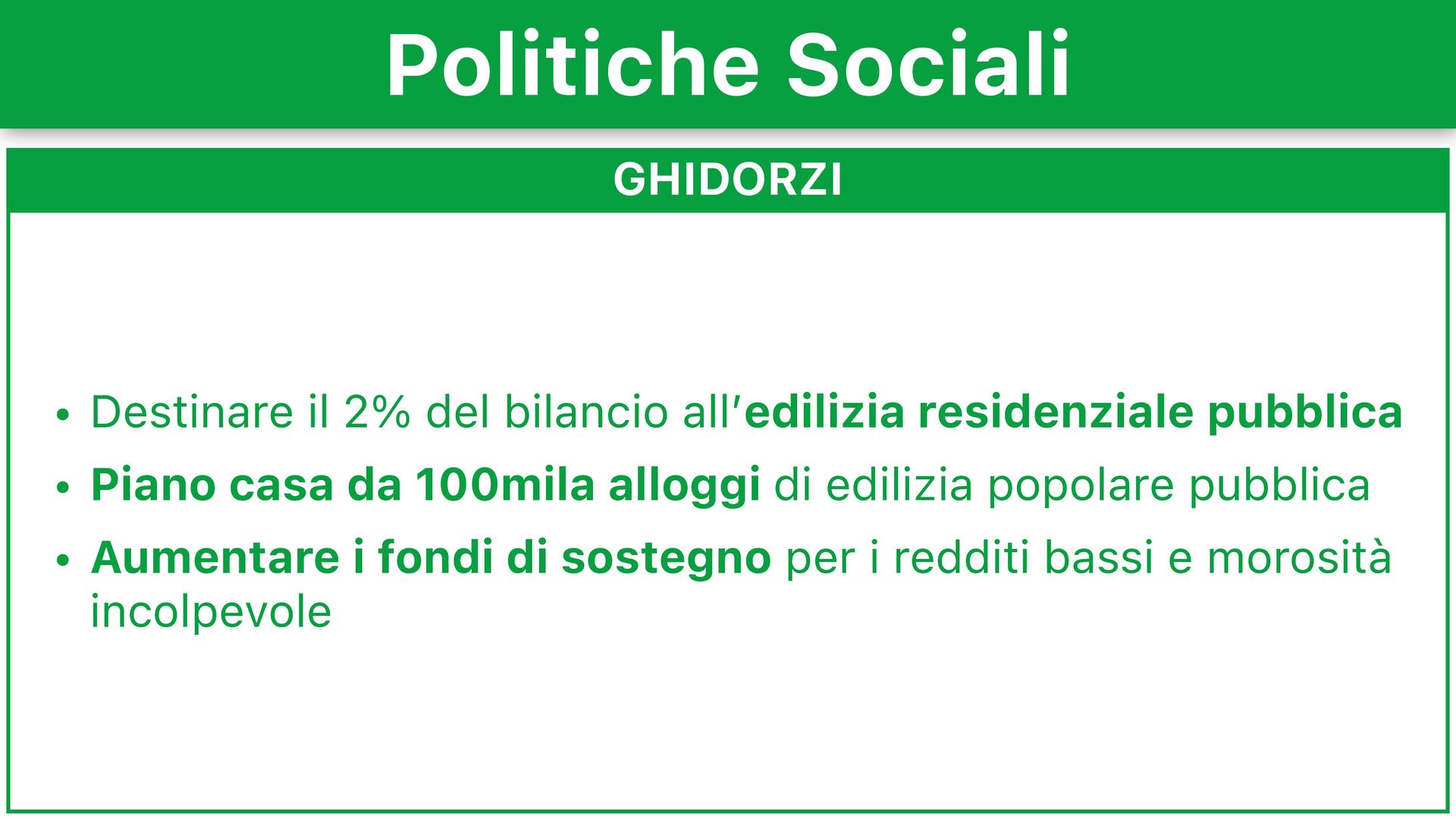 • Piano casa da 100mila alloggi di edilizia popolare pubblica • Aumentare i fondi di sostegno per i redditi bassi e morosità incolpevole Politiche Sociali